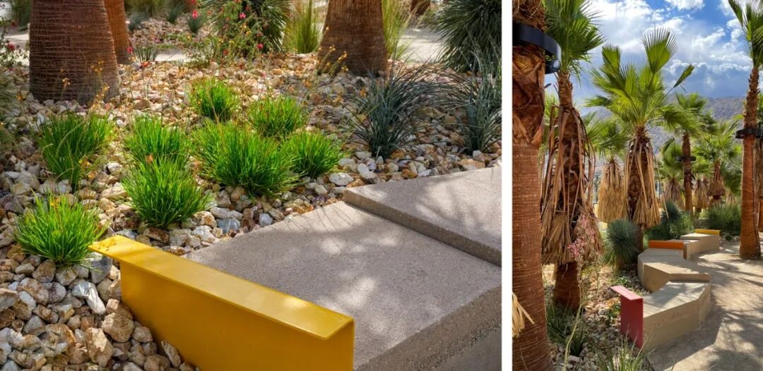 园内座椅来自预制模块化混凝土块,掺入了棕榈泉黄金石骨料,通过旋转、堆叠、组合成各种高度,层次纹理也呼应着露岩“山脉”。明亮的扶手搭配朴素的“沉积山石”,像是阳光照耀沙漠。