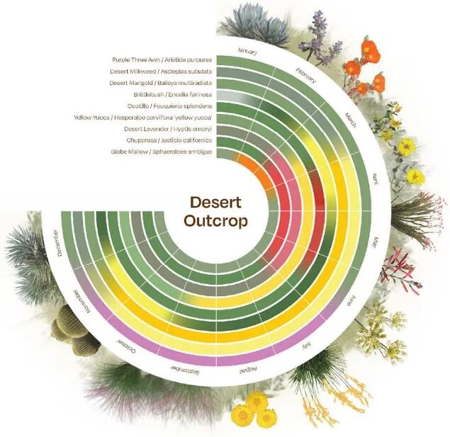 露岩周围的景观也是此处特殊地貌的缩影。用于铺地的“棕榈泉黄金石”来自10英里外的采石场,色彩斑斓的细石里生长着硬朗尖细的灌木,仿佛一个迷你沙漠,与隔壁“山脉”相映成趣。