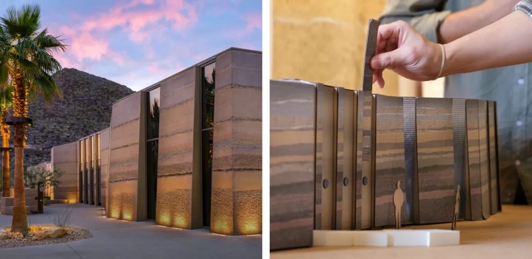 为了更深入地了解棕榈泉地貌景观,RIOS设计团队曾徒步穿越圣哈辛托山脉的塔基茨峡谷,近距离观察了它绚丽的岩石“皮肤”。旅程结束后,为模拟这历经千万年才形成的地貌,设计师通过“沉积”的处理手段,将此地质特征抽象为露岩的染色混凝土墙体 ——从底部为略带红色和褶皱的砂岩,到顶部光滑的花岗岩,层次清晰,脉络分明。