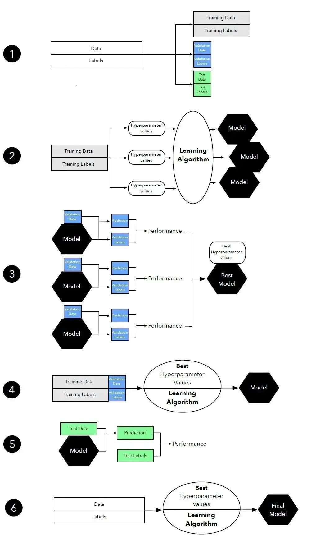 我们想确定手头最适合待解决问题的机器学习算法。因此,我们想对比不同的算法,选出性能最好的一个;或从算法的假设空间中选出性能最好的模型。