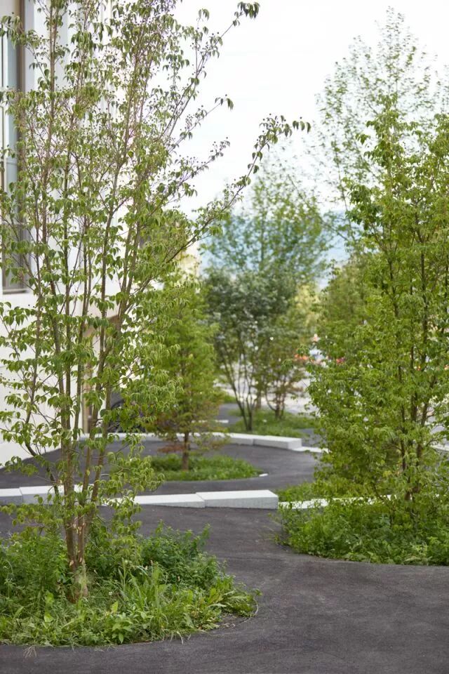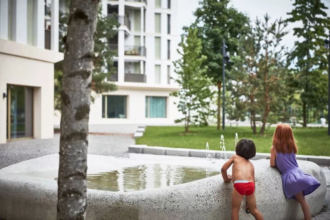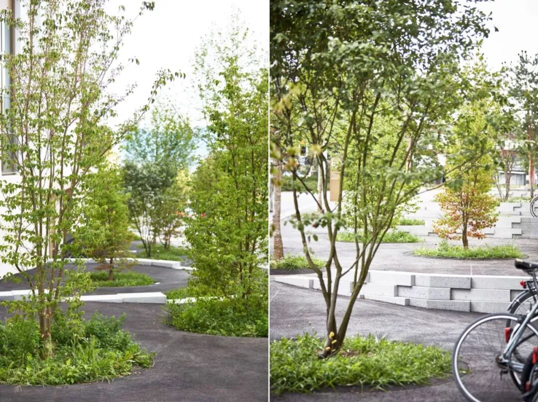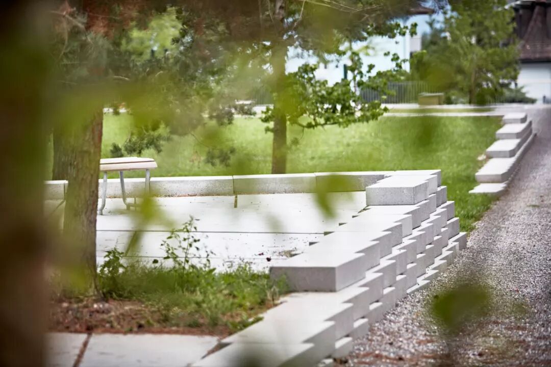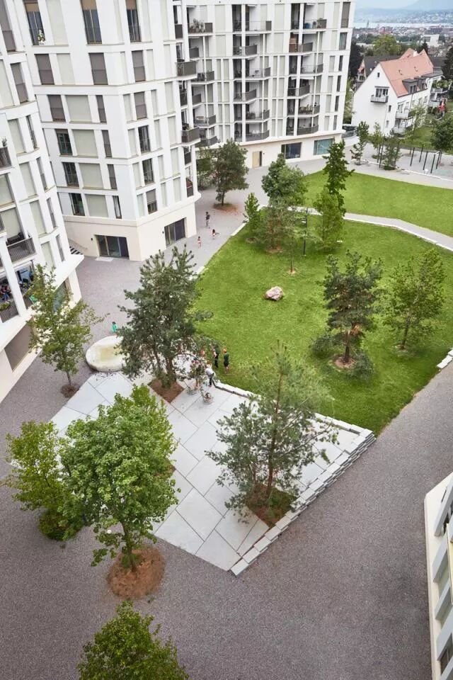 大规模的设计将这个八层建筑与城市环境之间进行了很好的调解,在社区中间形成了风景如画的小树林。社区设计延续了20世纪70年代Bucheggplatz的标志性特征。为了解决底层场地并将其激活为社交,振奋人心的地方,设计师选择了更贴心的规模。较小的开花树木与地形墙一起融入设计之中。