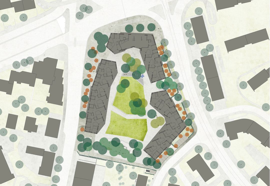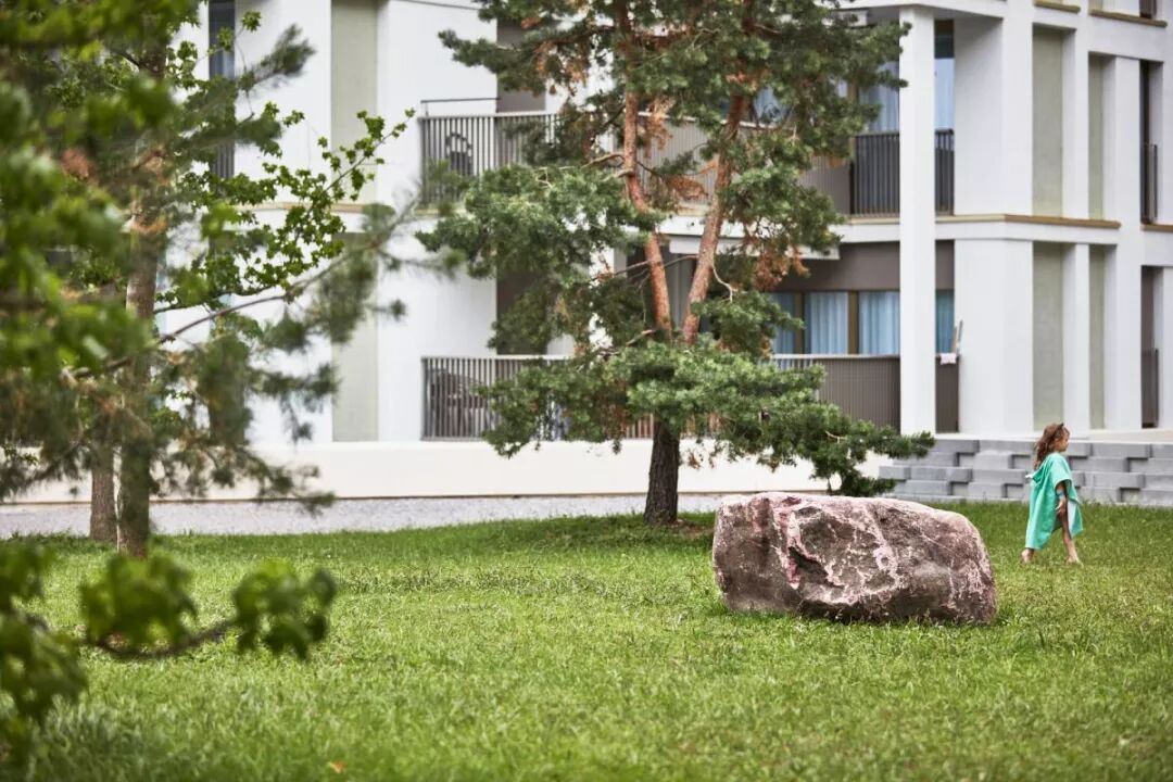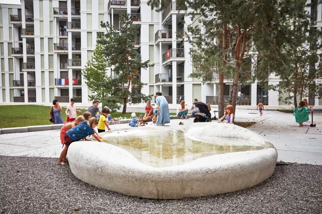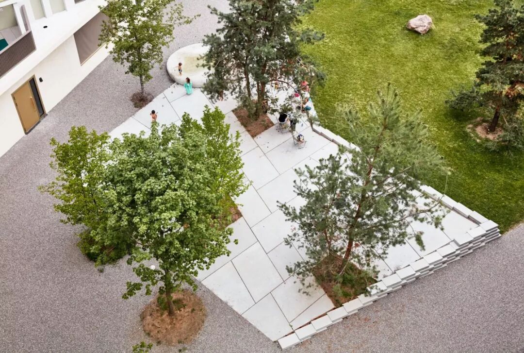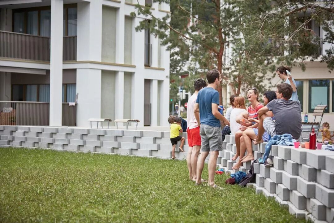 大规模的设计将这个八层建筑与城市环境之间进行了很好的调解,在社区中间形成了风景如画的小树林。社区设计延续了20世纪70年代Bucheggplatz的标志性特征。为了解决底层场地并将其激活为社交,振奋人心的地方,设计师选择了更贴心的规模。较小的开花树木与地形墙一起融入设计之中。