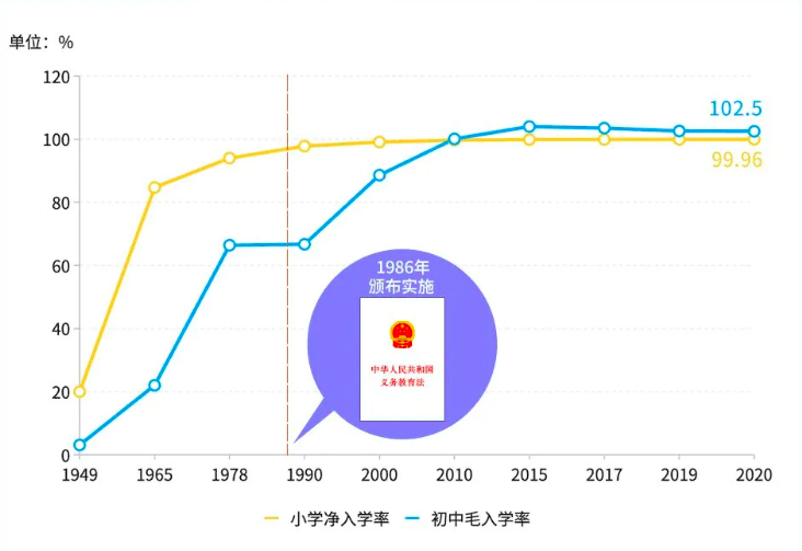▲ 建国以来我国义务教育阶段入学率统计图 图源:中国教育在线(编者注:毛入学率指在校学生总数与相应学龄组人口数之比,净入学率指适龄在校学生数与相应学龄组人口数之比。)