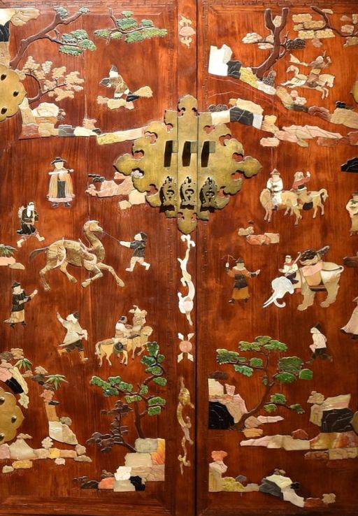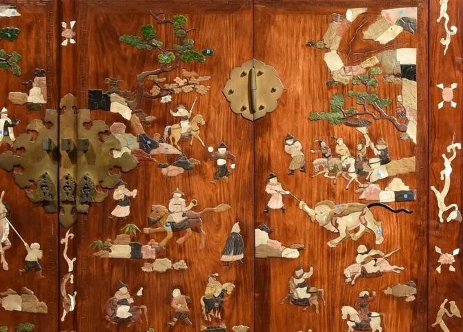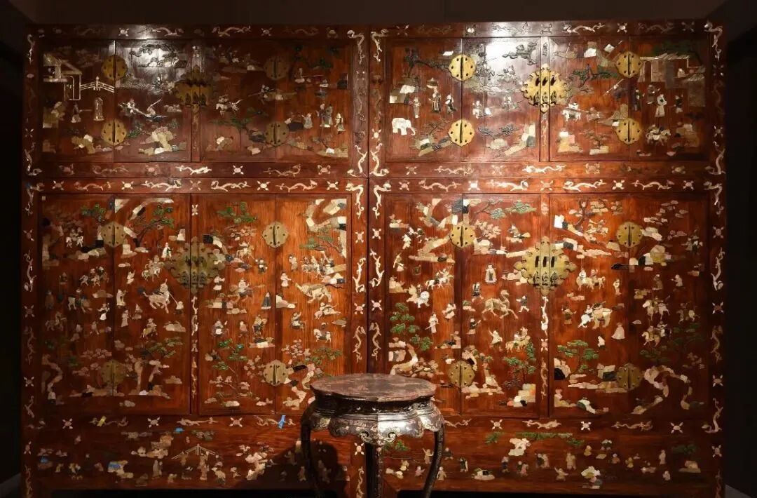 第二,体现在家具的修复方面。例如黄花梨百宝嵌人物图顶箱柜一对,一件修复完毕,一件尚在修复状态,能够向观众普及科学修复知识。