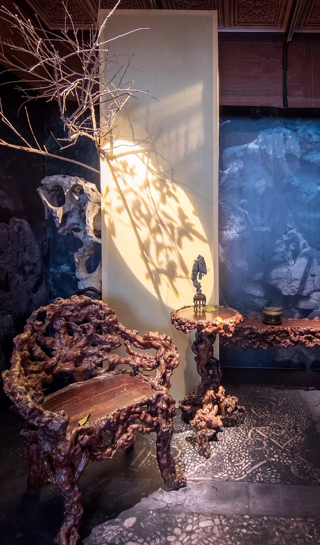 例如原来陈列在乾隆花园的天然木椅子和乾隆是一是二图的场景复原做的效果非常好。
