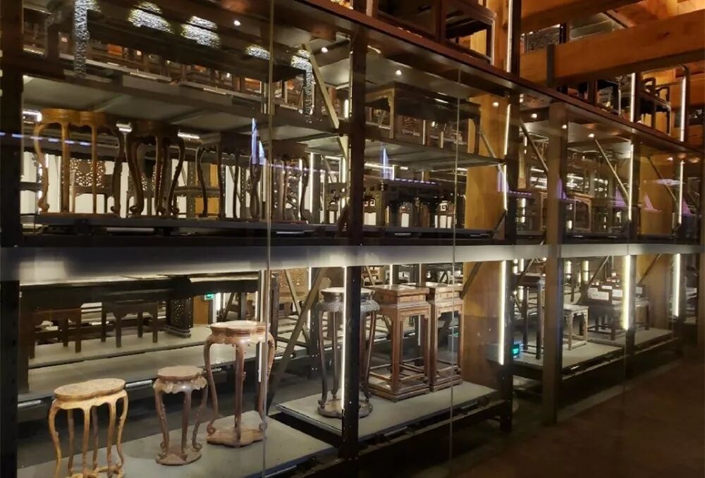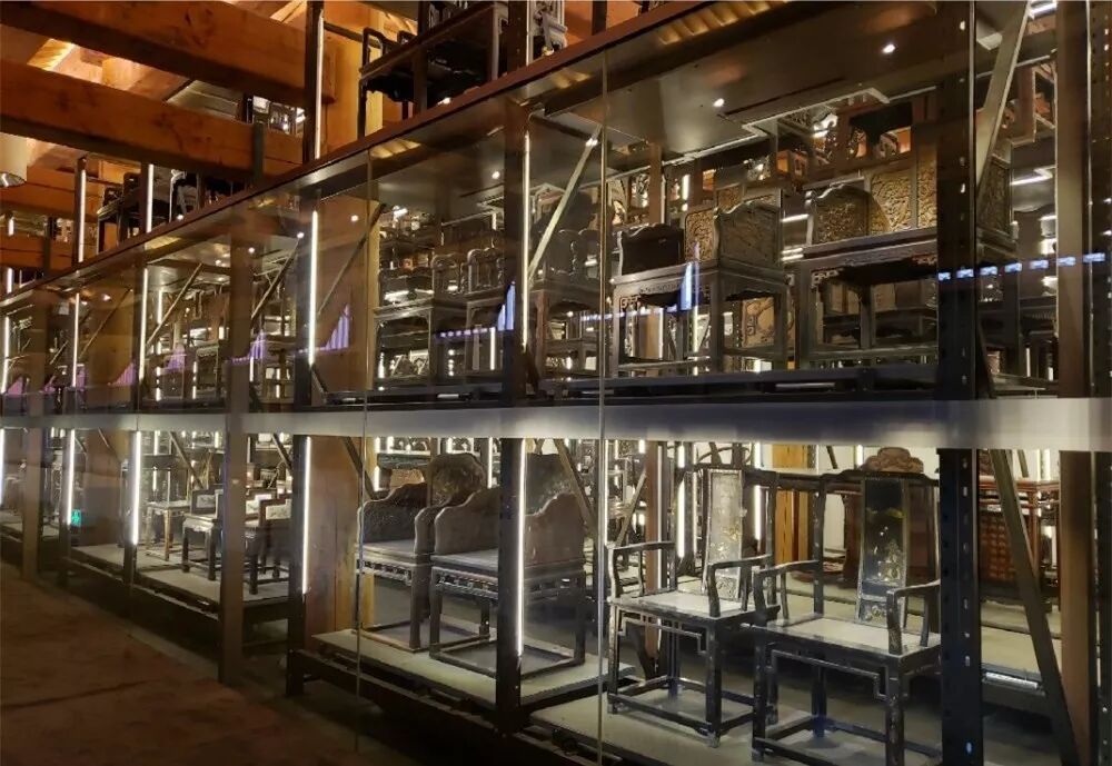 第三,仓储式陈列。将初步研究、归类的家具排布在数排三层密集架上,用最少的空间展示了更多的文物。