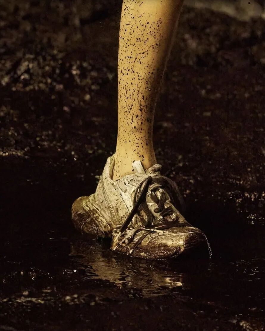 秀场被放在大泥坑里,模特们一个个凶神恶煞、穿着镶钻的鞋和丝缎趟水踩泥,每个“刚从大润发下班的杀鱼师傅”都满脸写着不开心。时尚博主AHALOLO形容Demna很好地展现了当下大家的生活状态:“泥沙俱下、泥足深陷”。