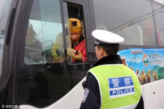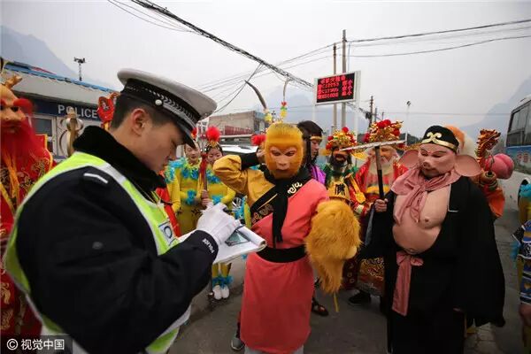 原来,他们都是庙会演员,正准备下乡去演西游记,没想到刚出门上路就被交警拿下。