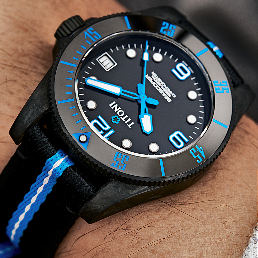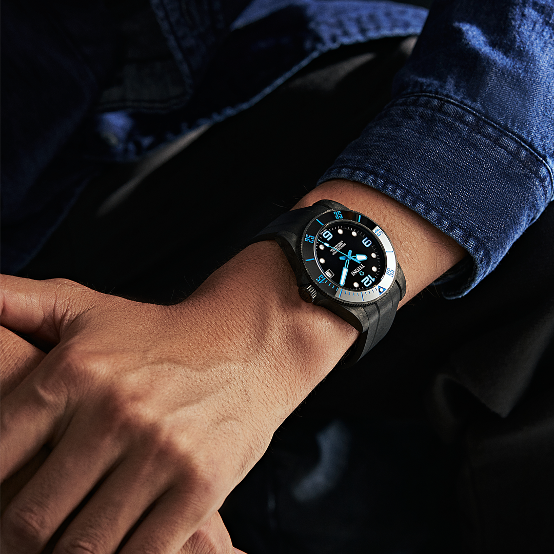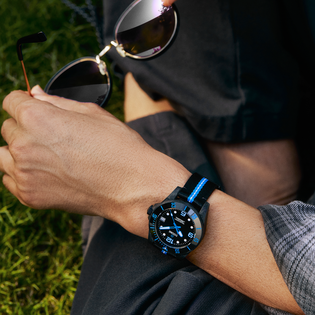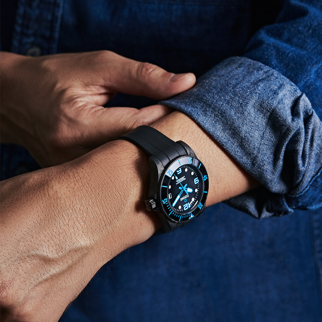表底盖采用镀黑处理的钛金属材质,既保证潜水表的坚固耐用,又保持了碳纤维材料所奠定的轻量化特征,腕表整体足够轻盈,重量几乎只有钢款三分之一,与钢款是两种截然相反的佩戴感。