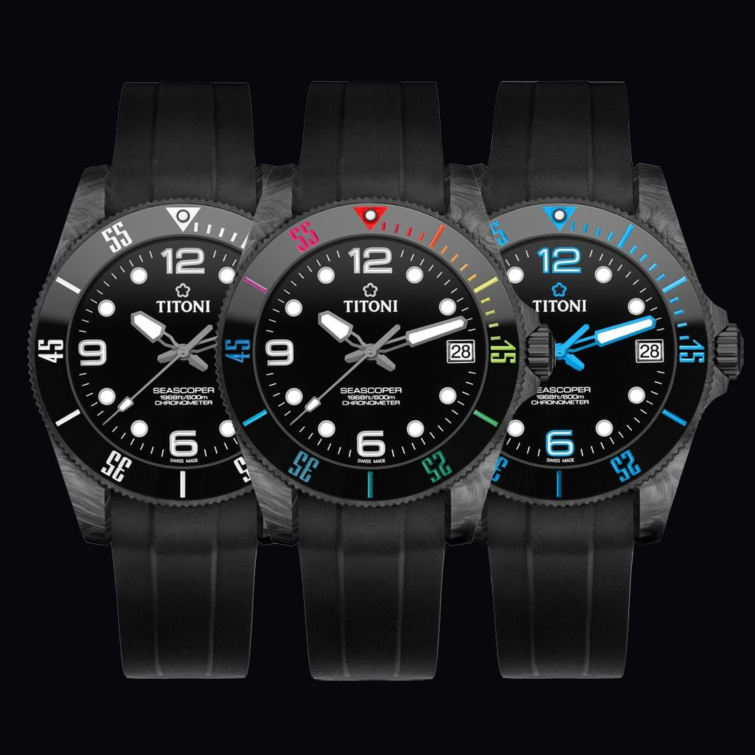 梅花表此次一共推出了三枚不同配色的碳纤维 Seascoper 600 潜水表,蓝色款式之外,还有一枚白色款和一枚“彩虹”款。