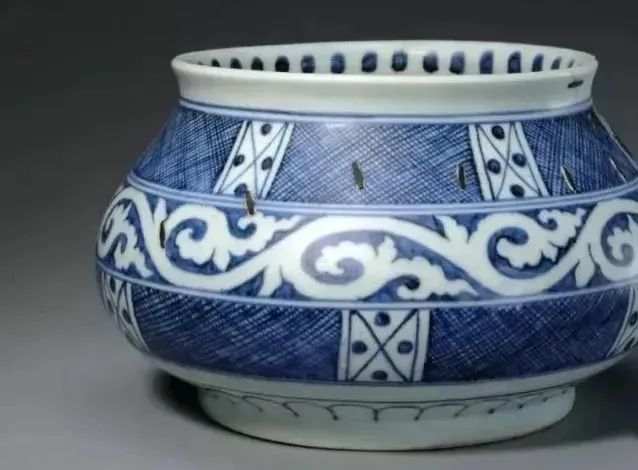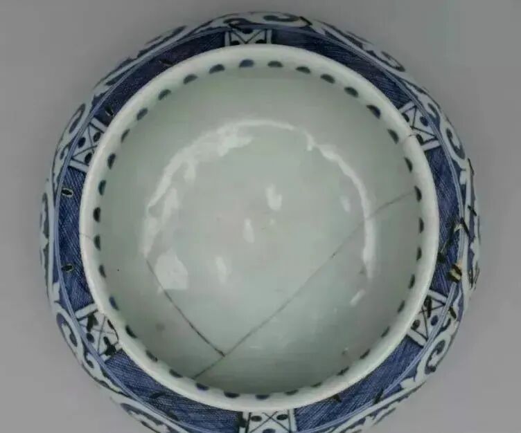 明宣德款青花网文钵,锔瓷