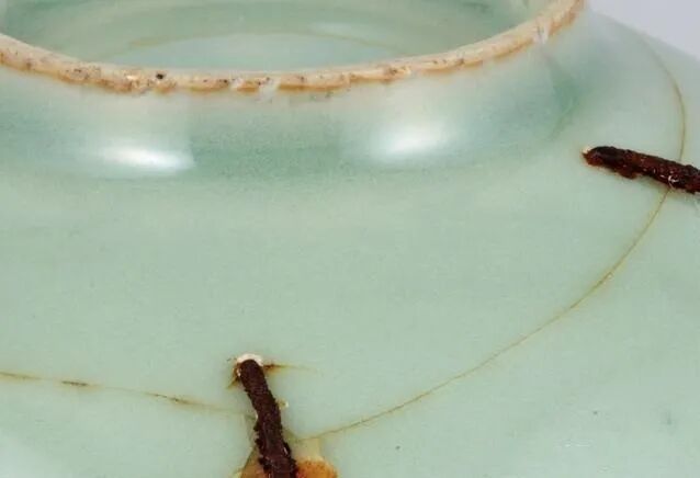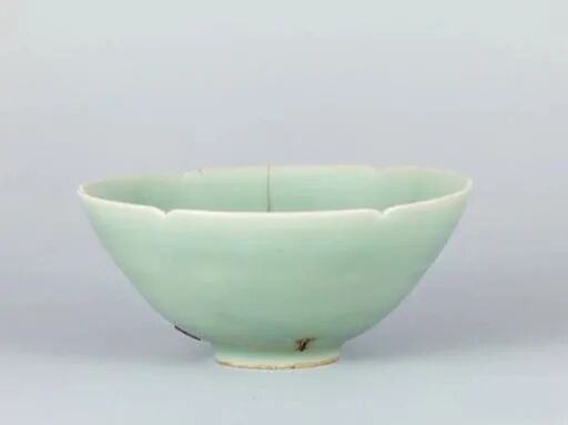 本身是一只南宋龙泉窑梅子青六瓣花形茶碗,但其身世却不平凡。