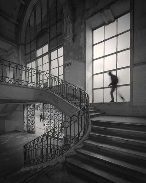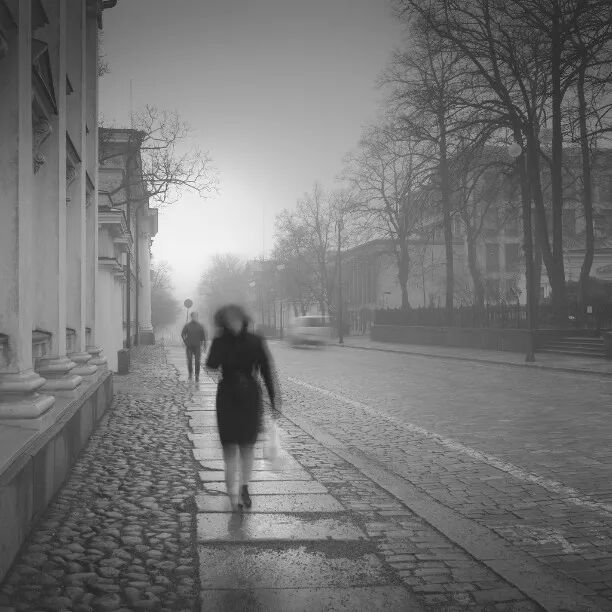 他的城市街道照片中,常常会出现一个小人,甚至是一个长曝光形成的模糊人影,让照片充满了空间感和时间性。