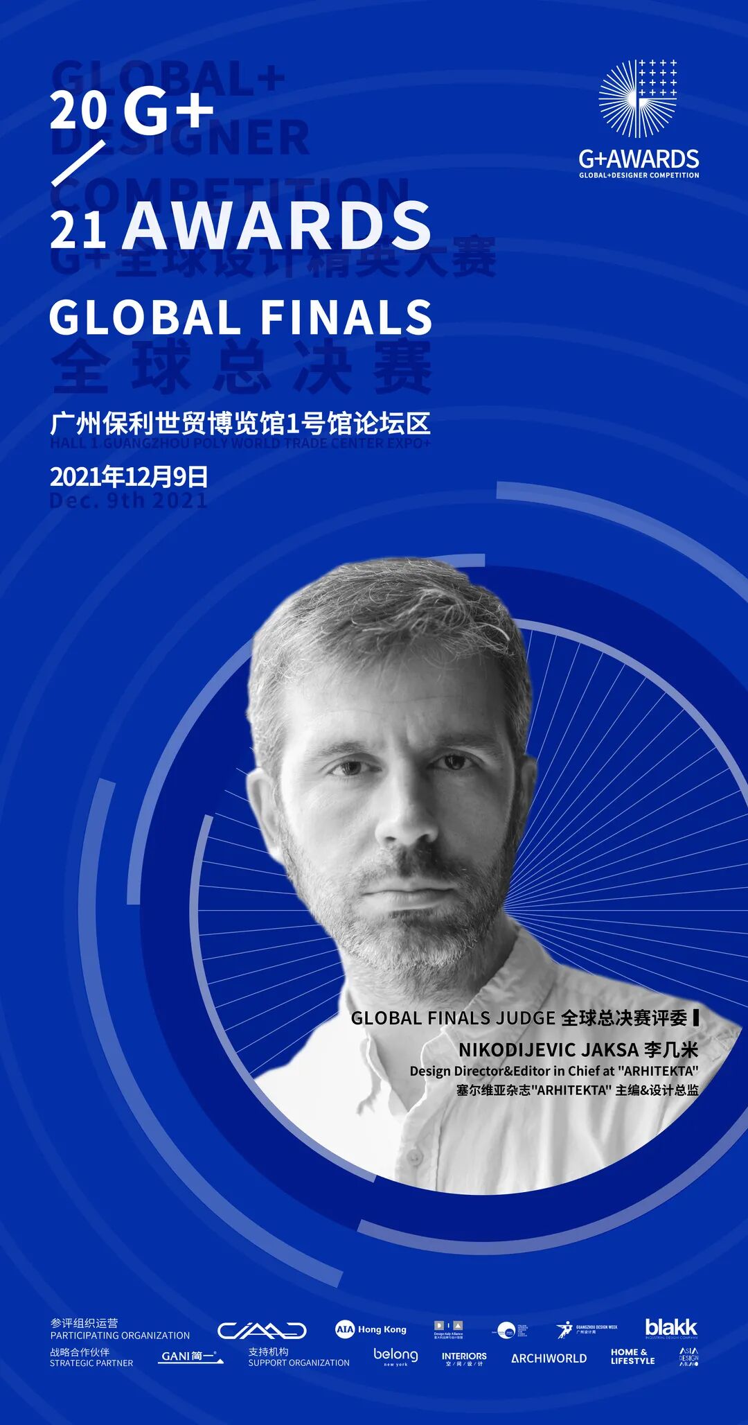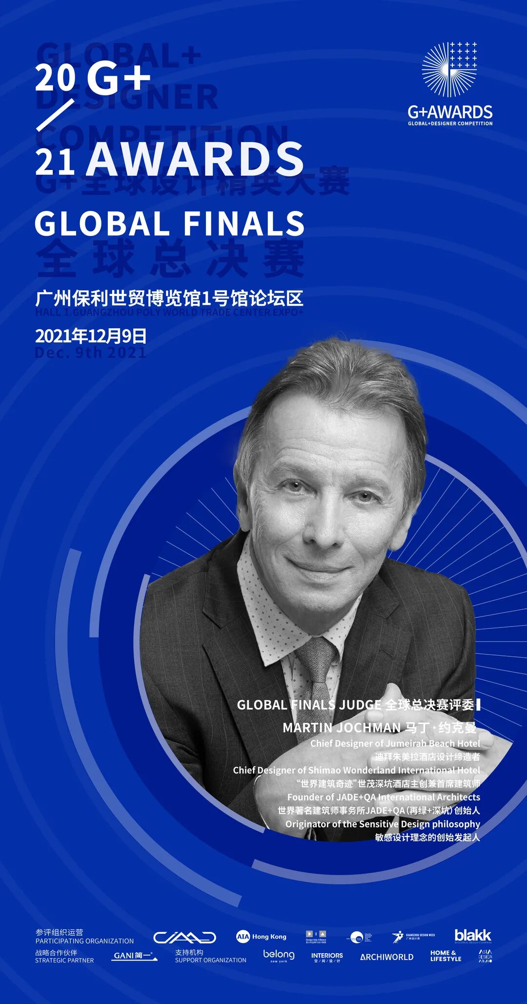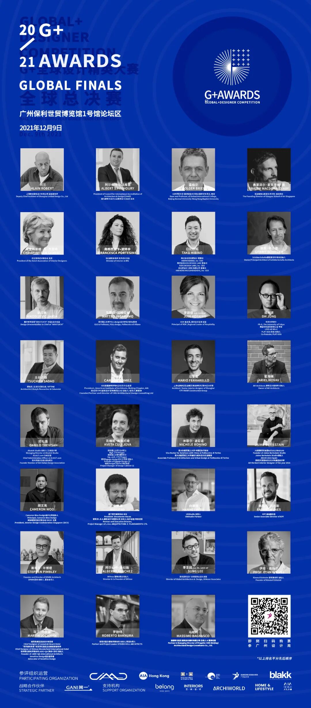 2021G+AWARDS全球总决赛评审委员会,由来自意大利、阿联酋、英国、法国、加拿大、荷兰、捷克、以色列、西班牙、新加坡等全球17个不同国家,共30+位设计大咖组成:Alain Robert, Holger Briel, Nikodijevic Jaksa, DH JUNG, Carlos Gomez, Mario Ferrarello, Ariel Hovav, Alberto Sanchez, Danilo Trevisan , Roberto Bannura, Rui Leao, Massimo Bagnasco, Martin Jochman, Fausto Nunes等,共同票选2021G+AWARDS全球冠军。