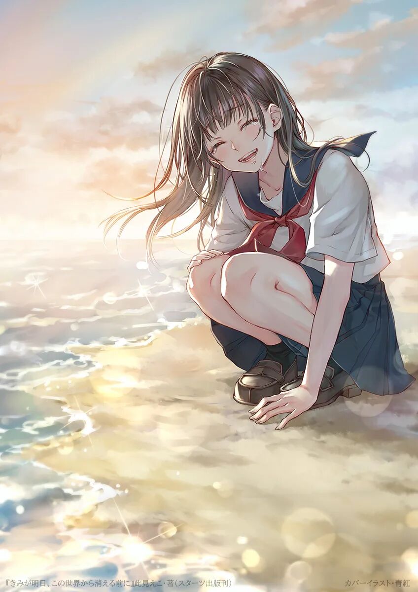 在日落时分,少女在沙滩上的笑容是如此的灿烂,jk制服配日落真的是太绝了!