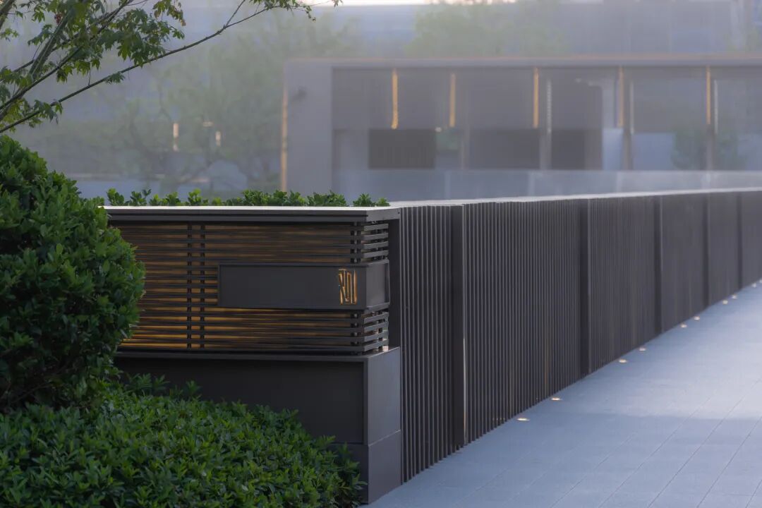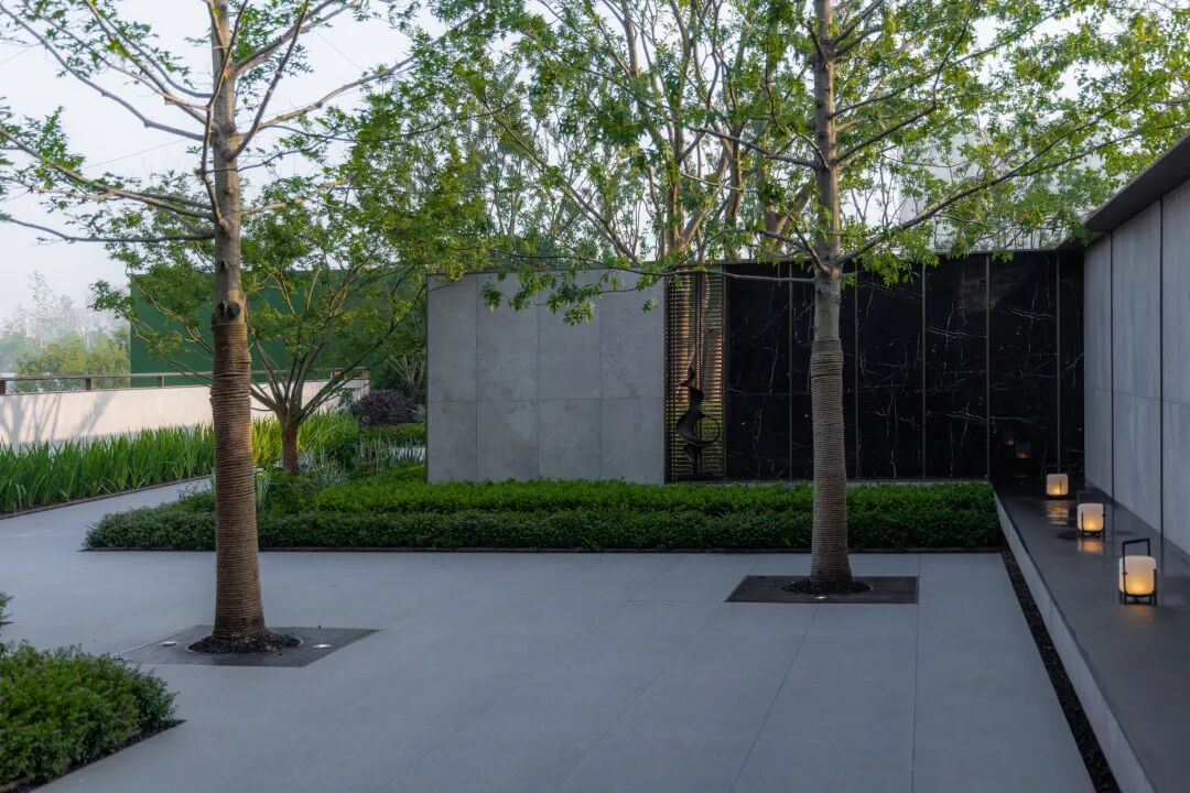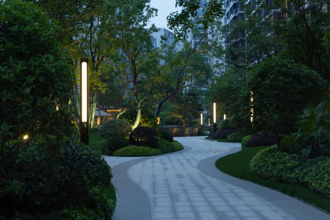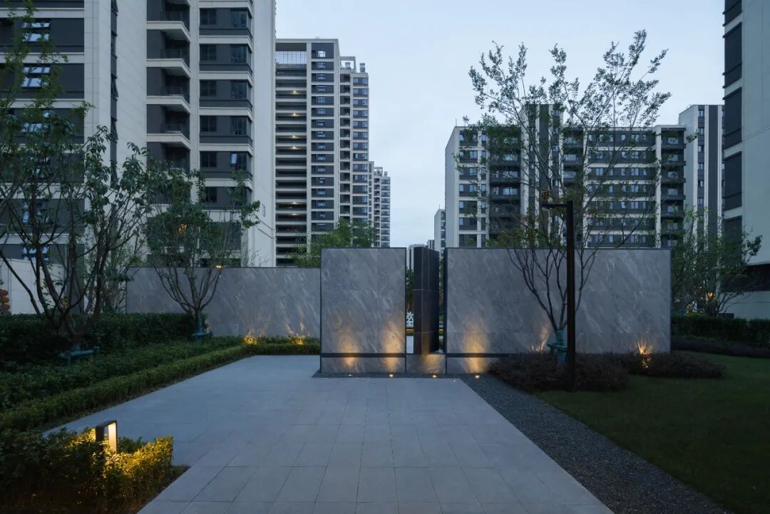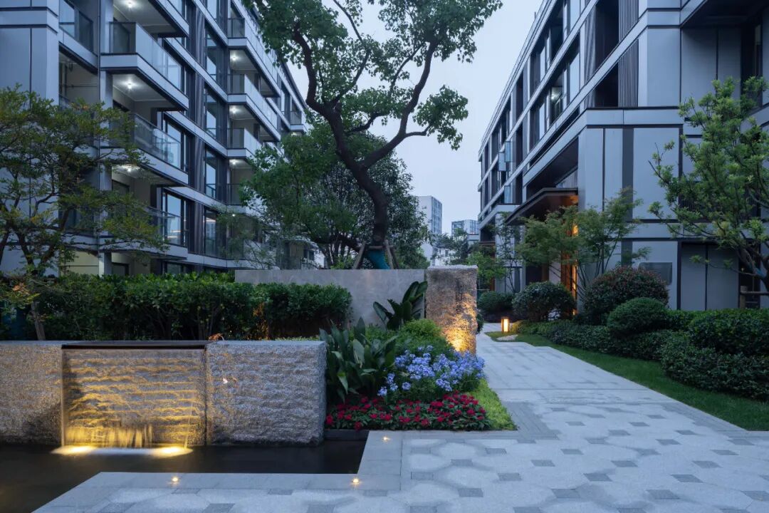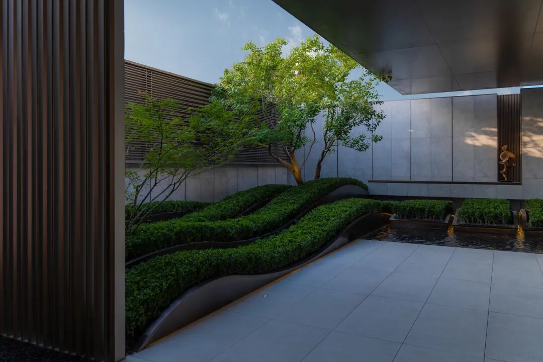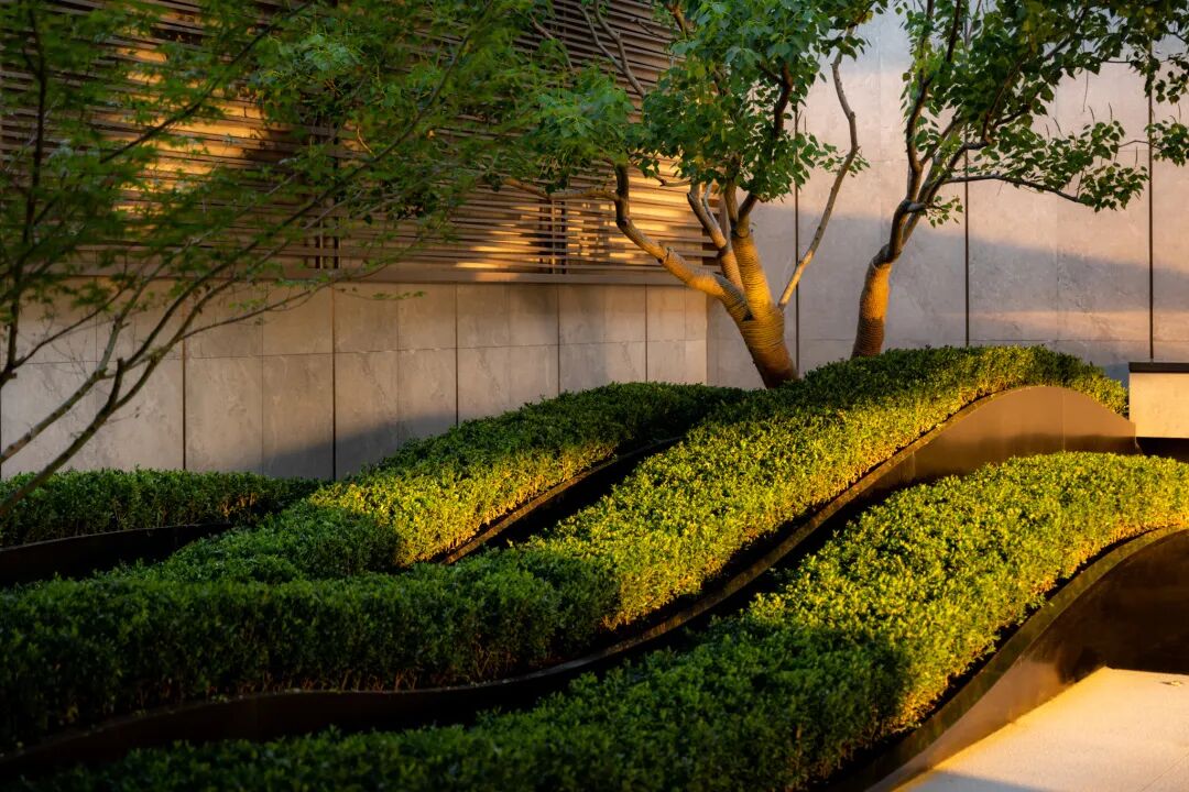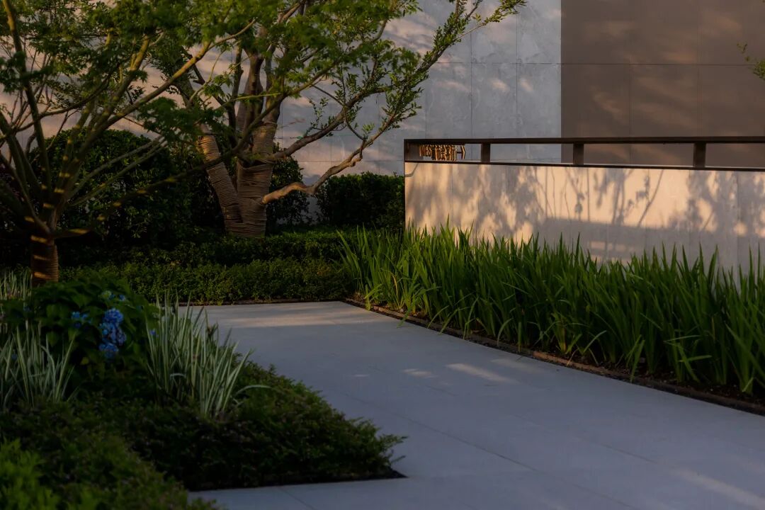 空间的转换是情绪的铺陈,收放之间,尽显品质。步入后场,空间再次被打开。波浪形绿篱仿佛有韵律地流动着。材质与线型的使用延续前场的风格,创造出富有品质感的宜居环境。草木之间,条石组成蜿蜒曲折的溪流,营造出自然的韵律感,构成富有趣味性的景观小品。置身其中,晨光洒下,人们仿佛身处小溪之畔,宁谧与闲适充盈于方寸之间。在此,访客不经意间获得了闲适怡然的归家体验,静谧的自然之境让人忘记外界的嘈杂。以岸为居,以诗为境。遥看城市灯火阑珊,此处独好。