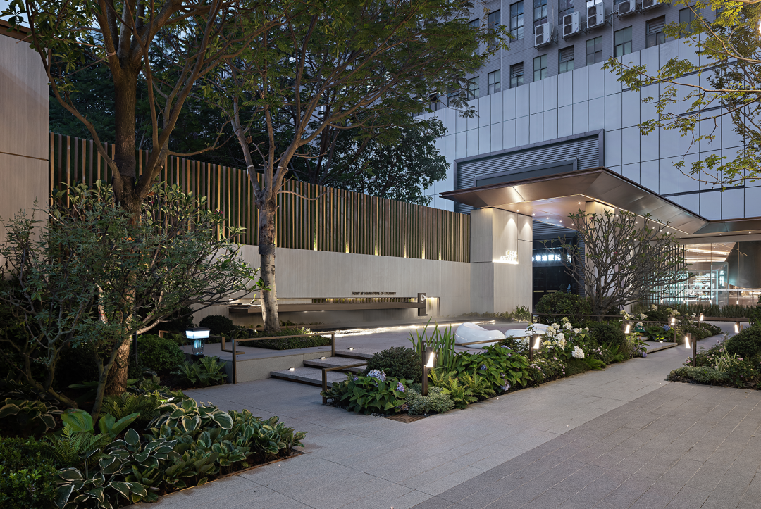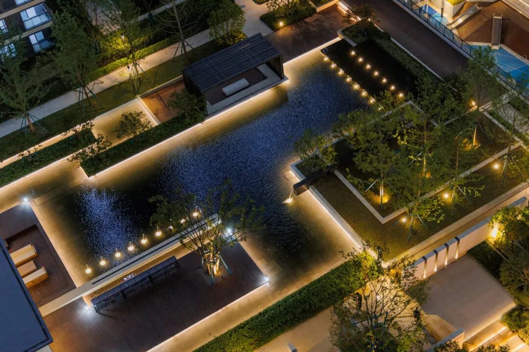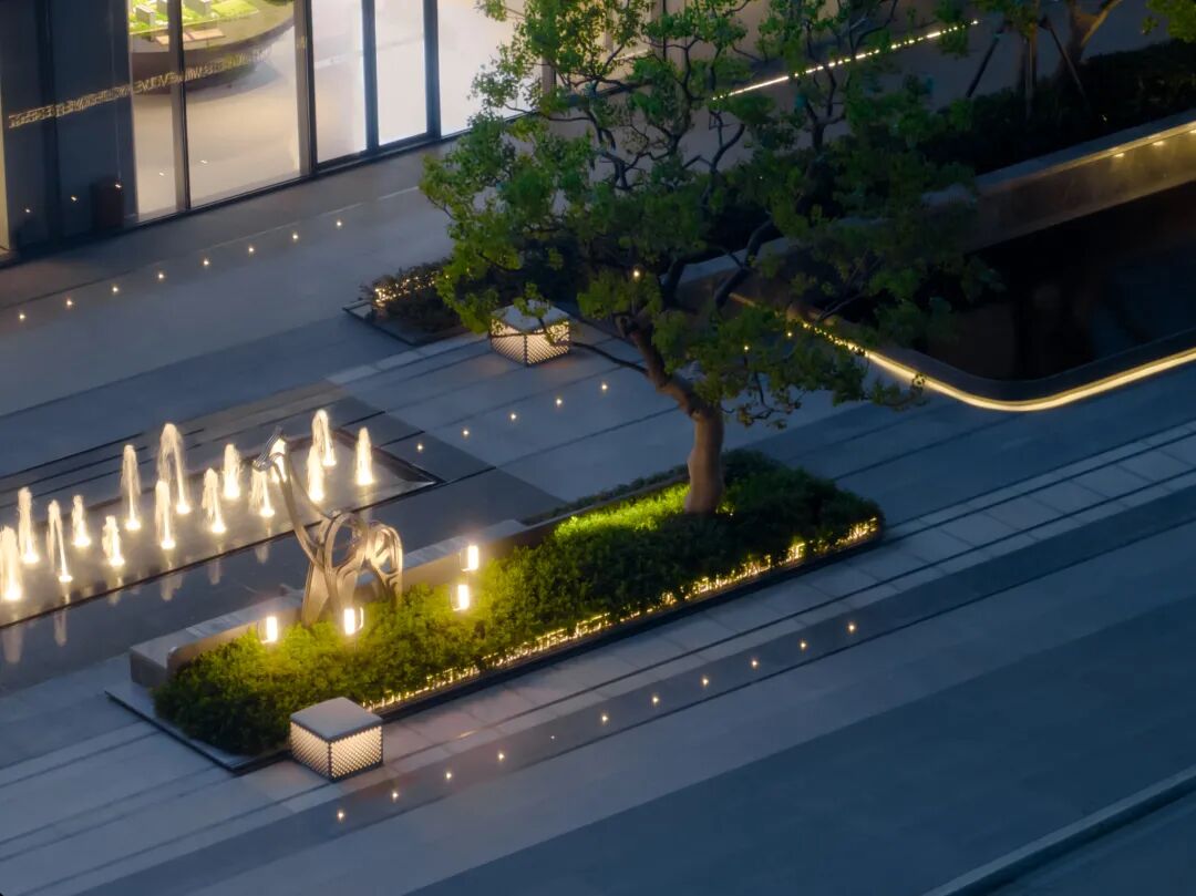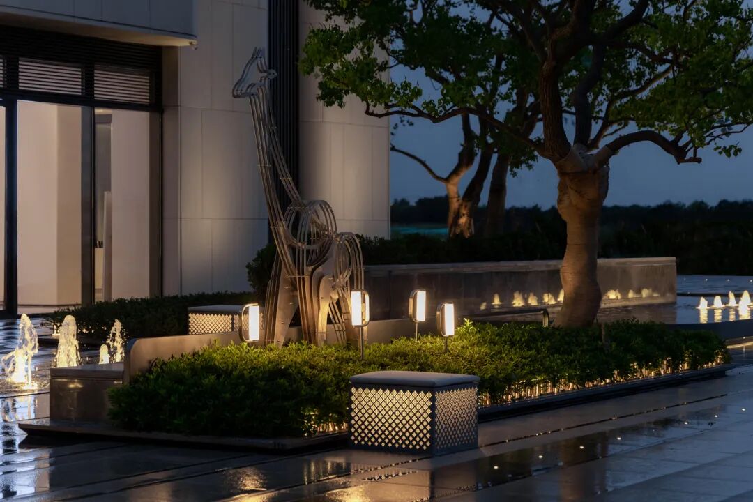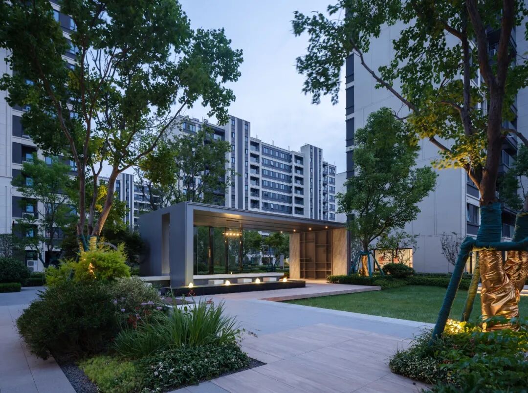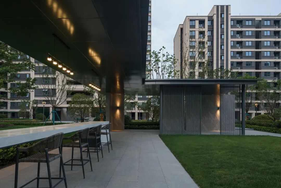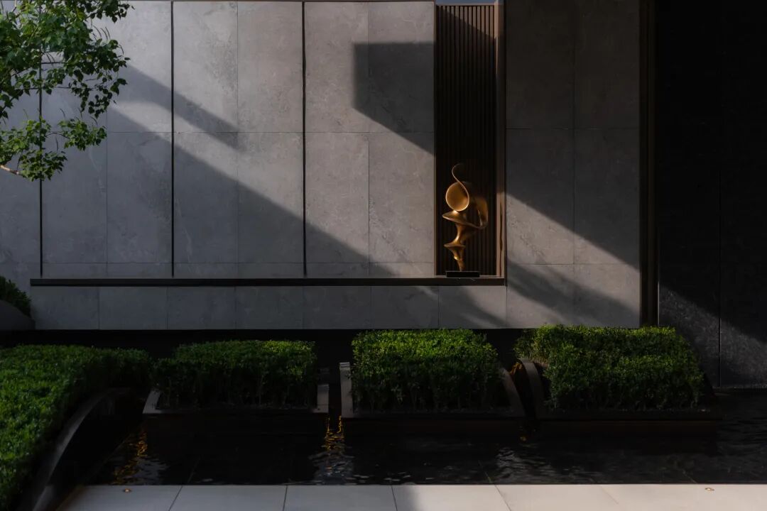 空间的转换是情绪的铺陈,收放之间,尽显品质。步入后场,空间再次被打开。波浪形绿篱仿佛有韵律地流动着。材质与线型的使用延续前场的风格,创造出富有品质感的宜居环境。草木之间,条石组成蜿蜒曲折的溪流,营造出自然的韵律感,构成富有趣味性的景观小品。置身其中,晨光洒下,人们仿佛身处小溪之畔,宁谧与闲适充盈于方寸之间。在此,访客不经意间获得了闲适怡然的归家体验,静谧的自然之境让人忘记外界的嘈杂。以岸为居,以诗为境。遥看城市灯火阑珊,此处独好。