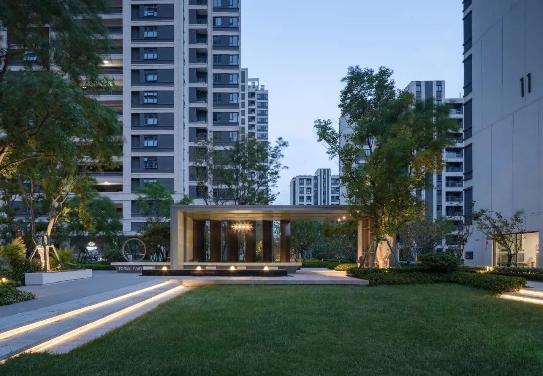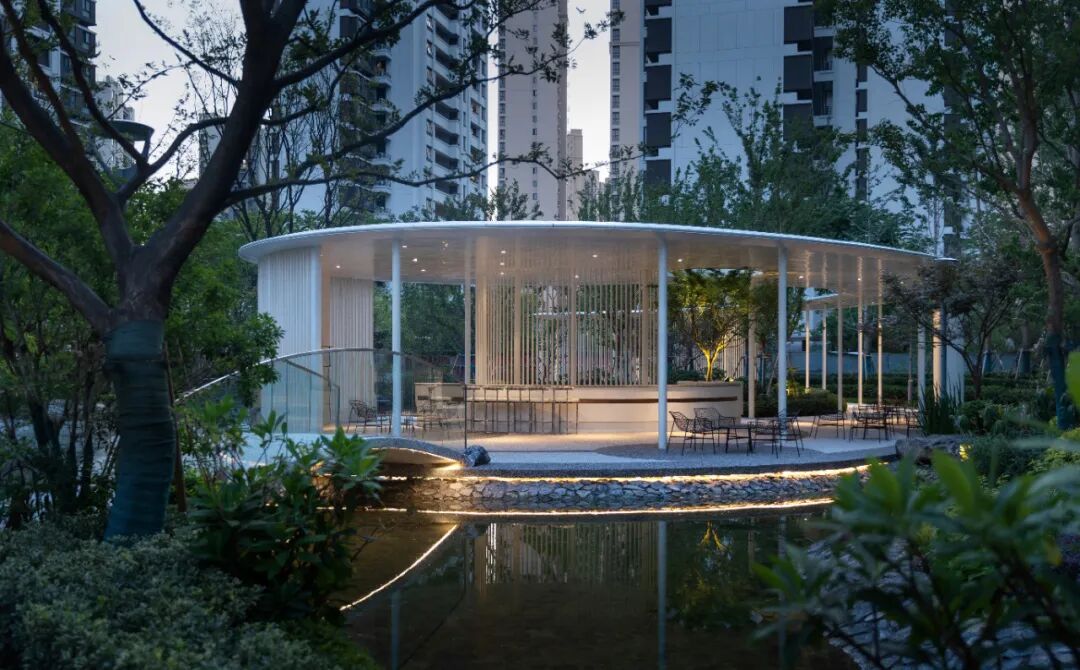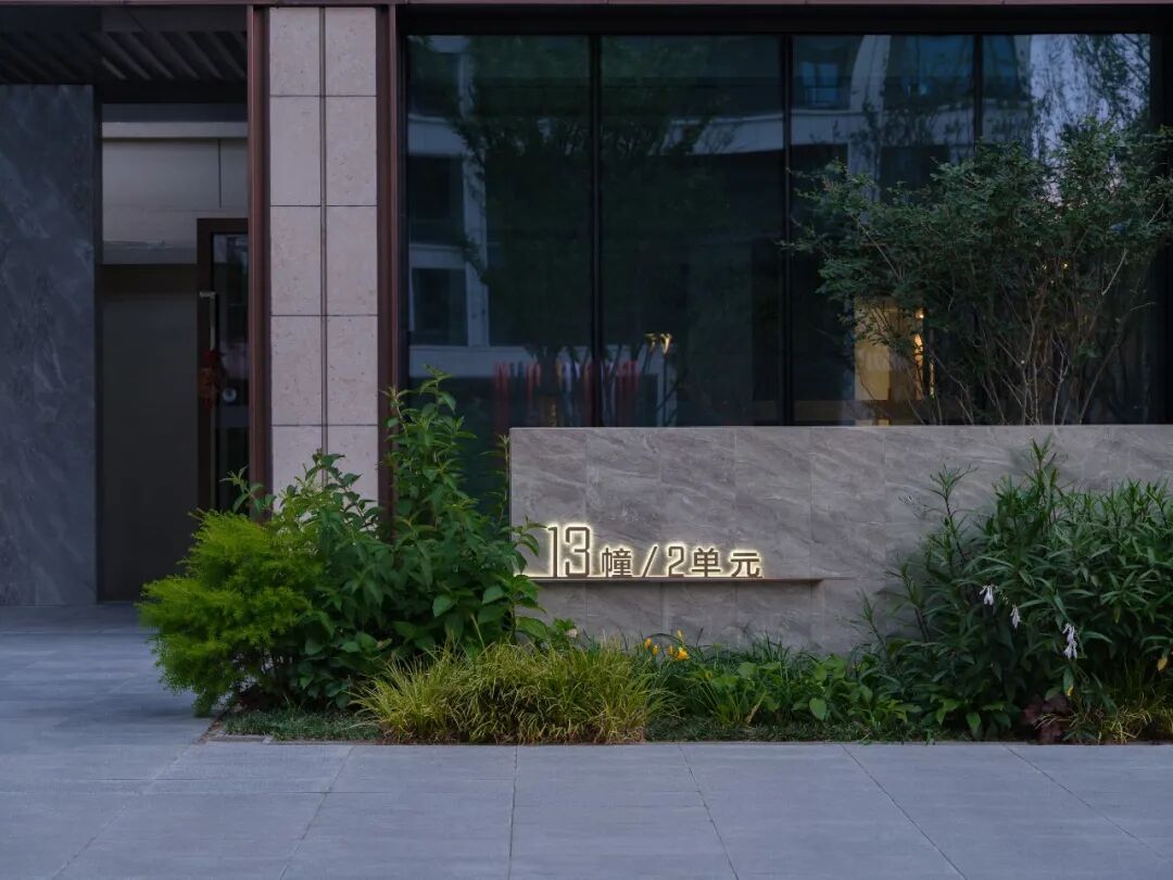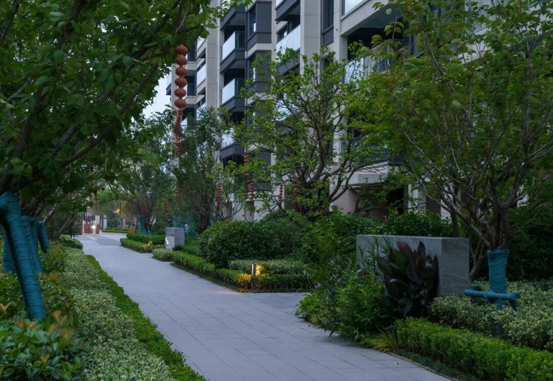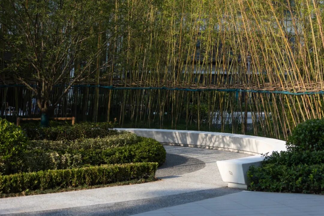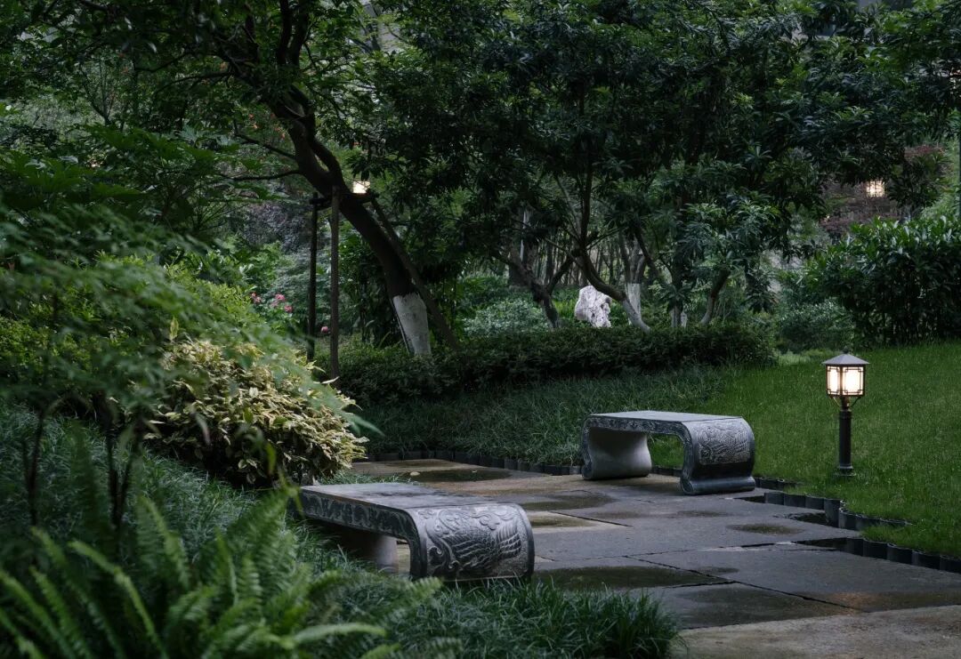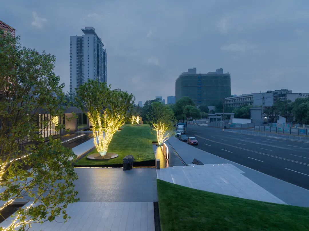 空间的转换是情绪的铺陈,收放之间,尽显品质。步入后场,空间再次被打开。波浪形绿篱仿佛有韵律地流动着。材质与线型的使用延续前场的风格,创造出富有品质感的宜居环境。草木之间,条石组成蜿蜒曲折的溪流,营造出自然的韵律感,构成富有趣味性的景观小品。置身其中,晨光洒下,人们仿佛身处小溪之畔,宁谧与闲适充盈于方寸之间。在此,访客不经意间获得了闲适怡然的归家体验,静谧的自然之境让人忘记外界的嘈杂。以岸为居,以诗为境。遥看城市灯火阑珊,此处独好。