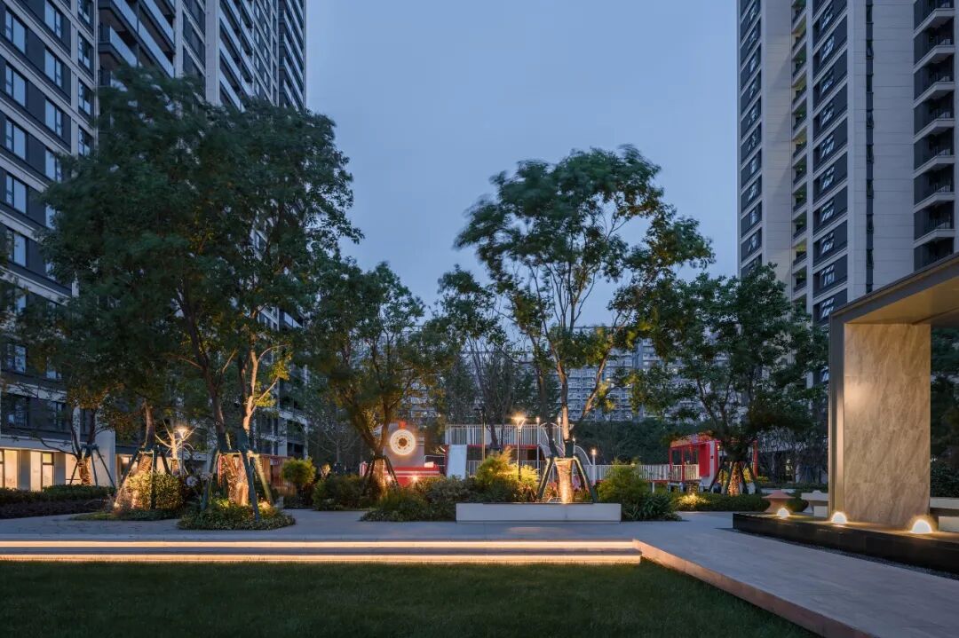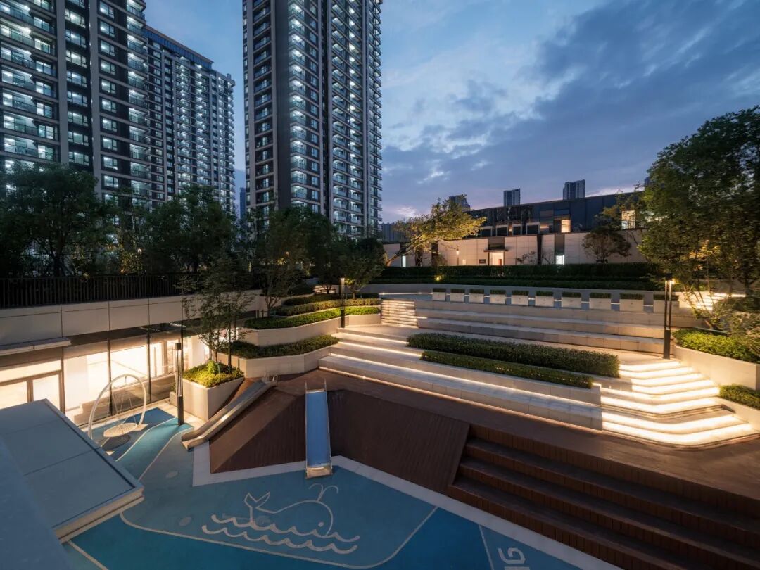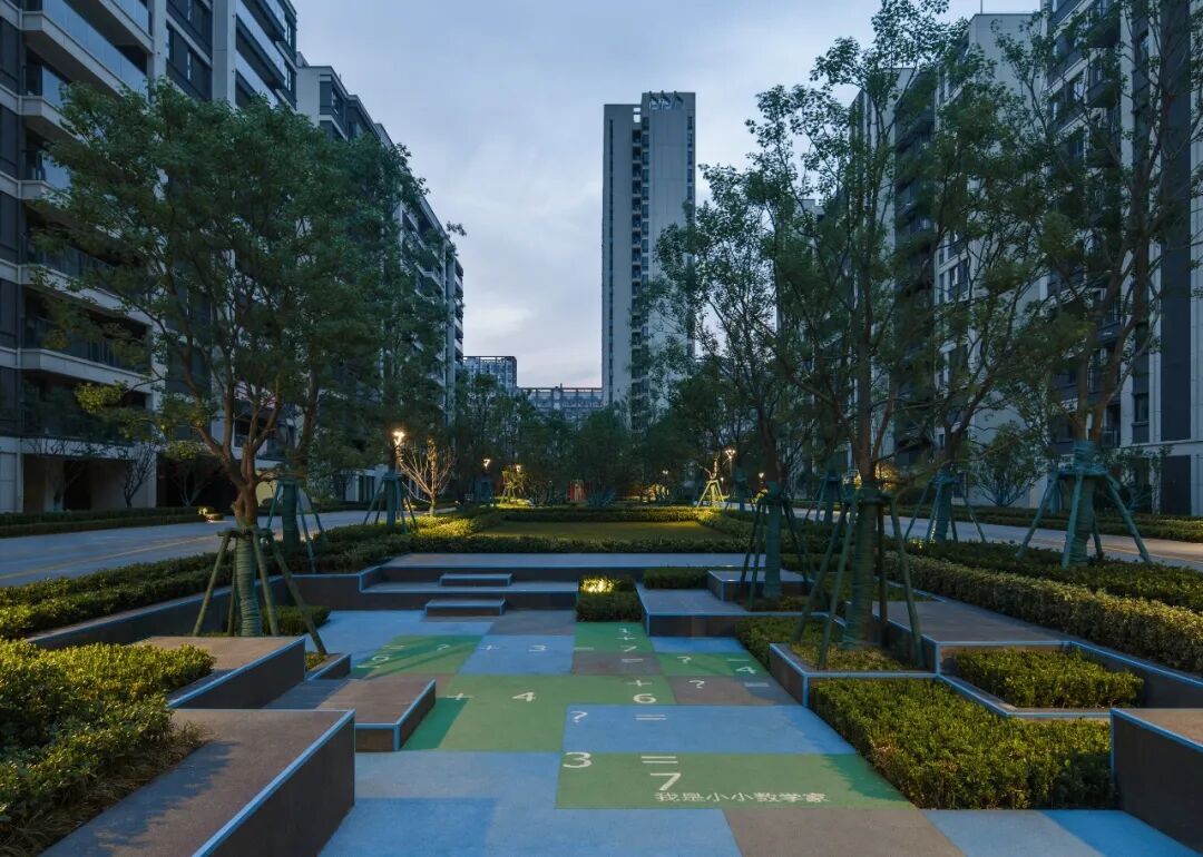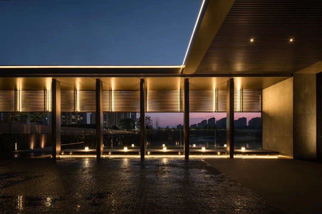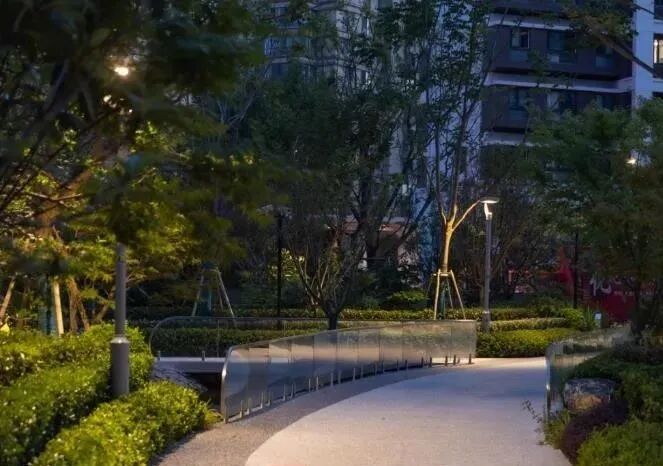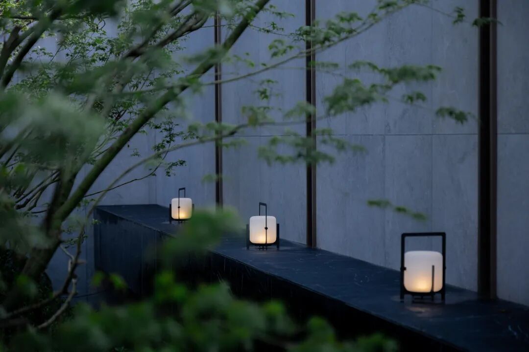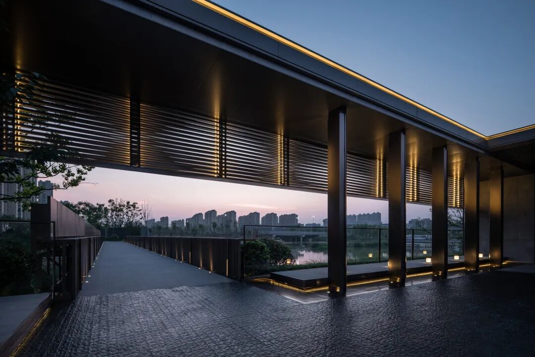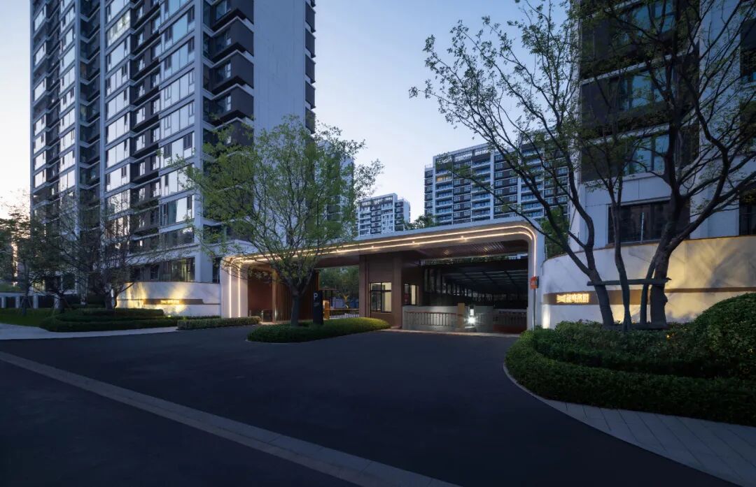 空间的转换是情绪的铺陈,收放之间,尽显品质。步入后场,空间再次被打开。波浪形绿篱仿佛有韵律地流动着。材质与线型的使用延续前场的风格,创造出富有品质感的宜居环境。草木之间,条石组成蜿蜒曲折的溪流,营造出自然的韵律感,构成富有趣味性的景观小品。置身其中,晨光洒下,人们仿佛身处小溪之畔,宁谧与闲适充盈于方寸之间。在此,访客不经意间获得了闲适怡然的归家体验,静谧的自然之境让人忘记外界的嘈杂。以岸为居,以诗为境。遥看城市灯火阑珊,此处独好。