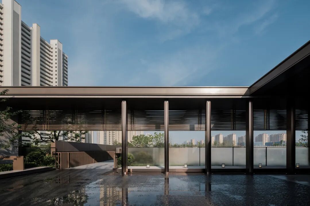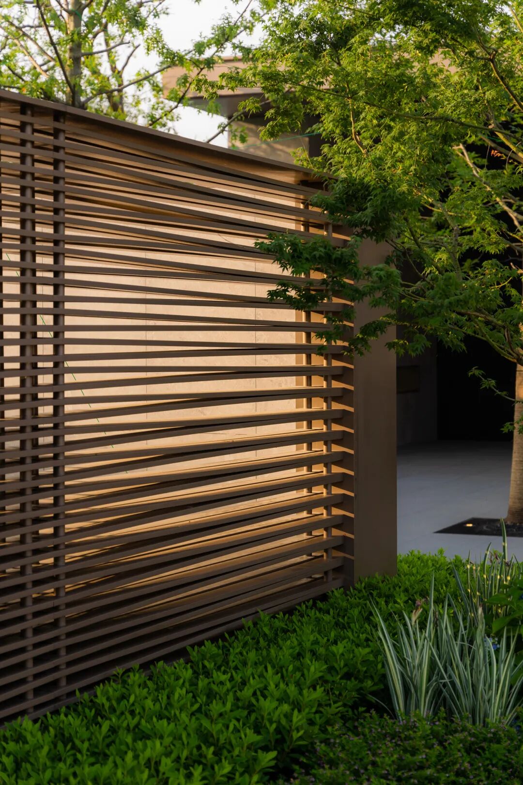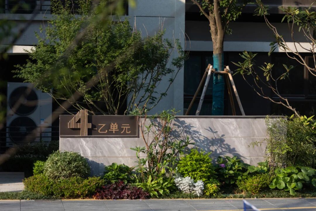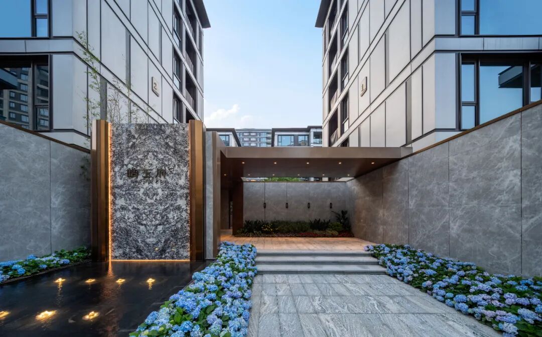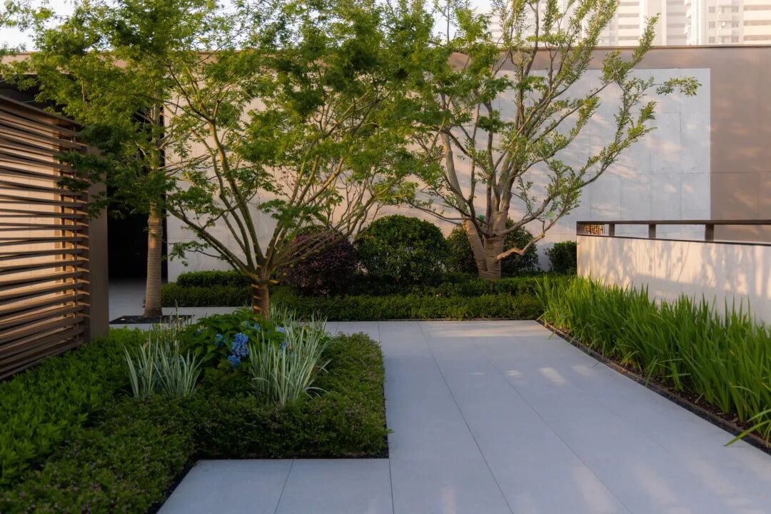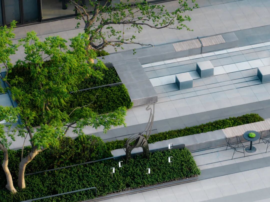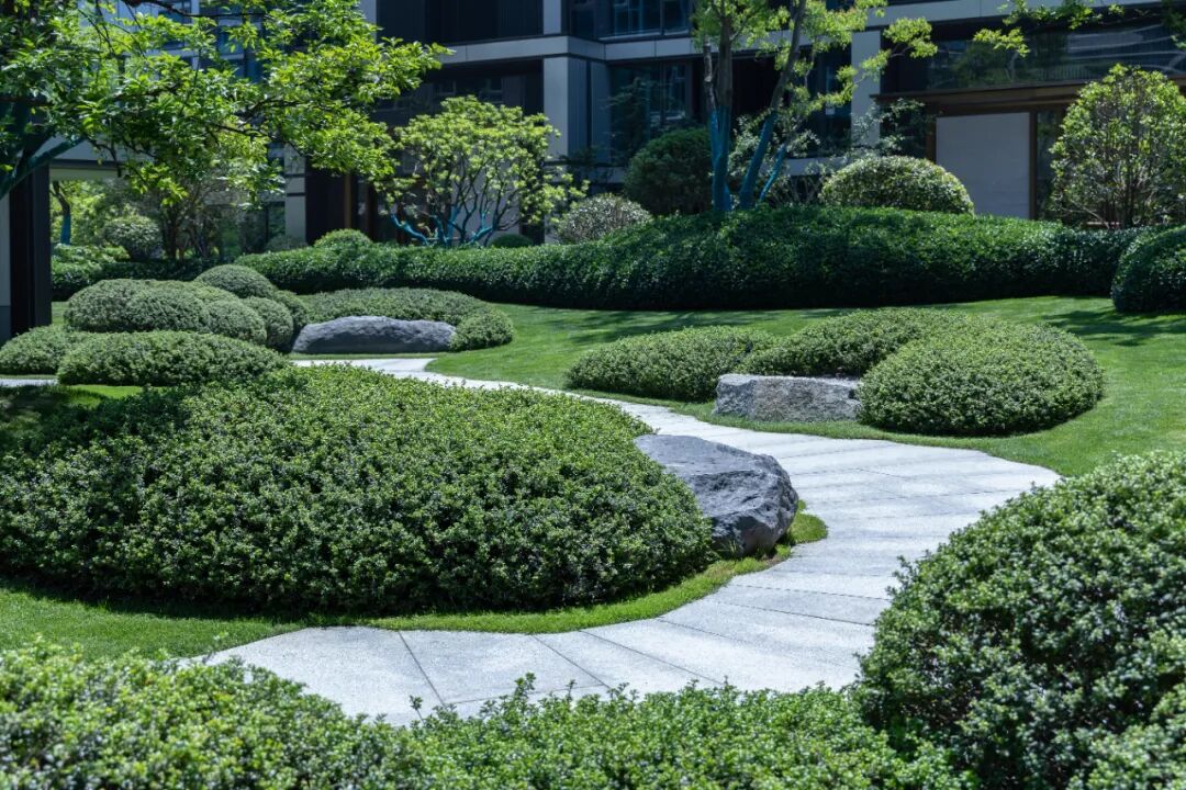 空间的转换是情绪的铺陈,收放之间,尽显品质。步入后场,空间再次被打开。波浪形绿篱仿佛有韵律地流动着。材质与线型的使用延续前场的风格,创造出富有品质感的宜居环境。草木之间,条石组成蜿蜒曲折的溪流,营造出自然的韵律感,构成富有趣味性的景观小品。置身其中,晨光洒下,人们仿佛身处小溪之畔,宁谧与闲适充盈于方寸之间。在此,访客不经意间获得了闲适怡然的归家体验,静谧的自然之境让人忘记外界的嘈杂。以岸为居,以诗为境。遥看城市灯火阑珊,此处独好。