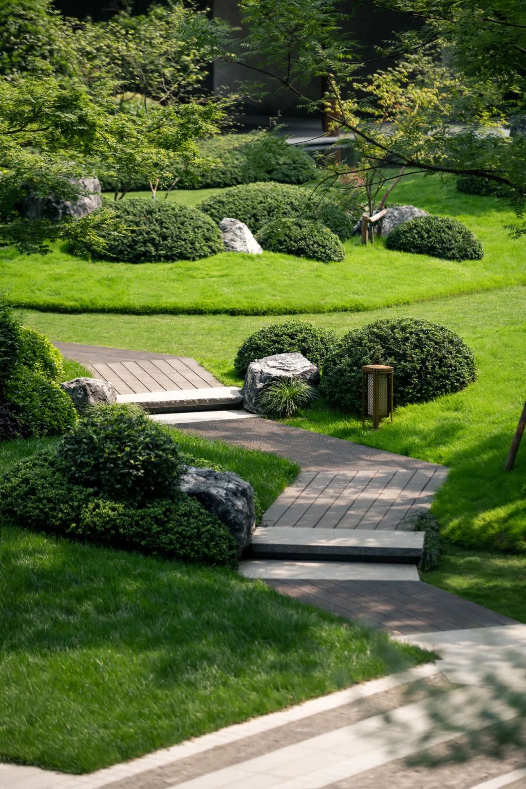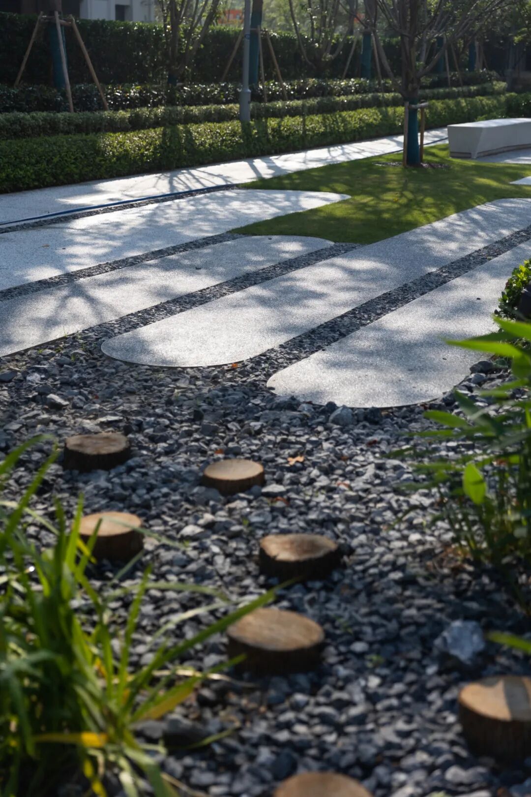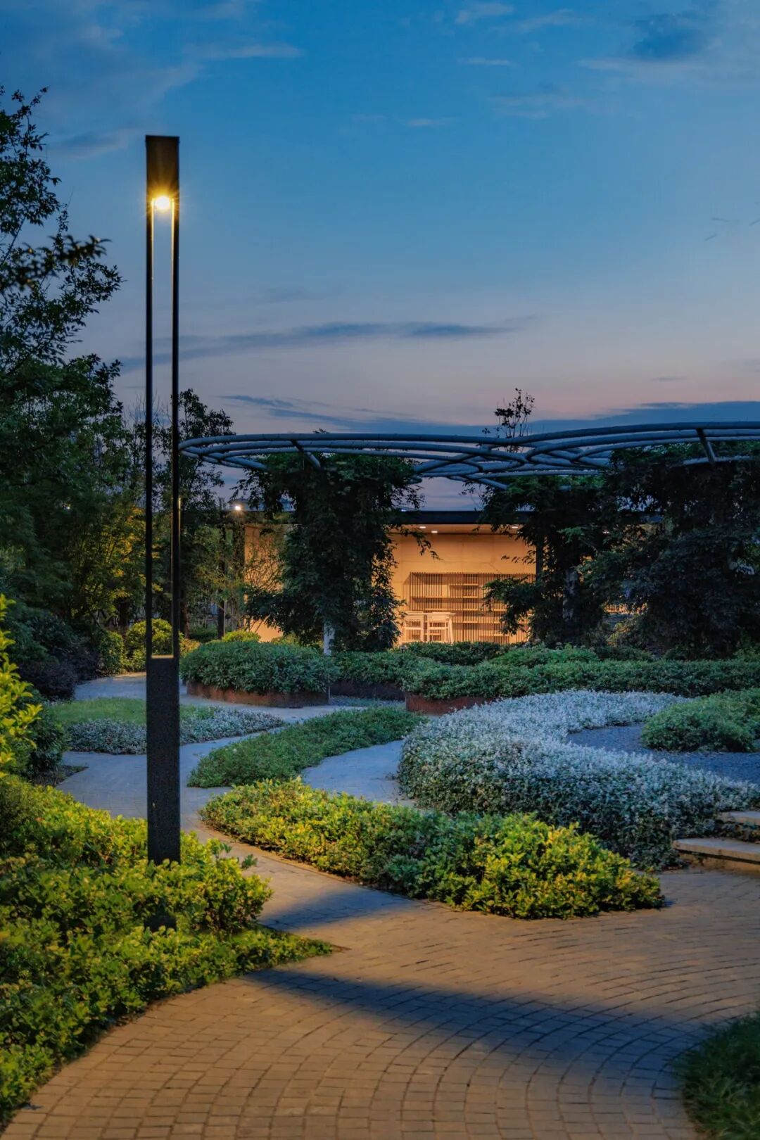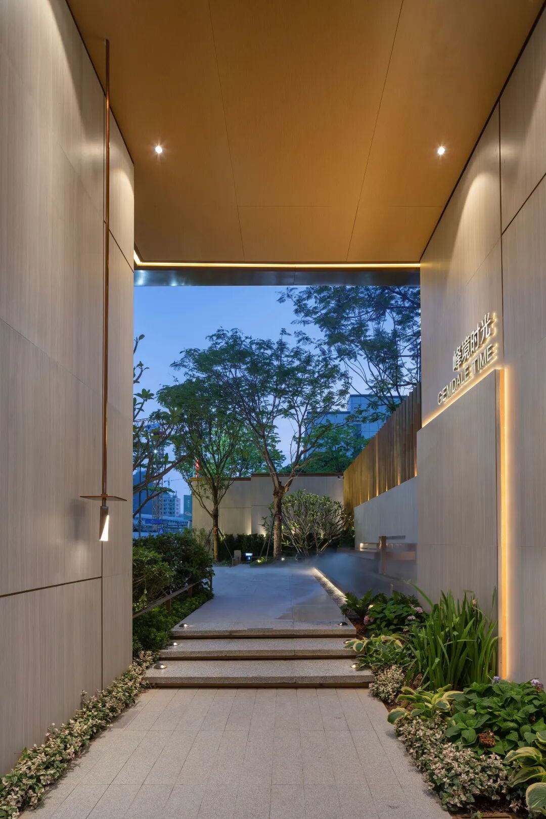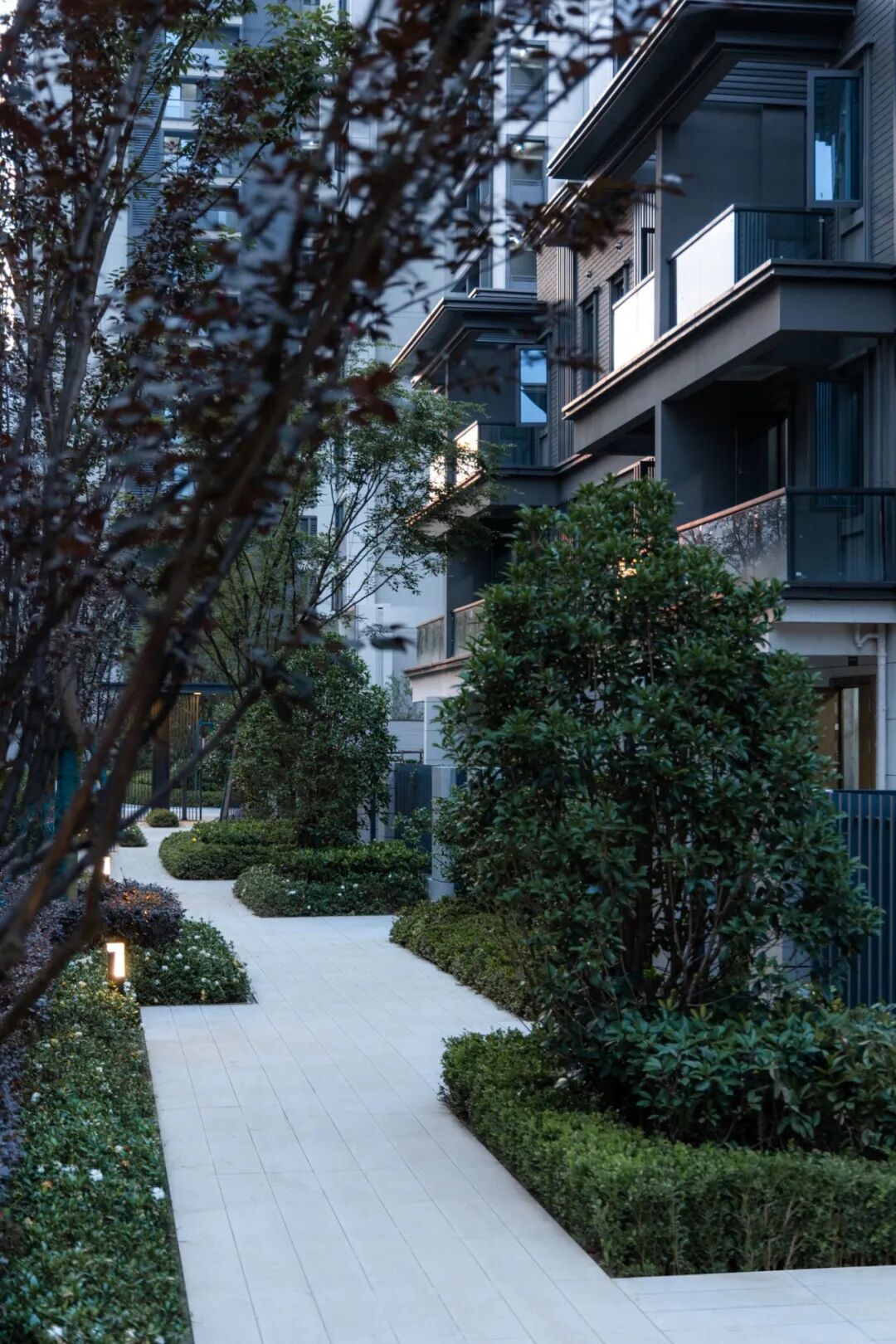 空间的转换是情绪的铺陈,收放之间,尽显品质。步入后场,空间再次被打开。波浪形绿篱仿佛有韵律地流动着。材质与线型的使用延续前场的风格,创造出富有品质感的宜居环境。草木之间,条石组成蜿蜒曲折的溪流,营造出自然的韵律感,构成富有趣味性的景观小品。置身其中,晨光洒下,人们仿佛身处小溪之畔,宁谧与闲适充盈于方寸之间。在此,访客不经意间获得了闲适怡然的归家体验,静谧的自然之境让人忘记外界的嘈杂。以岸为居,以诗为境。遥看城市灯火阑珊,此处独好。
