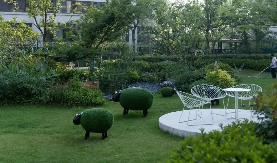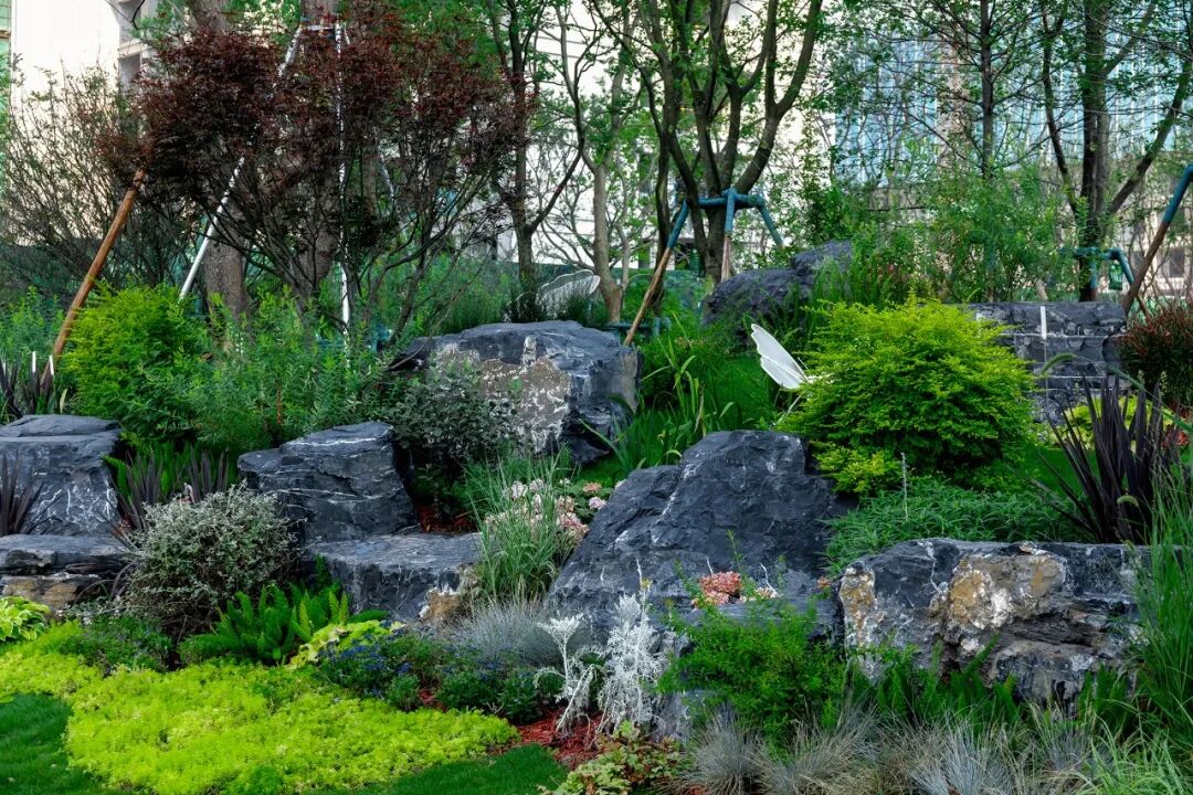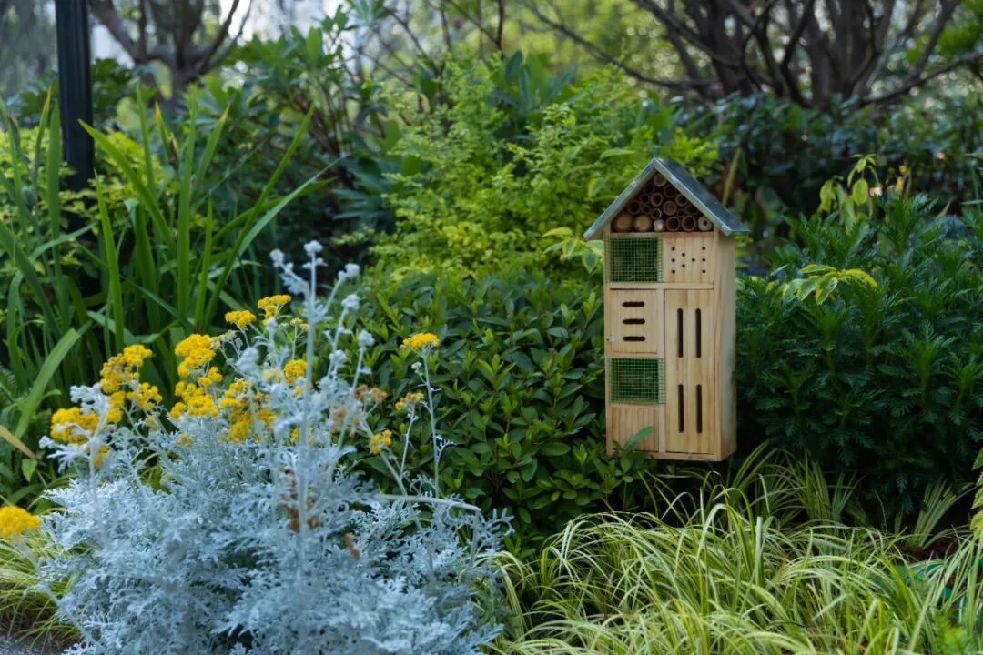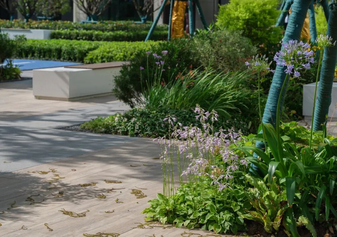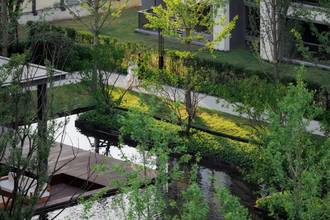 穿过球场,郁郁葱葱、自然生态的雨水花园出现在我们眼前。雨水花园植物葱郁而富有生命力,是一个回归最本质状态的理想之地,让人们以现代生活方式栖息于自然花园的怀抱中。