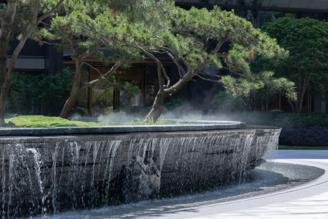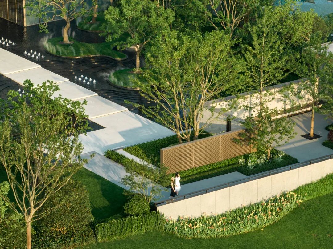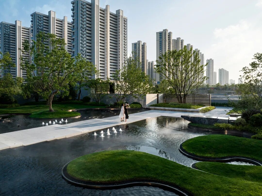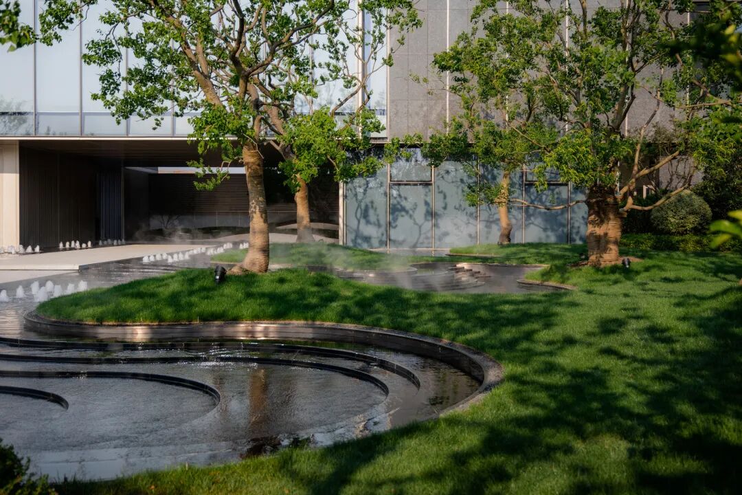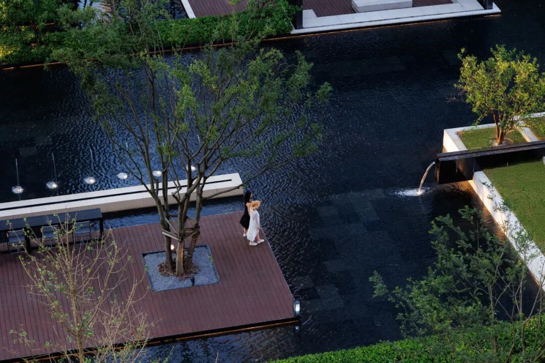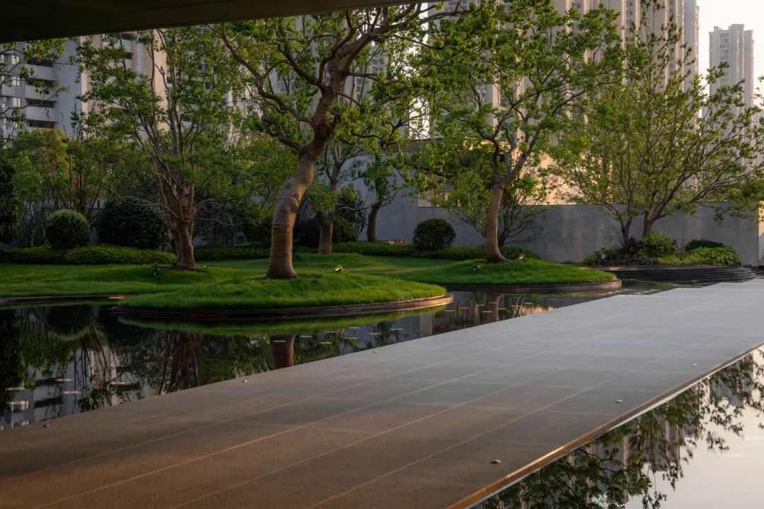 曲径通幽处,空间豁然开朗。镜池、叠水、涌泉、绿岛……自然灵气扑面而来,立于轴线步道,两侧流动的树池浮于水中,层级池边营造跌级涟漪意境,使人仿佛置于氤氲山谷。居者亲水、近水的精神需求在此得以满足。