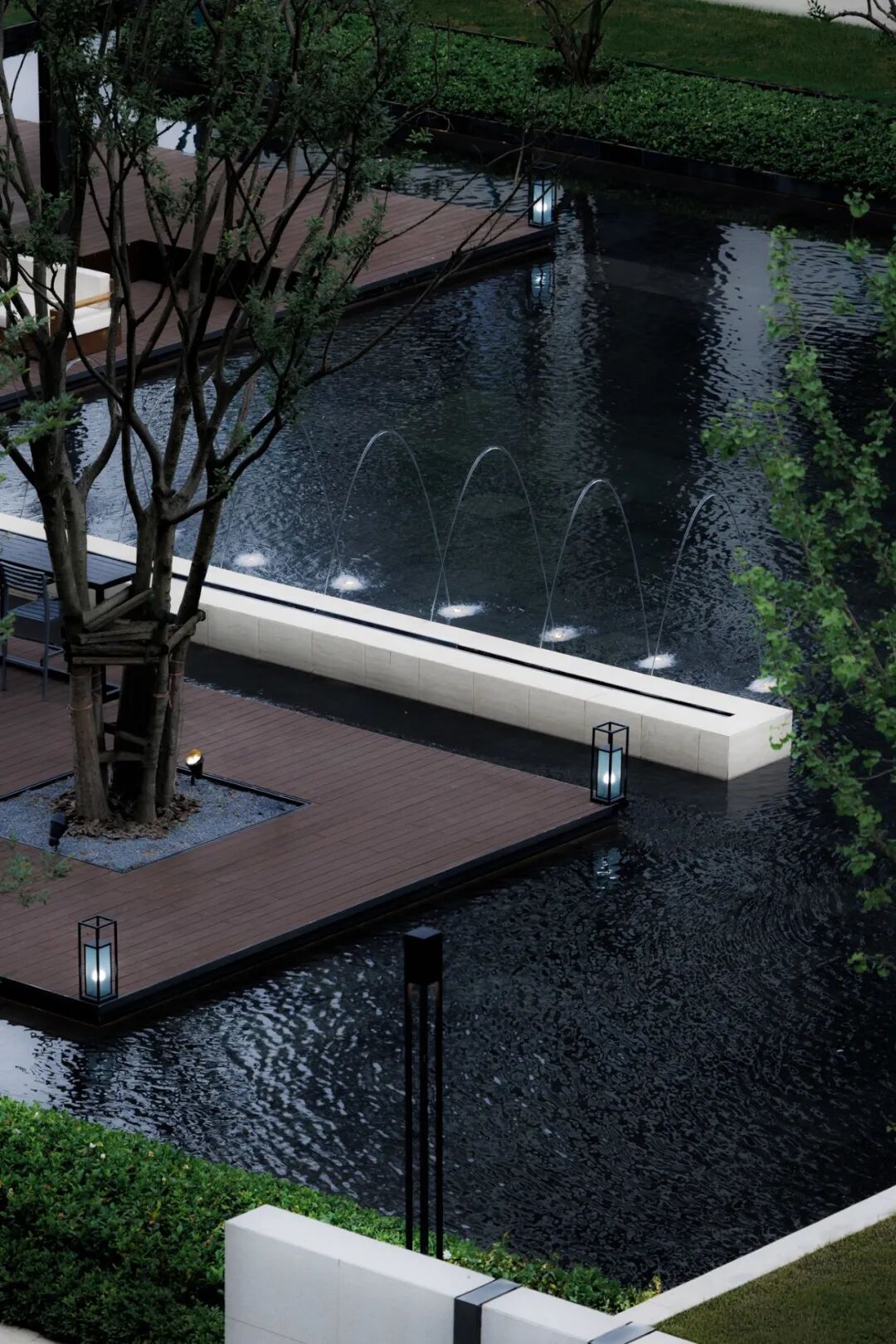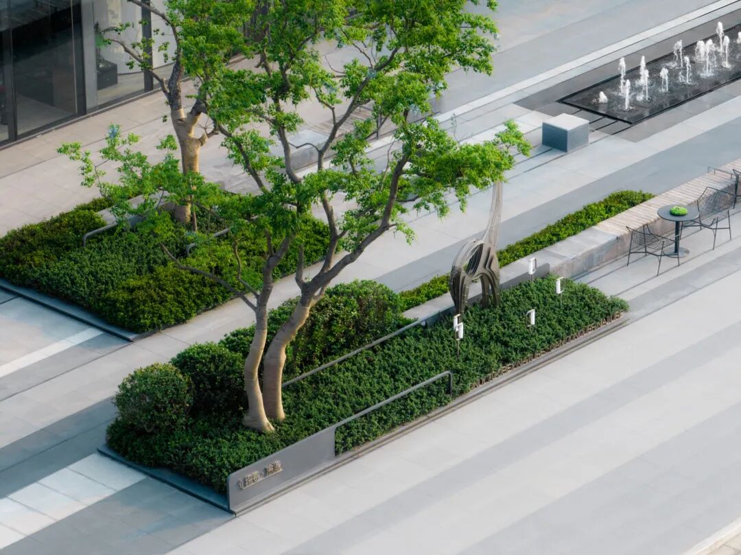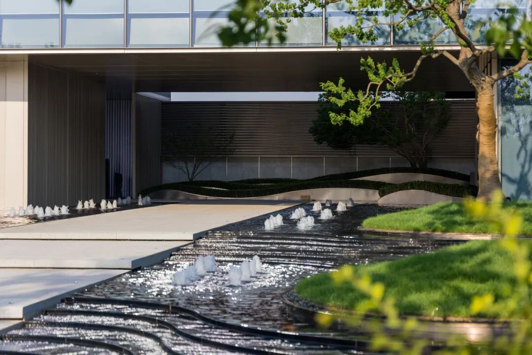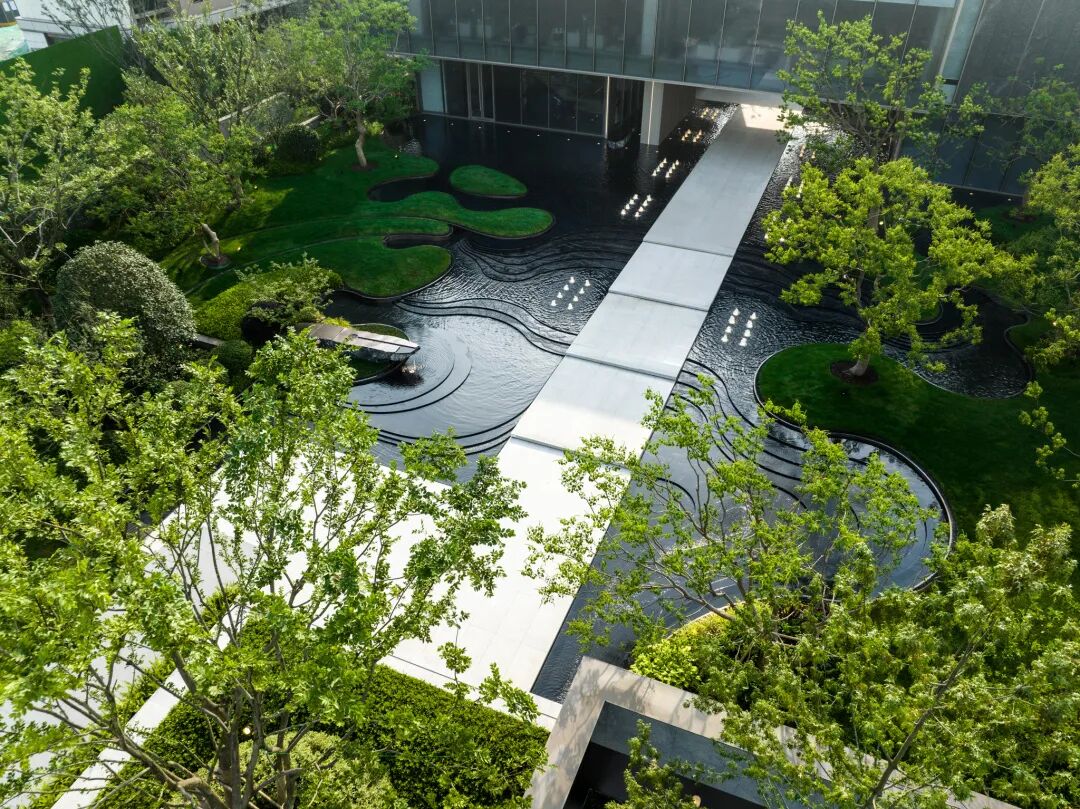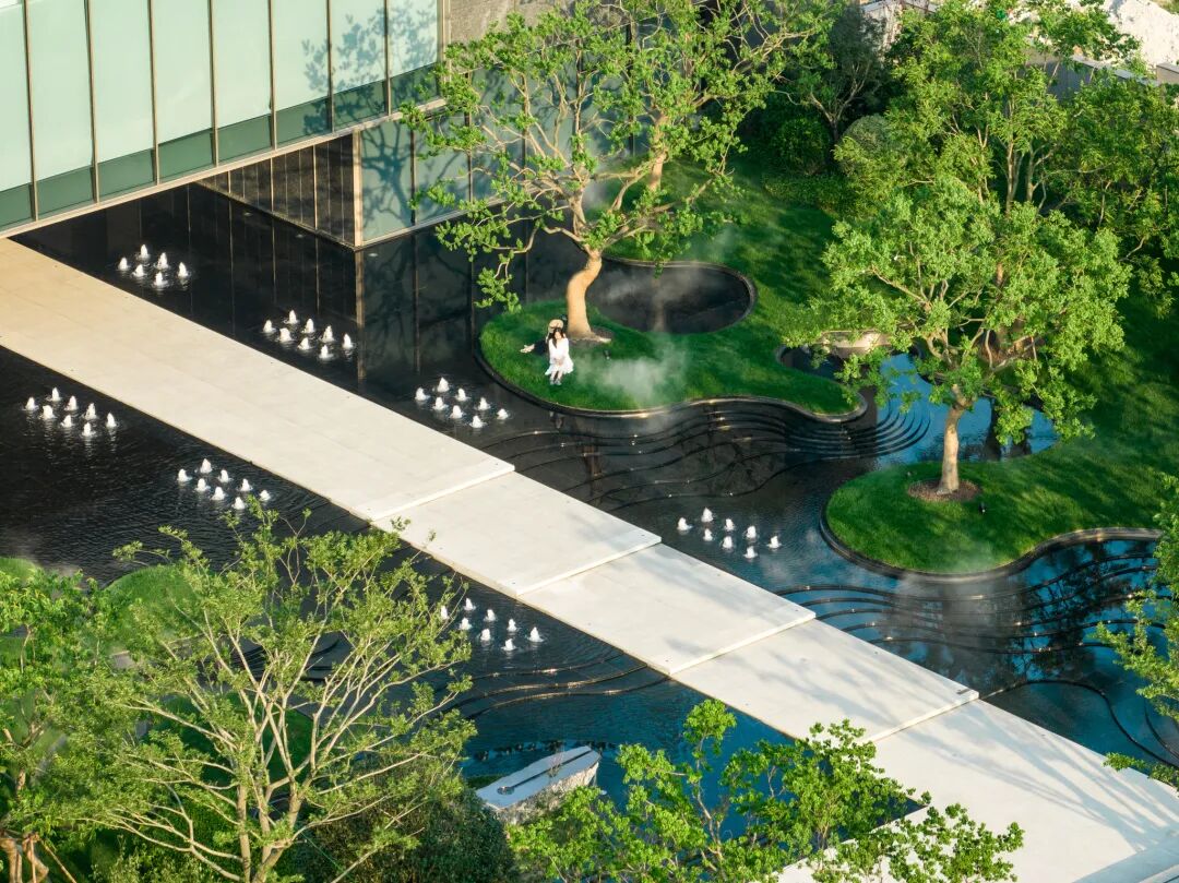 曲径通幽处,空间豁然开朗。镜池、叠水、涌泉、绿岛……自然灵气扑面而来,立于轴线步道,两侧流动的树池浮于水中,层级池边营造跌级涟漪意境,使人仿佛置于氤氲山谷。居者亲水、近水的精神需求在此得以满足。