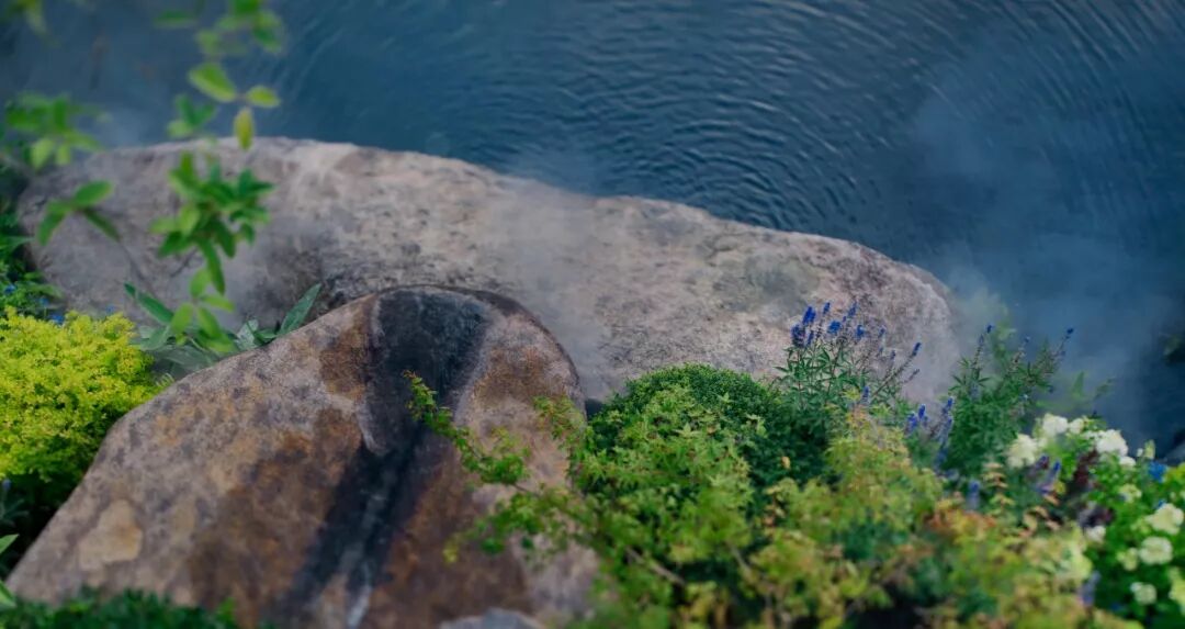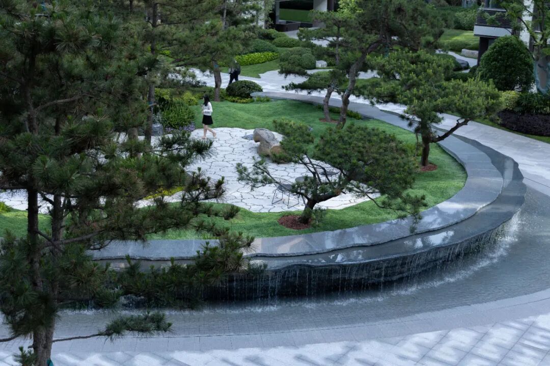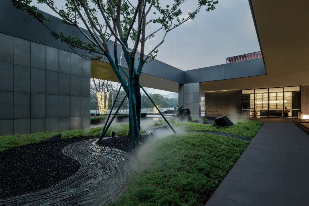 面前,两侧的树适当退让,使售楼处入口完整而开阔地展现于访客的眼前,视线上也更强调了空间的“放”。倚于水边的景石间淌下一股清泉,大气开敞的景观格局间点缀着精致细腻的情感描绘。