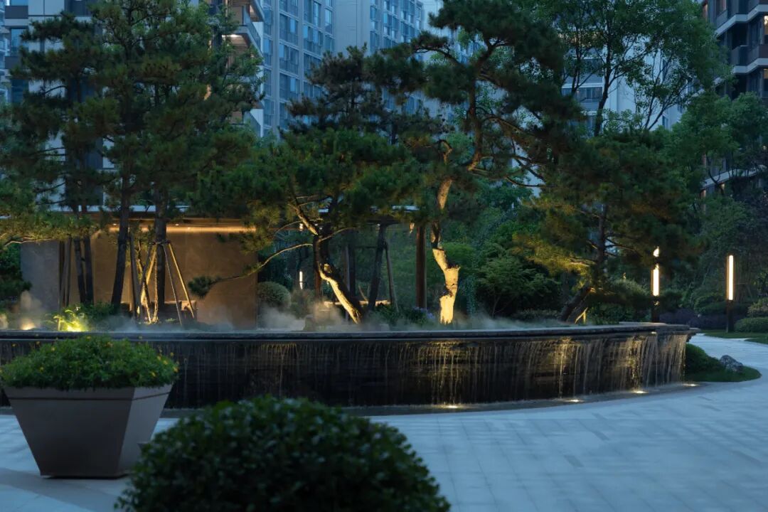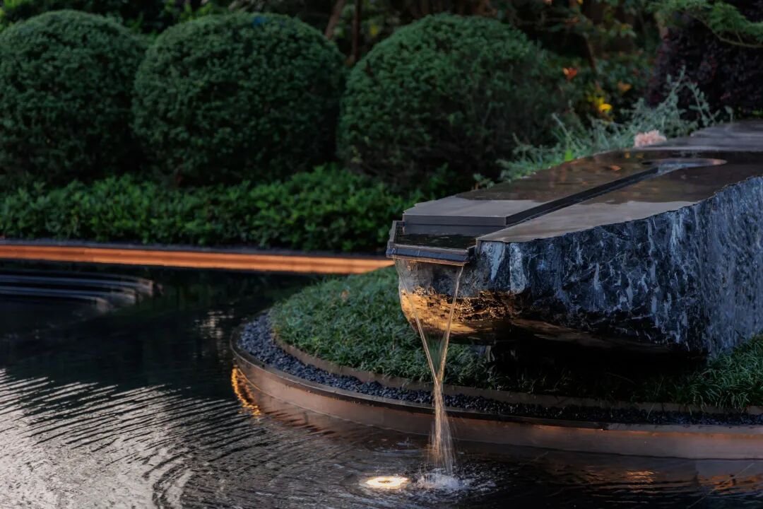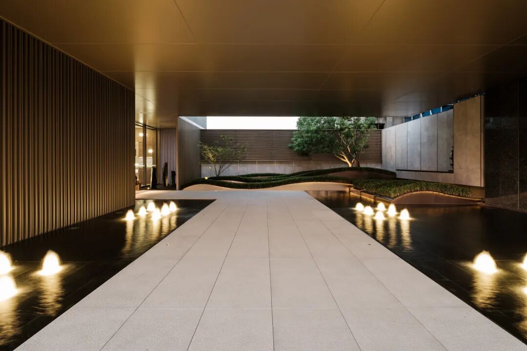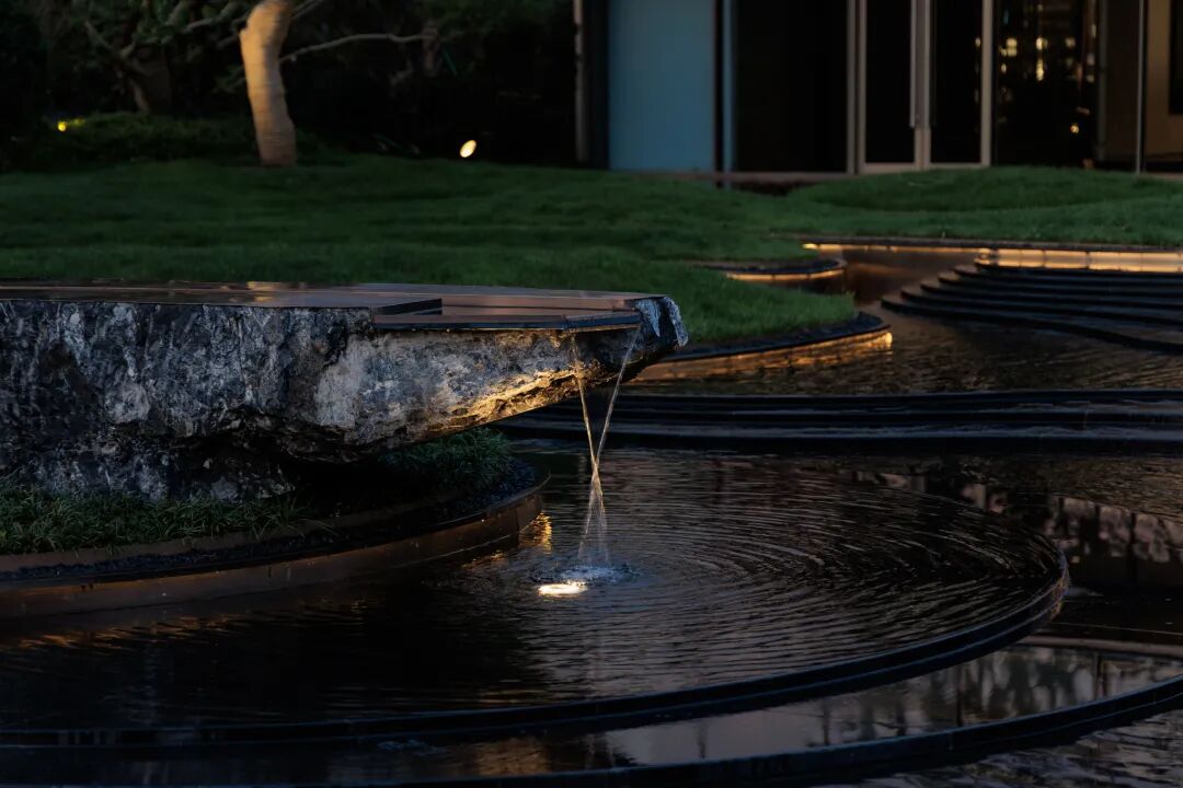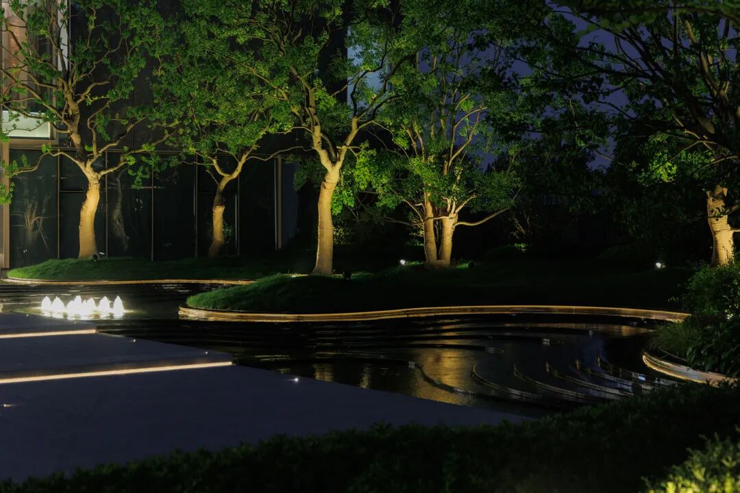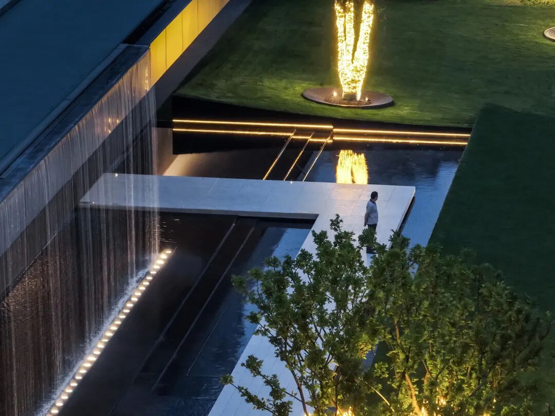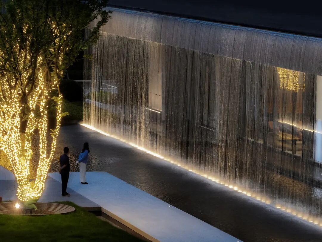 步临水畔,动静成趣。随着脚步的深入,一片池水豁然眼前。面前的建筑形式简约大气,材料色调生态自然,通透的玻璃幕墙与震撼的建筑落水共同构成建筑界面的延伸感。建筑前的水面创造出由上而下的映射,倒影之中仿佛空间也实现了延伸,黑色的铺装池底呼应着建筑的材质,一明一暗的对比,活化了整体景致。静池与落水相映成趣,动静对比之下也丰富了观感。人们置身于造型自然的树木萦绕之中,配合唯美的灯光,汩汩的涌泉,不经意间获得了闲适怡然的归家体验。