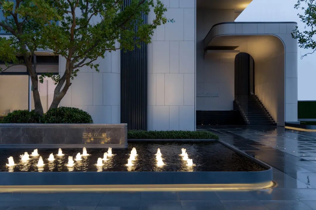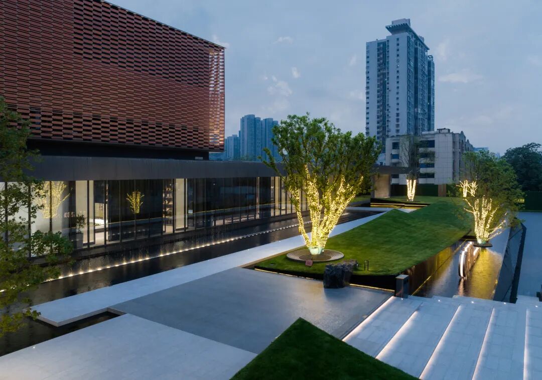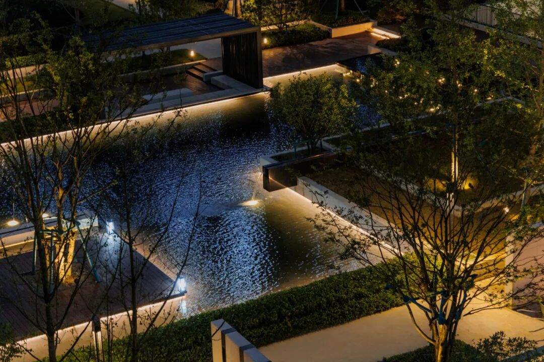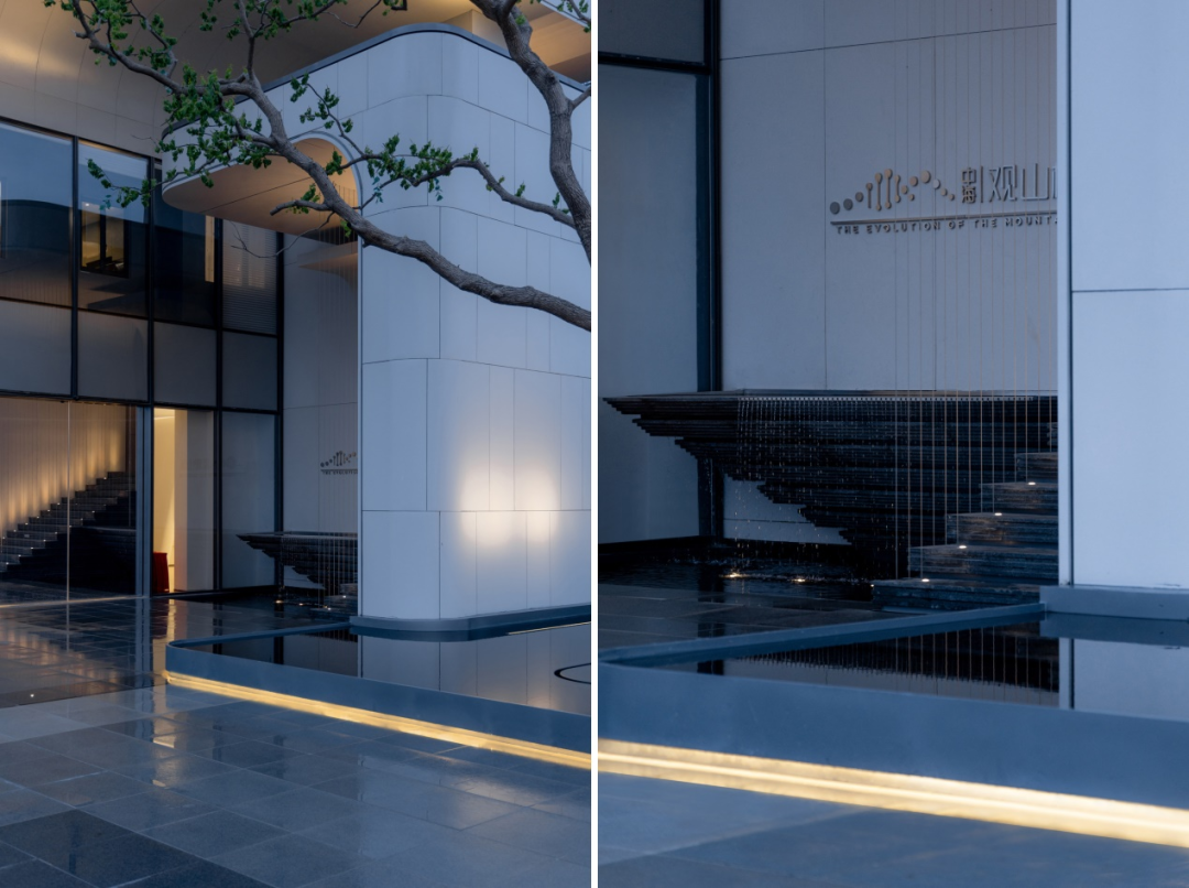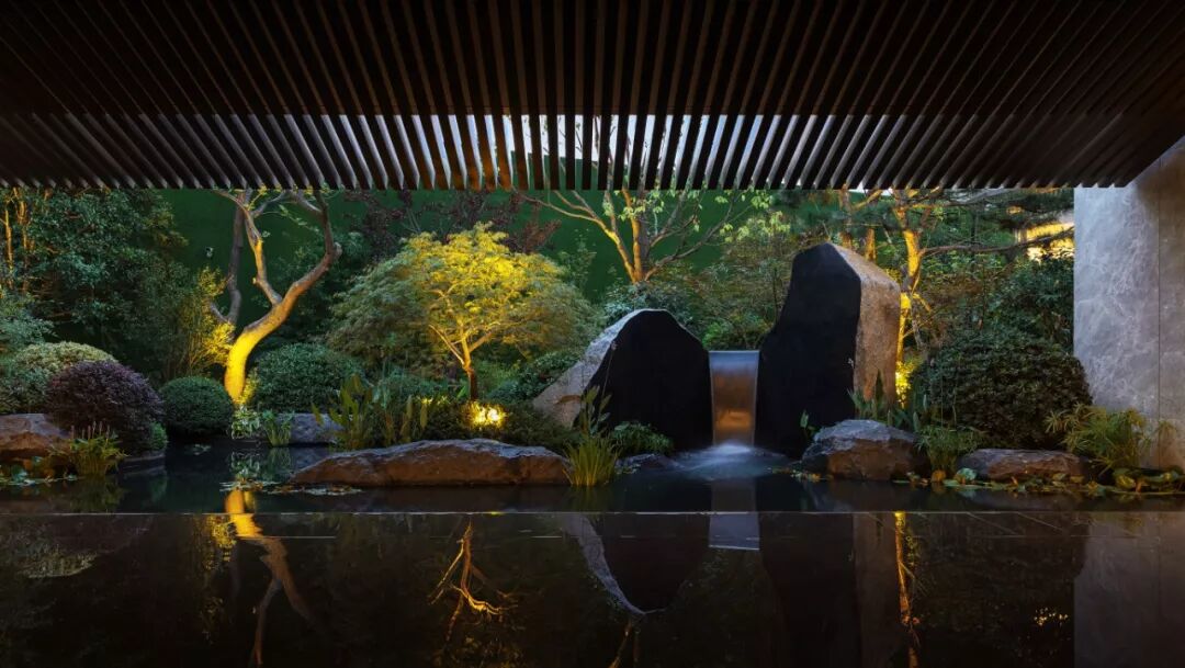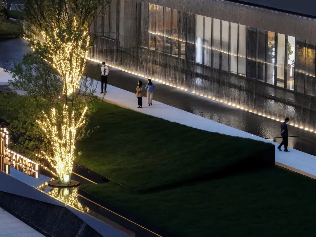 步临水畔,动静成趣。随着脚步的深入,一片池水豁然眼前。面前的建筑形式简约大气,材料色调生态自然,通透的玻璃幕墙与震撼的建筑落水共同构成建筑界面的延伸感。建筑前的水面创造出由上而下的映射,倒影之中仿佛空间也实现了延伸,黑色的铺装池底呼应着建筑的材质,一明一暗的对比,活化了整体景致。静池与落水相映成趣,动静对比之下也丰富了观感。人们置身于造型自然的树木萦绕之中,配合唯美的灯光,汩汩的涌泉,不经意间获得了闲适怡然的归家体验。