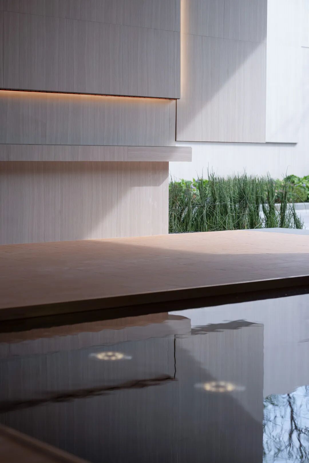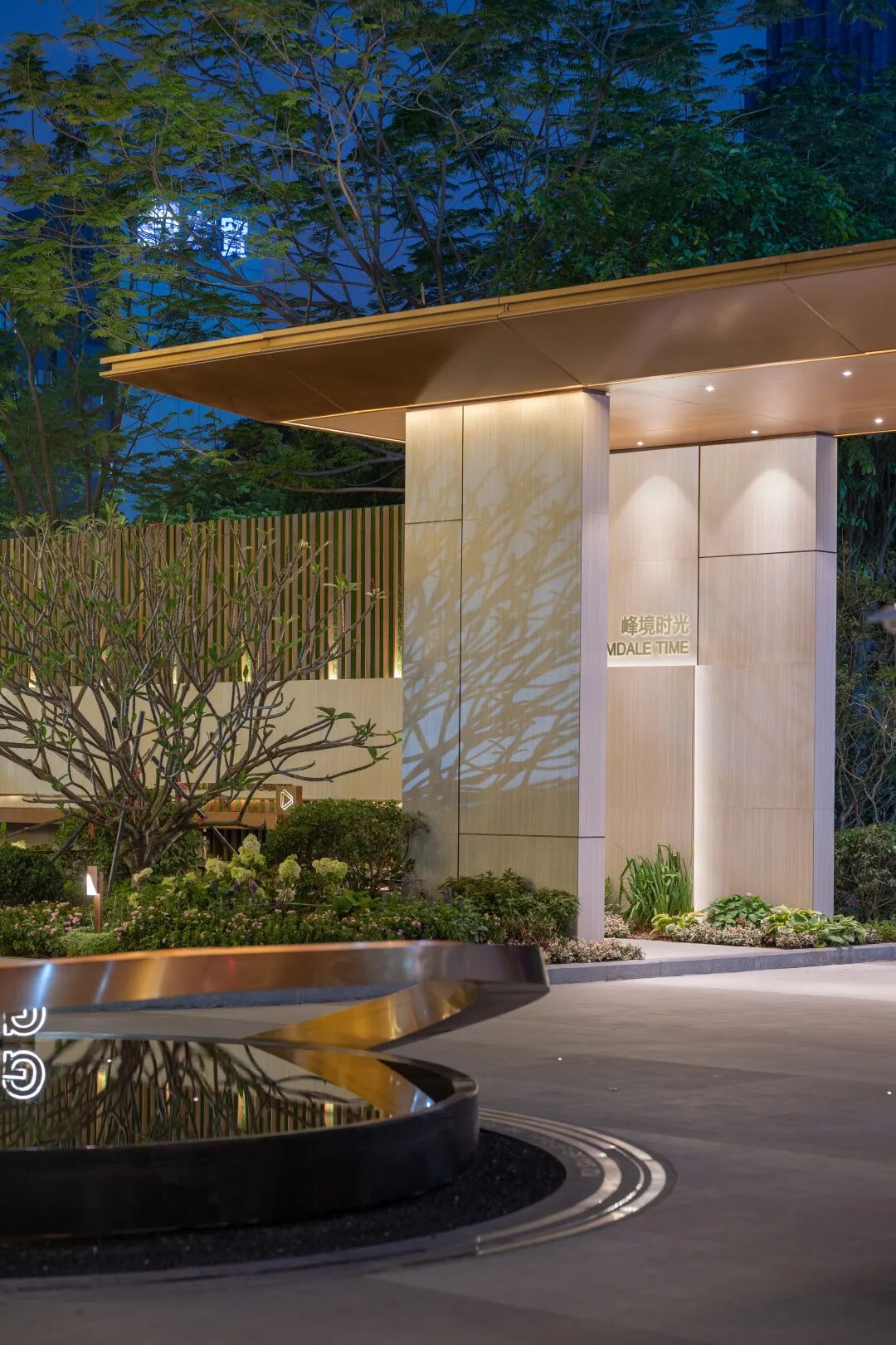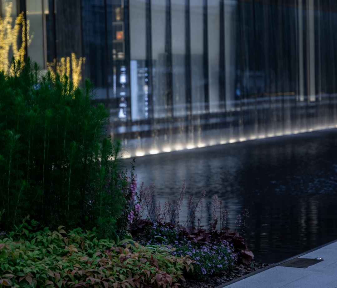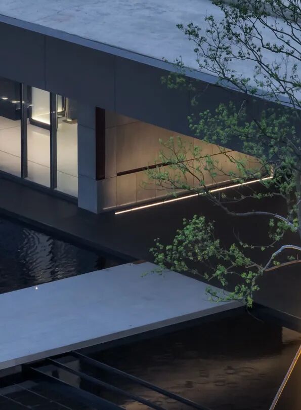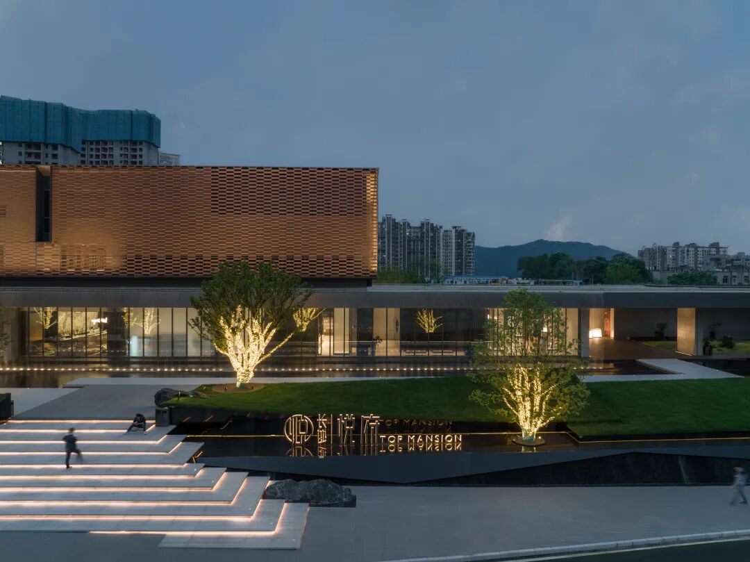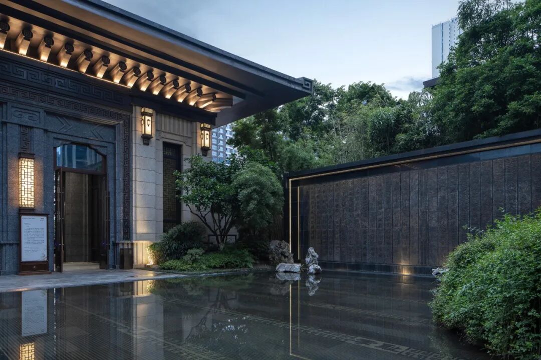 步临水畔,动静成趣。随着脚步的深入,一片池水豁然眼前。面前的建筑形式简约大气,材料色调生态自然,通透的玻璃幕墙与震撼的建筑落水共同构成建筑界面的延伸感。建筑前的水面创造出由上而下的映射,倒影之中仿佛空间也实现了延伸,黑色的铺装池底呼应着建筑的材质,一明一暗的对比,活化了整体景致。静池与落水相映成趣,动静对比之下也丰富了观感。人们置身于造型自然的树木萦绕之中,配合唯美的灯光,汩汩的涌泉,不经意间获得了闲适怡然的归家体验。