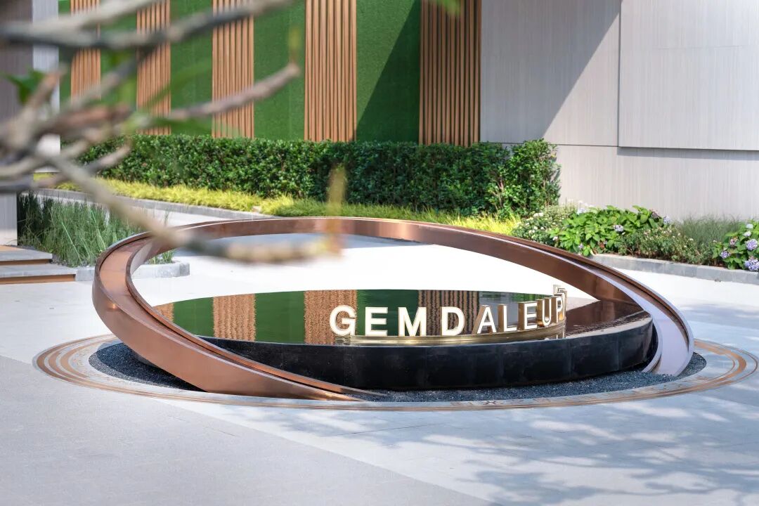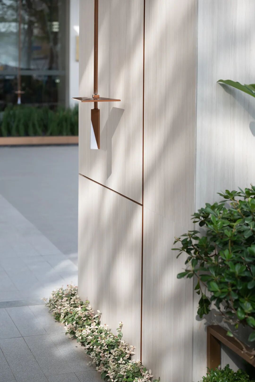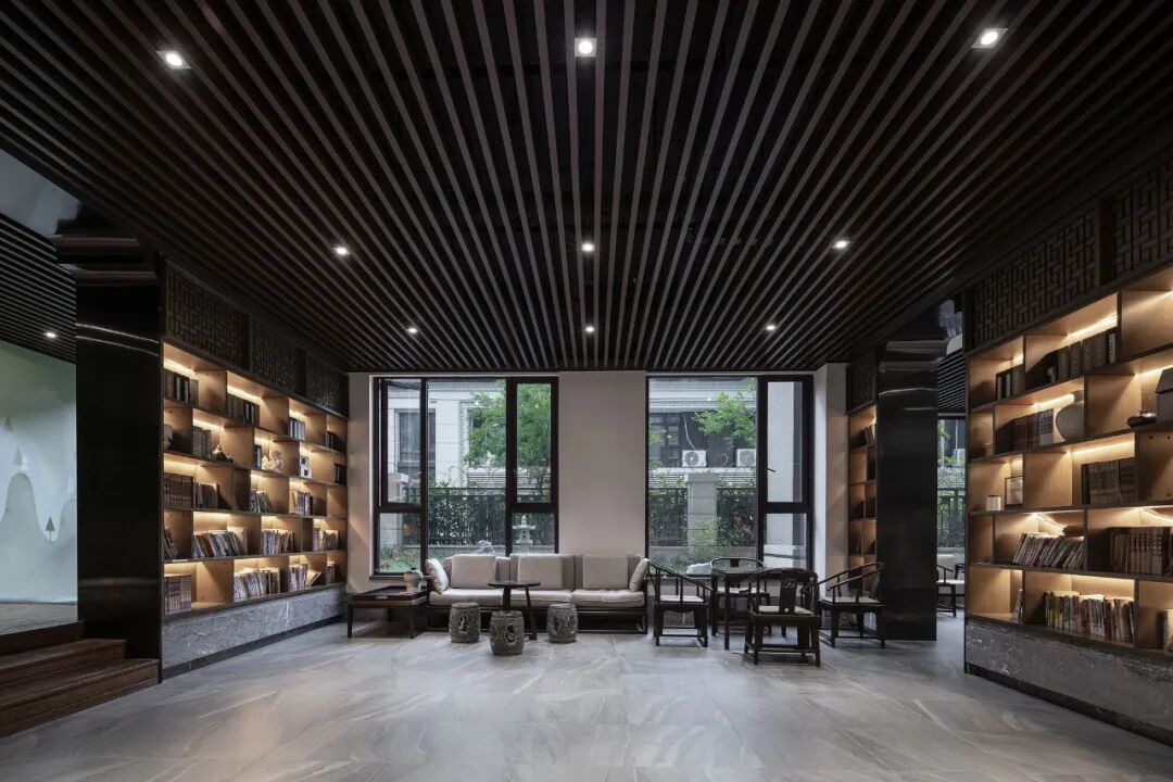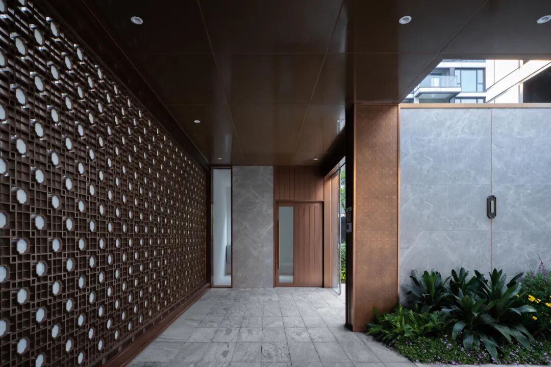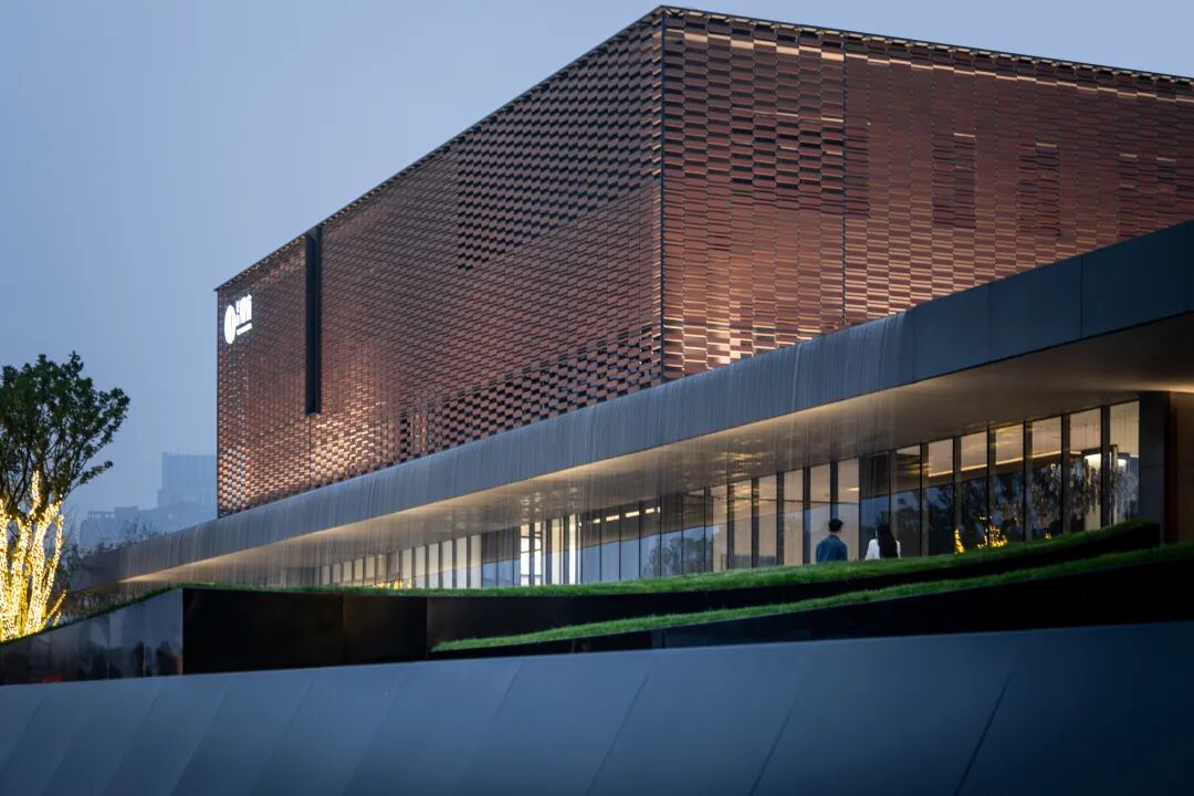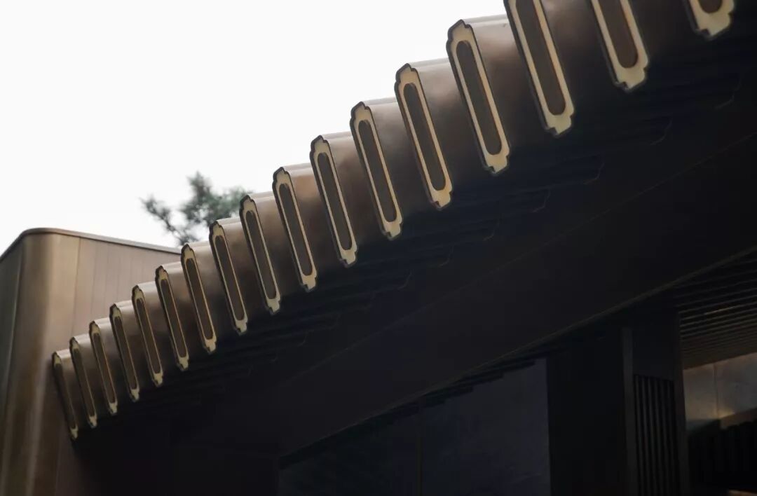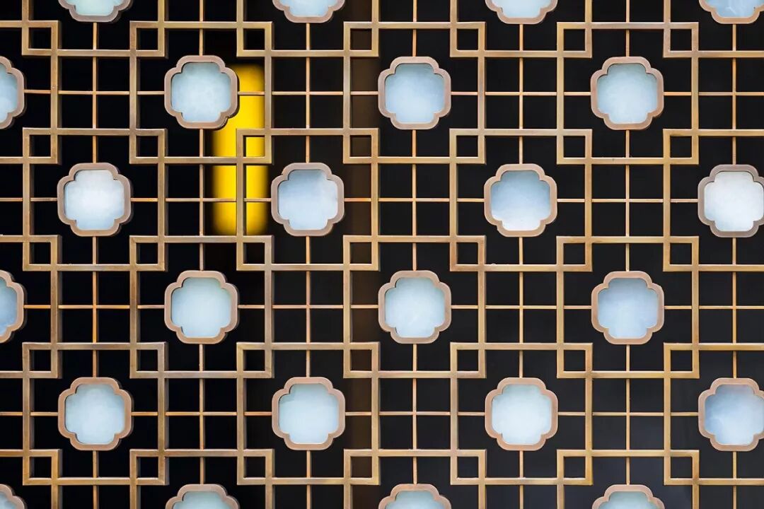 格栅采用的香槟色延续自廊桥,不觉间将轻奢气质注入场地。富有艺术气息的雕塑点缀于丛中,高雅氛围充盈于方寸之间。交错的格栅形式,灵感源于马家浜的葛罗纹织物,本土文脉的延续在细节处淋漓体现。