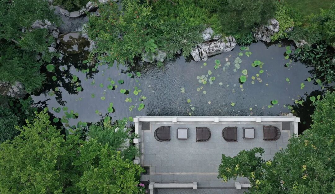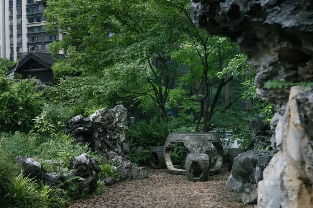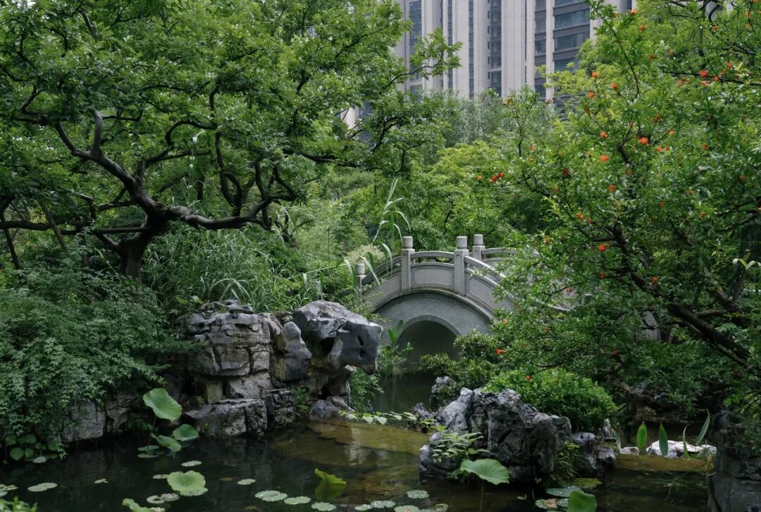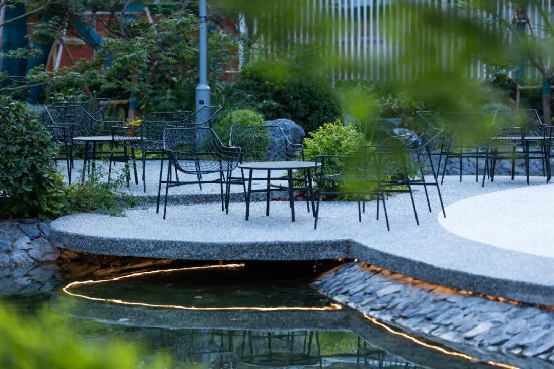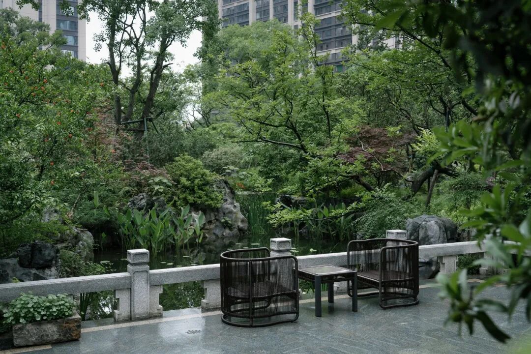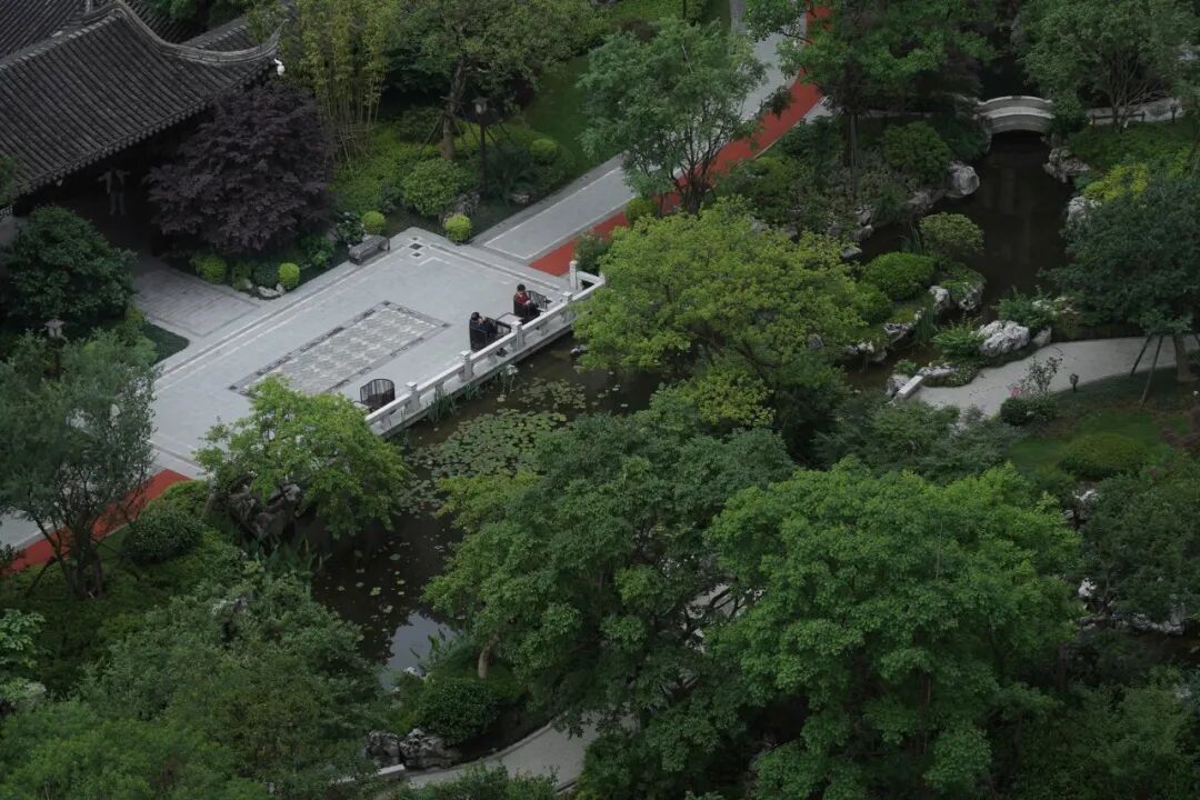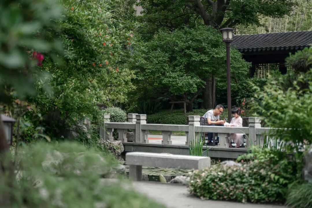 宁谧的镜池与汩汩的涌泉相映成趣,动静之间丰富了视觉。水、石、绿的有机结合,让“烟雨江森”的理念在此得到精致的呈现。闲适怡然之中,人们从城市的喧哗中抽离,沉浸在缓慢宁静的时光里。