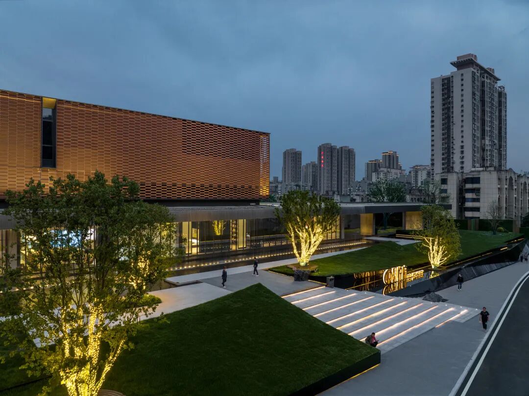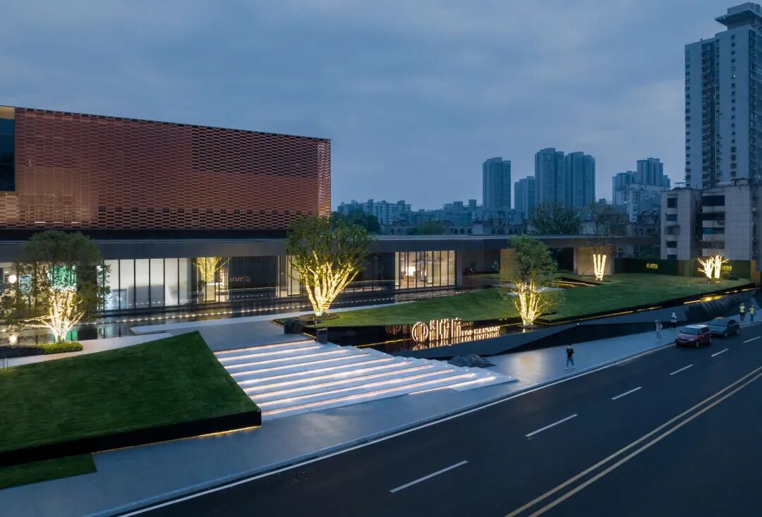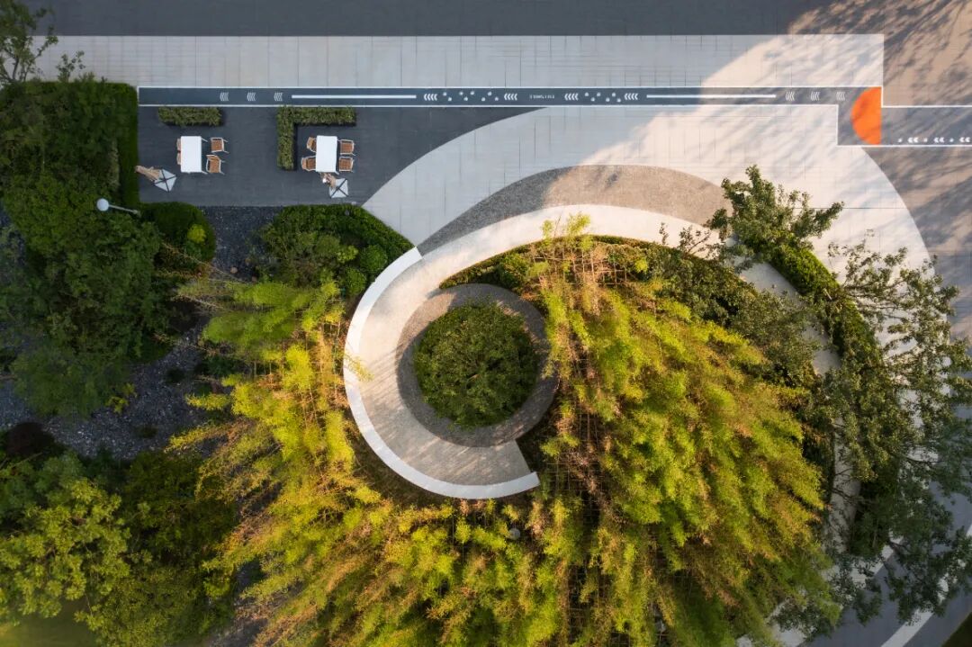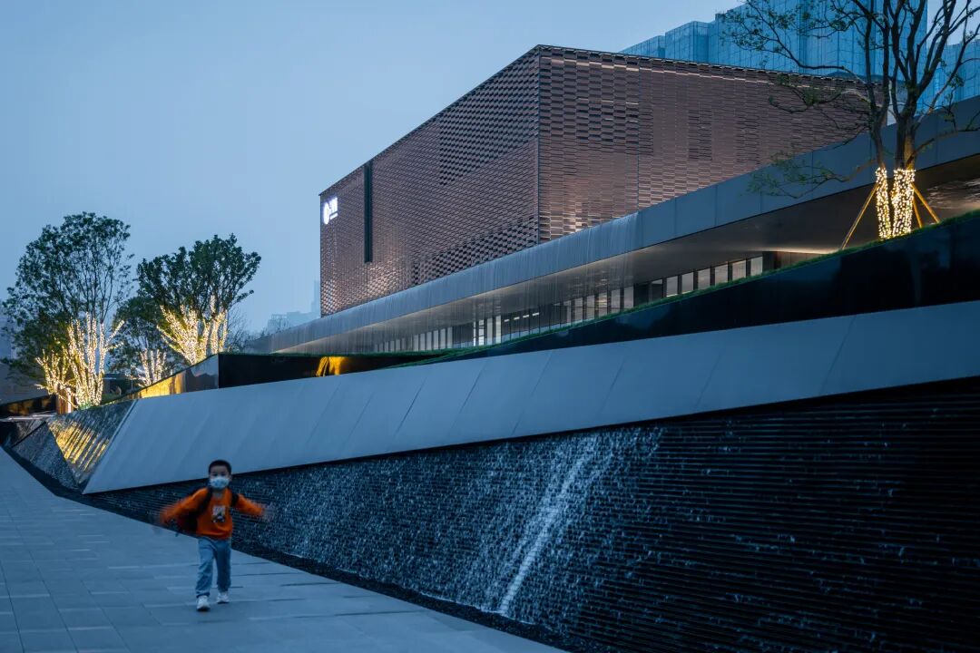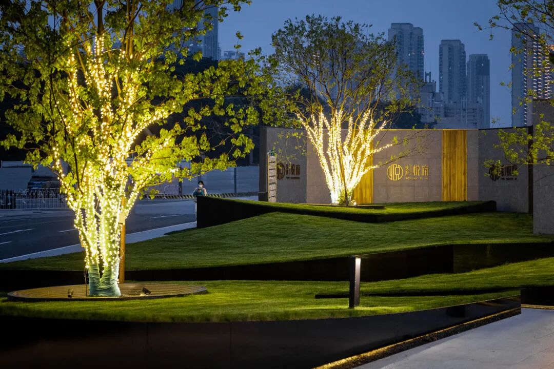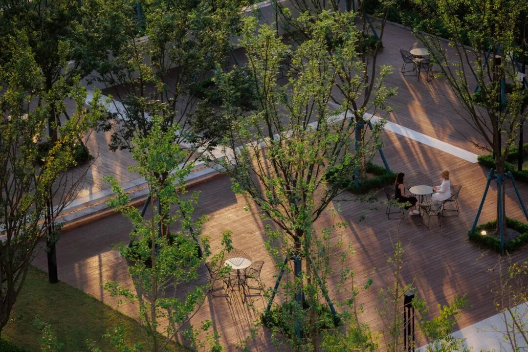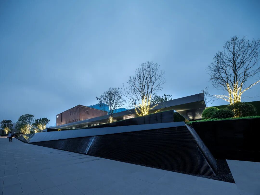 移步异景,寻林入境。在这里,大地艺术与水景的结合,有如山与江的相遇。层层交叠的线条如绵延不绝的山脉,交错其中的水景如静谧的江面,二者形态相接相错,相映成趣,共同塑造了根植本土文脉的艺术氛围。不加矫饰的线性语言与进退有秩的几何形态,丰富了空间的同时也恪守着简约的风格。