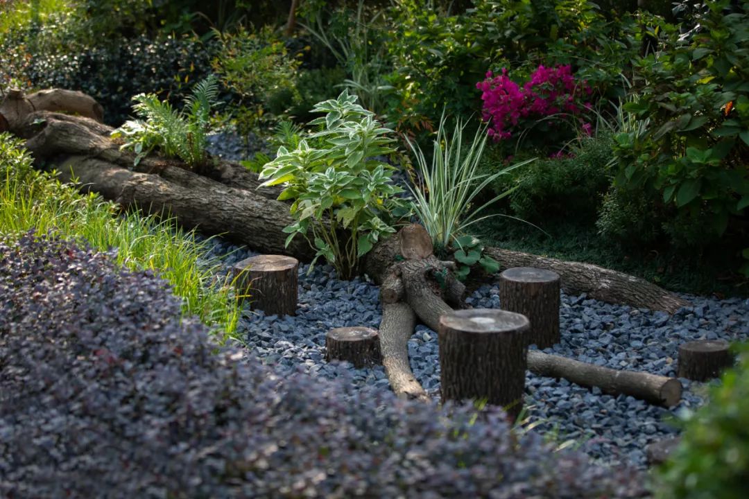 雨水花园采用了耐水湿耐干旱的多年生水生植物如鸢尾、菖蒲及透水材料、自然的木桩进行设计,尽可能模拟自然,减少景观的维护力度,取之自然,用于自然,保证雨水花园能在一定程度内自循环。