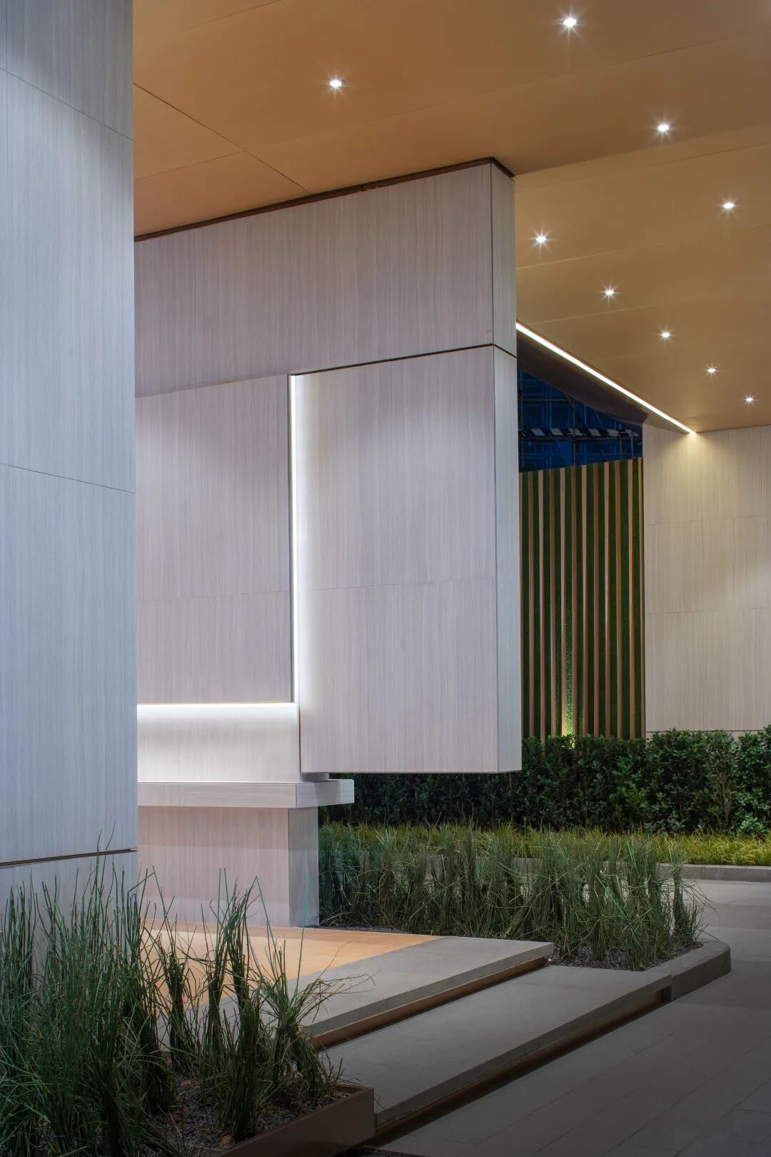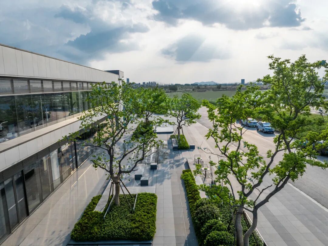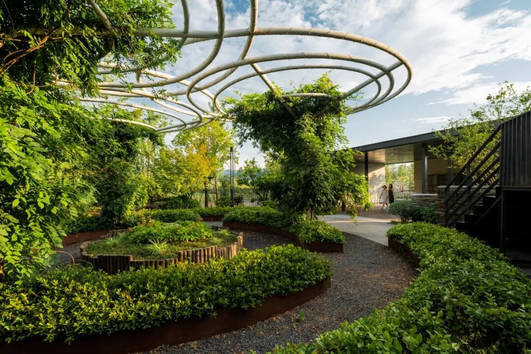 经过廊桥,示范区入口映入眼帘,接待车在此停泊、落客。眼前的树木阵列排布,强调出仪式感。踱步经过入口连廊后,空间收紧,草木围拢之中,静谧氛围如入秘境。