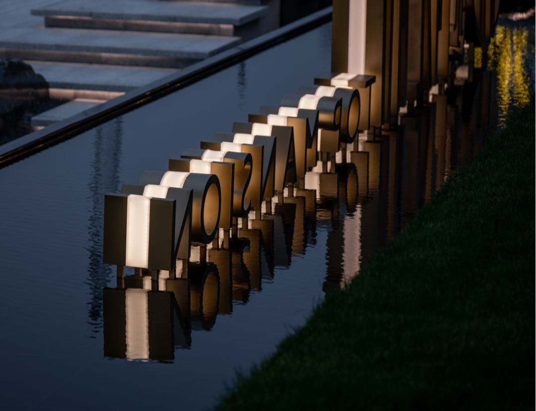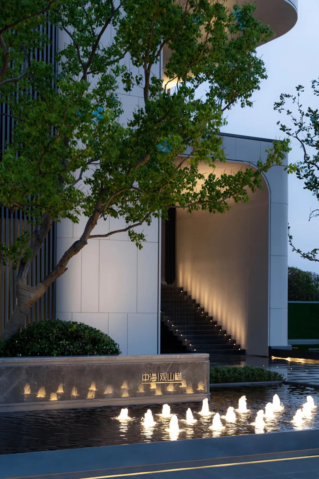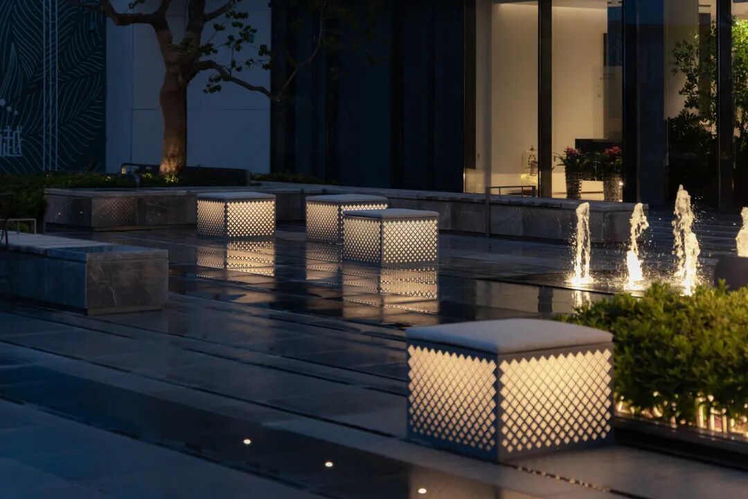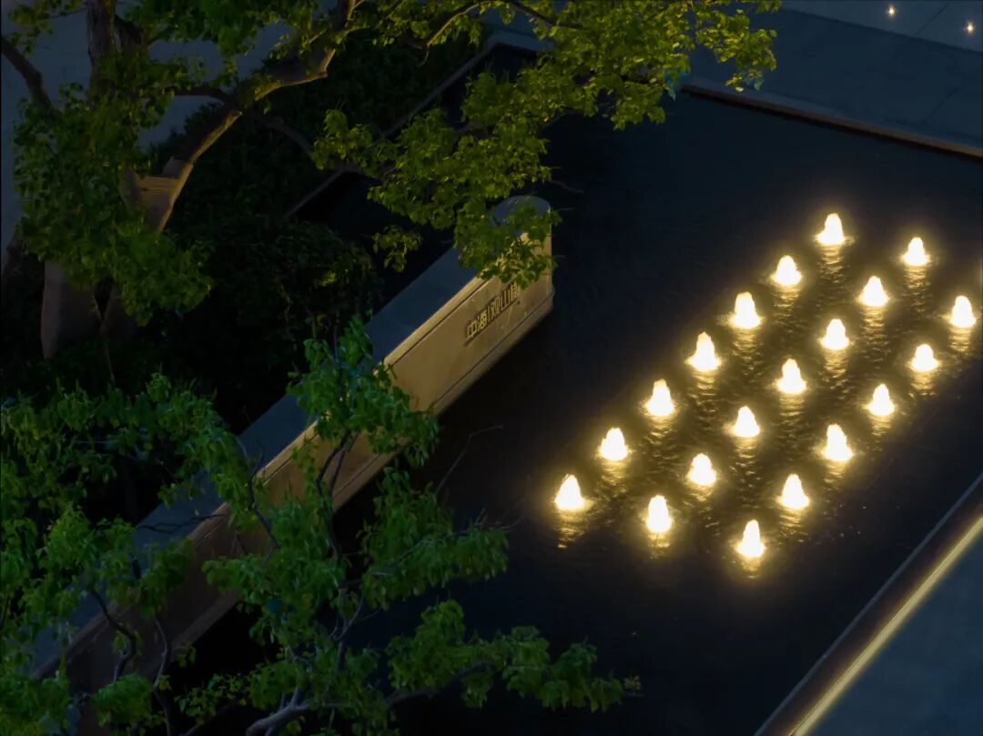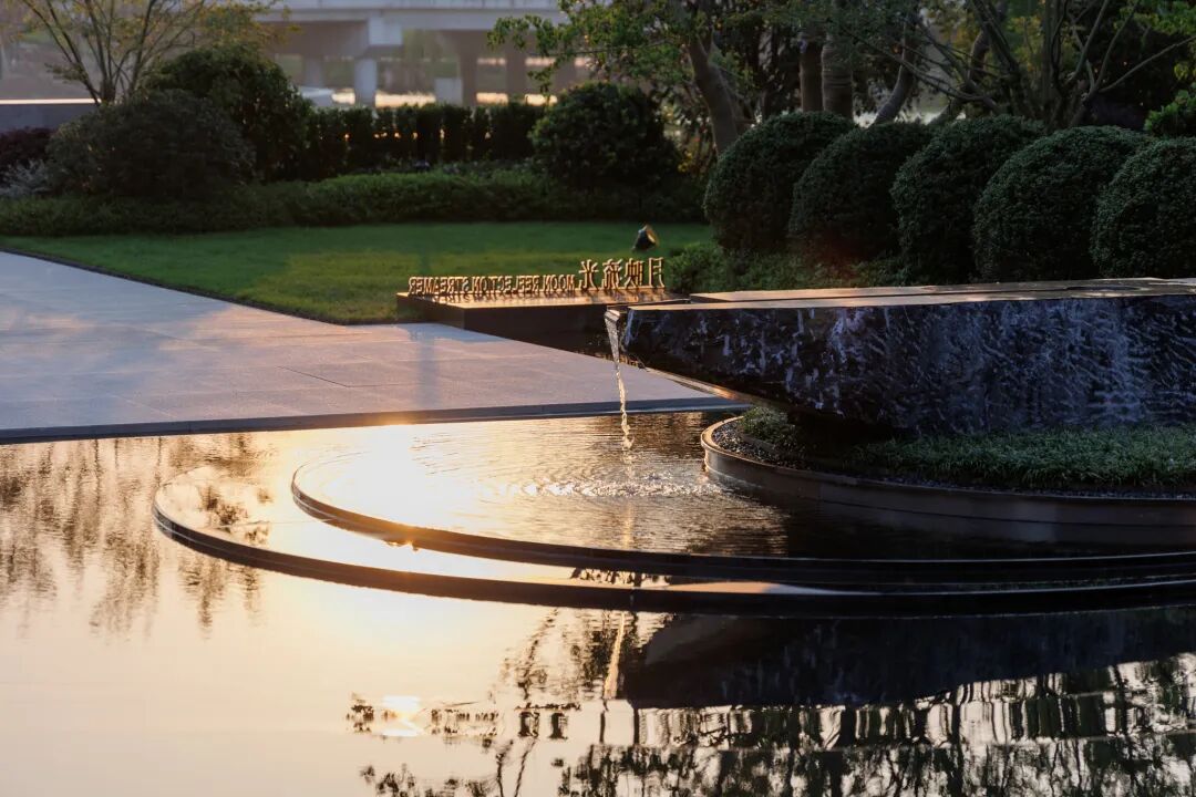 回清倒影,静谧温馨,简约之中透露出品质感。层叠的阶梯赋予了镜水动态的韵律,星光灯与涌泉的阵列彰显了仪式感,与周边自然性的曲线相得益彰。