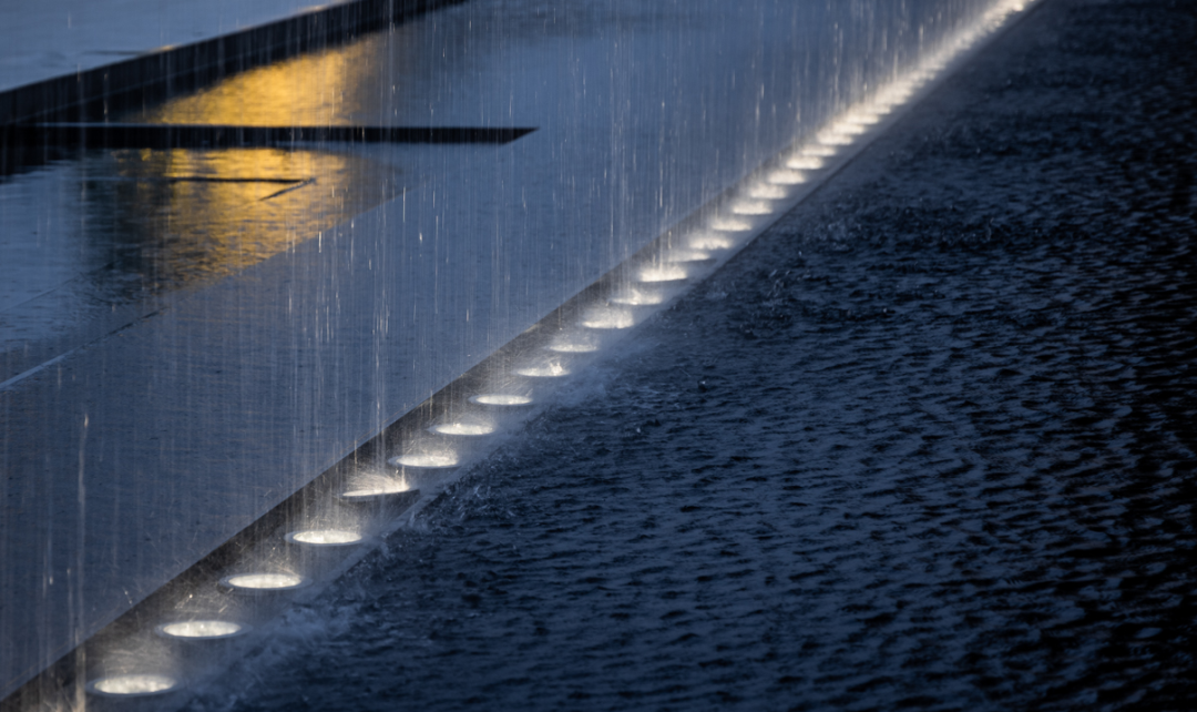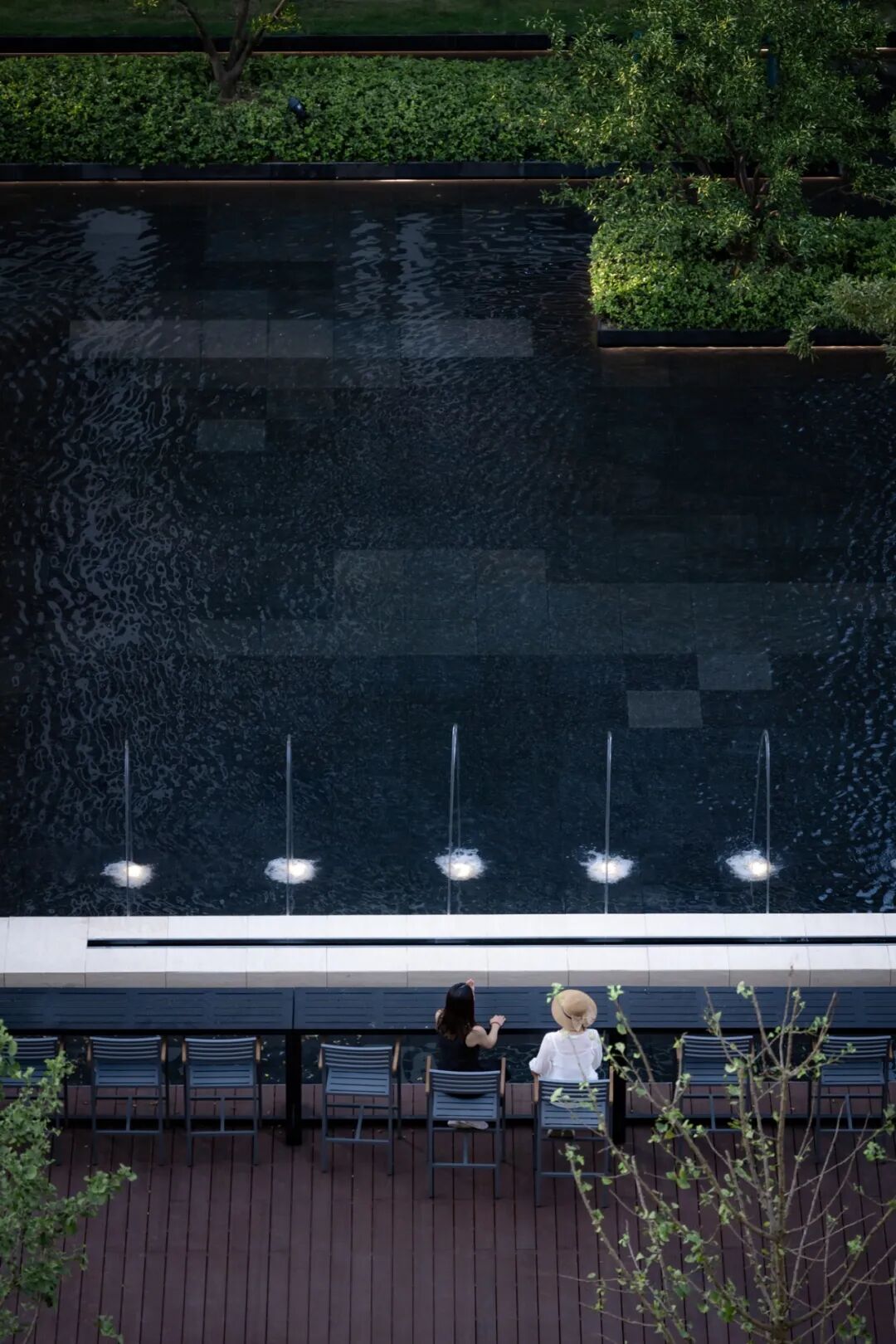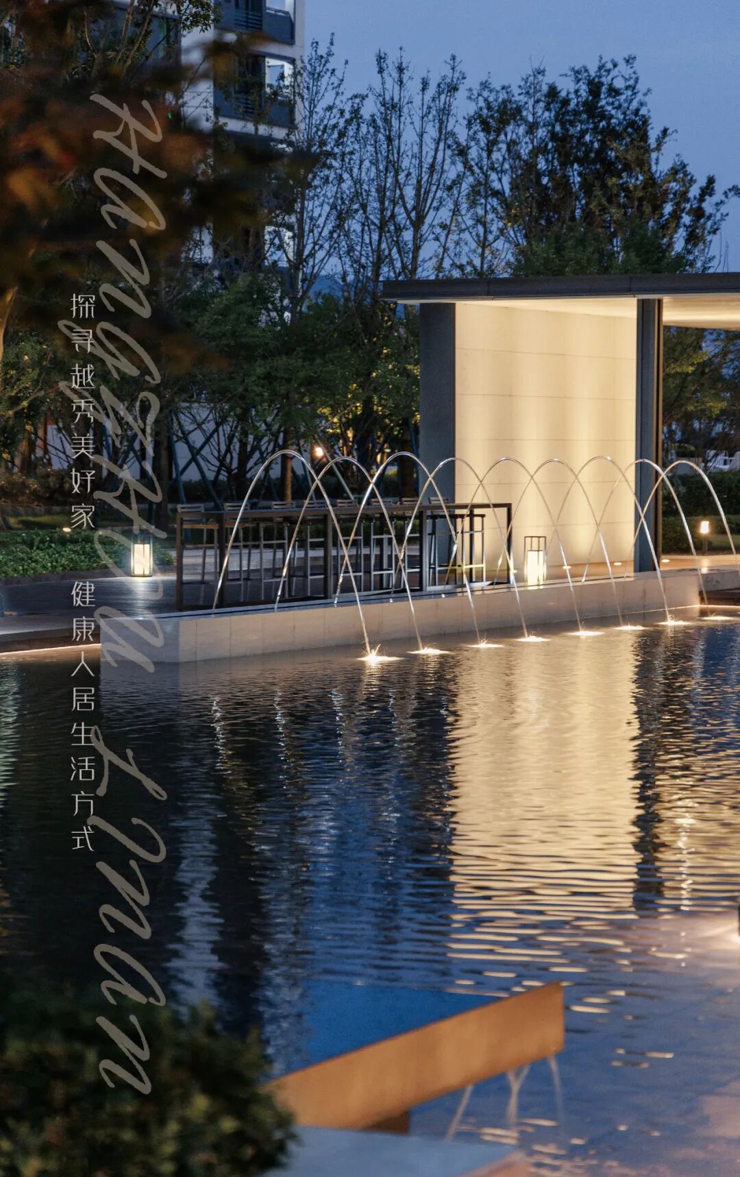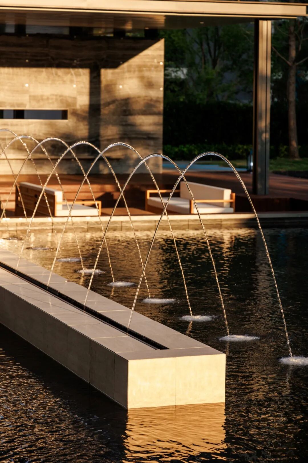 回清倒影,静谧温馨,简约之中透露出品质感。层叠的阶梯赋予了镜水动态的韵律,星光灯与涌泉的阵列彰显了仪式感,与周边自然性的曲线相得益彰。