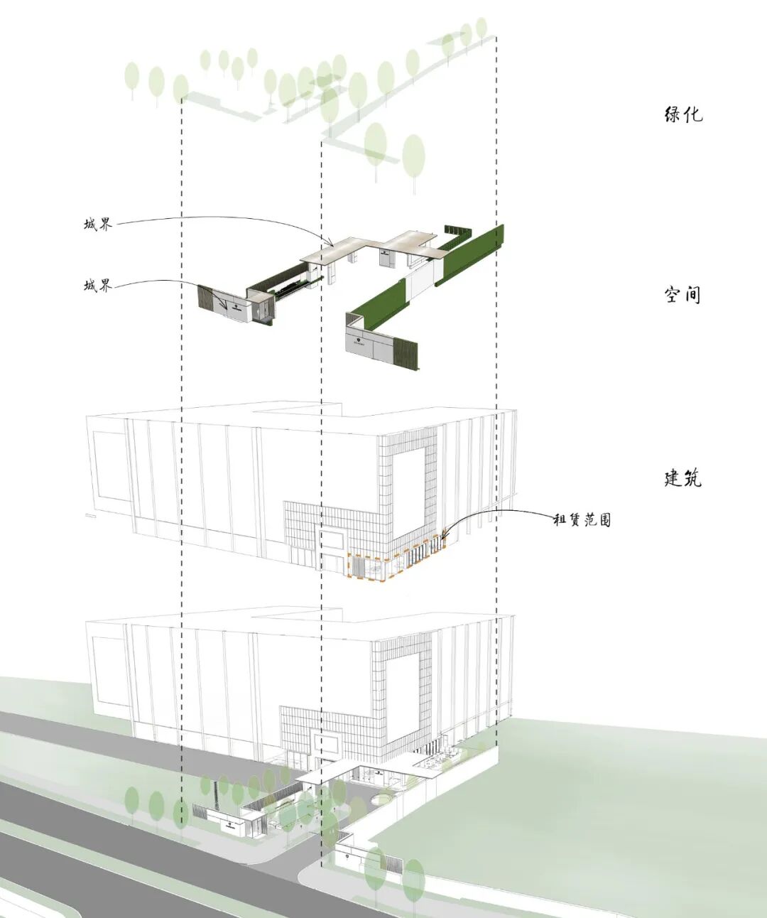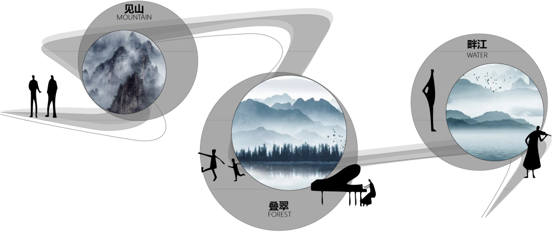 项目北侧紧邻市政道路,有近125M长的市政界面,如何利用市政界面创造城市地标,带动城市活力,是设计首要解决的问题。设计从场地的尺度和特性出发,基于现代艺术的格调,融入对生活的向往,将空间场地作为岳麓山的缩影,通过不同场景的转换,演绎湘江水畔、岳麓山下的艺术生活,创造城市活动体验空间,带动场地人气活力。