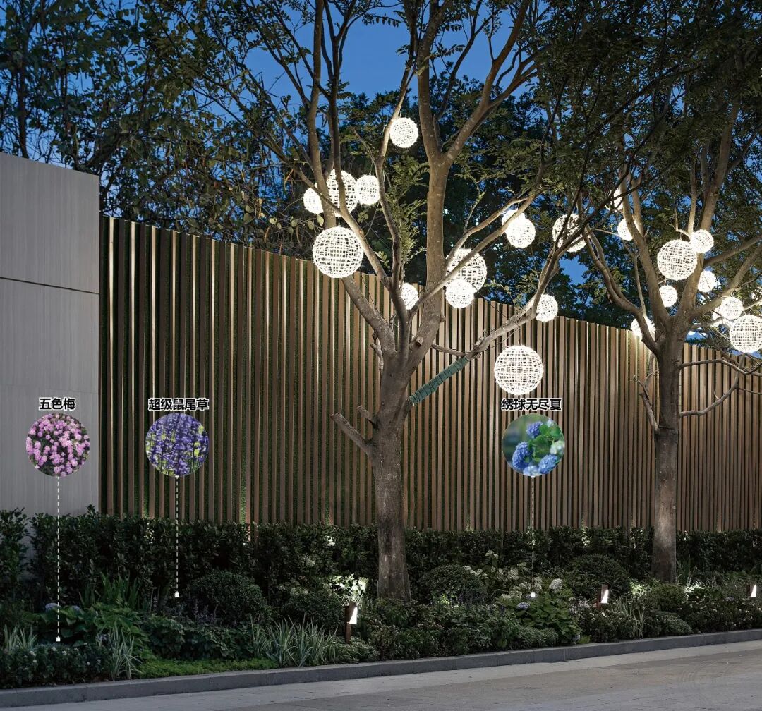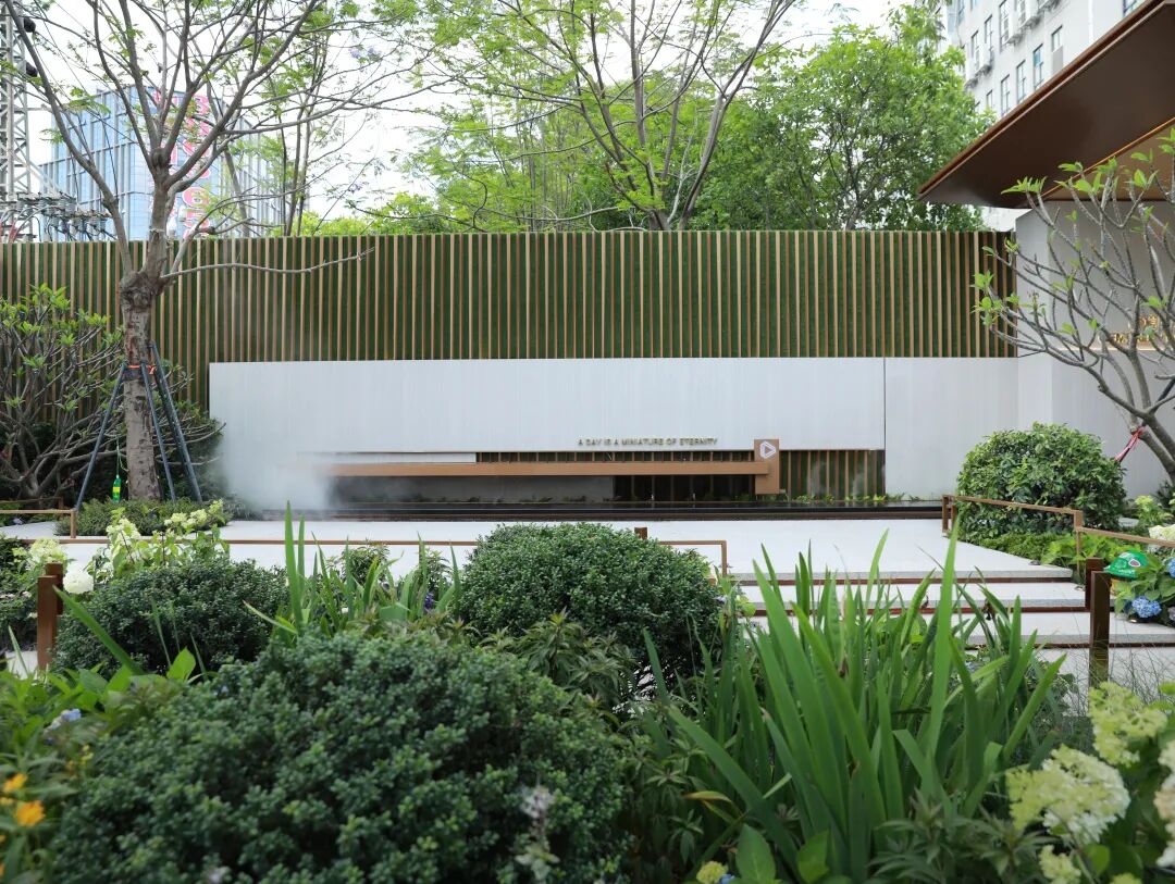项目展示期间,为保证景观体验的完整性,周边围挡会提供完整围合。而在市政公园建成后,临近公园一侧的围挡将被打开,以此实现公园景观对项目的渗透以及对客群的吸引,届时,公园里的组团种植映衬着场地内的花草树木,景致的层次将更为丰富。情绪饱满的氛围景观预示着精奢迷人的艺术生活,也营造着大隐于市的舒适与静谧。