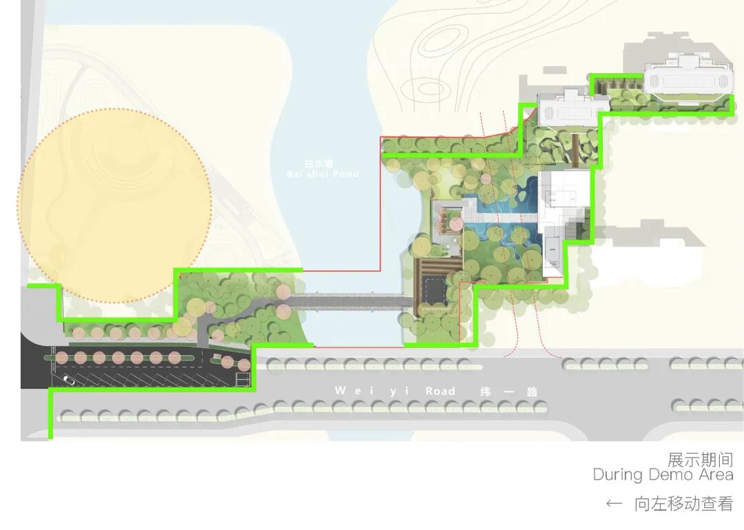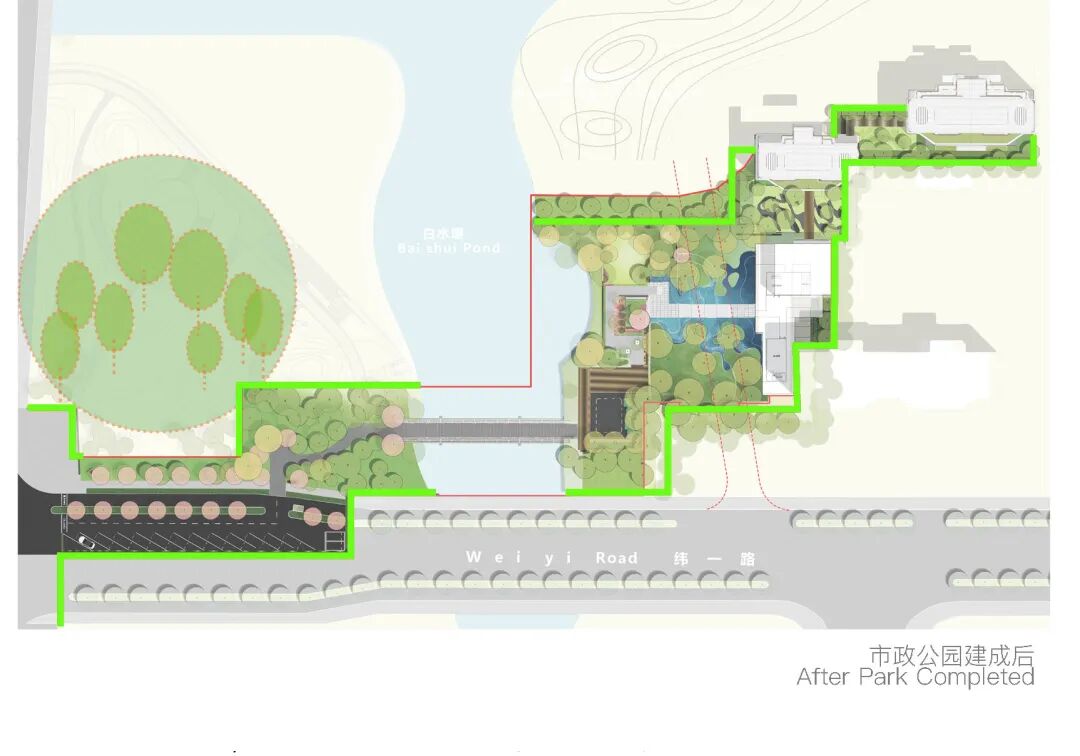 策略一:考虑到方便客户进入示范区内部看房参观,代建公园部分用地,在钟家港河西侧打造沿街停车空间,利用景墙营造入口昭示感;客户从停车场泊车后,搭乘接待车通过景观便桥到达示范区入口。借此,延展示范区空间范围,打造河流两岸“两点一线”跨河景观。