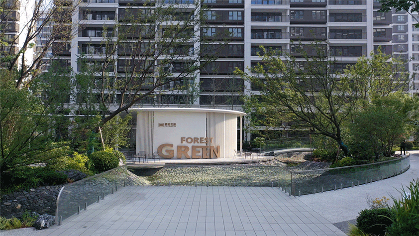 面前,两侧的树适当退让,使售楼处入口完整而开阔地展现于访客的眼前,视线上也更强调了空间的“放”。倚于水边的景石间淌下一股清泉,大气开敞的景观格局间点缀着精致细腻的情感描绘。