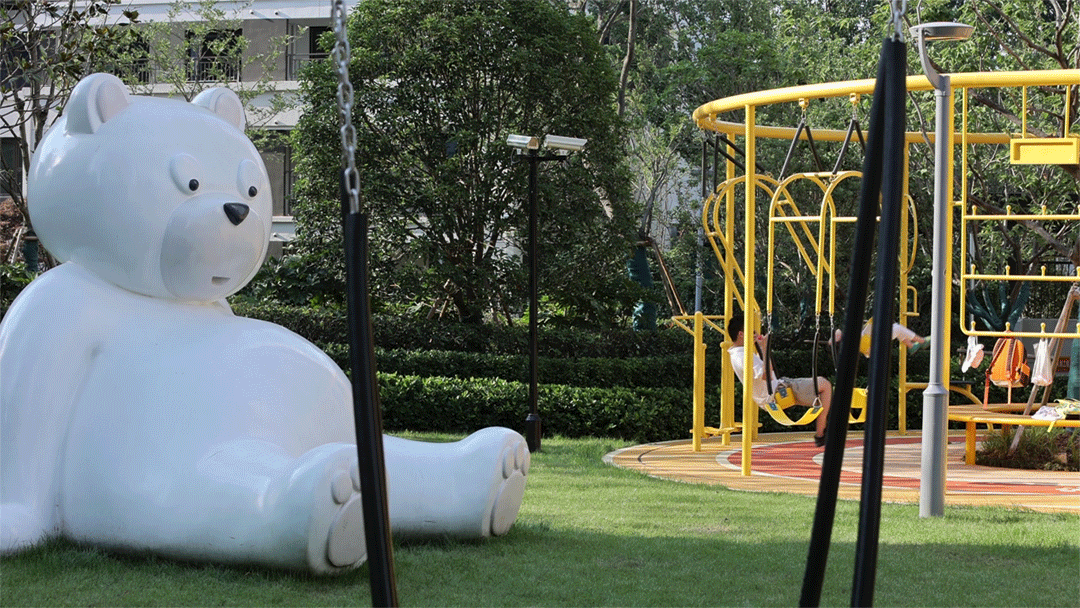 江苏旭辉景观首创落地的S造型全龄环设置有多个游乐与休憩看护空间,小朋友在这里能享受一隅天地,设置的坐凳也同时便于家长的看护与交流。亲子秋千和健身模块的植入让家长们由儿童游戏的旁观者变为参与者和互动者。家长的参与也促进了家庭间的相互交流,洗手台、挂衣架,多样化的人性化细节给到孩子更多关怀,形成一个充满了活力和能量的全龄社交环。