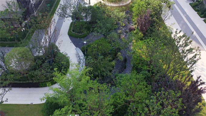 穿过球场,郁郁葱葱、自然生态的雨水花园出现在我们眼前。雨水花园植物葱郁而富有生命力,是一个回归最本质状态的理想之地,让人们以现代生活方式栖息于自然花园的怀抱中。
