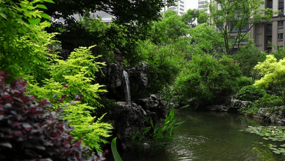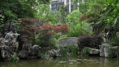 宁谧的镜池与汩汩的涌泉相映成趣,动静之间丰富了视觉。水、石、绿的有机结合,让“烟雨江森”的理念在此得到精致的呈现。闲适怡然之中,人们从城市的喧哗中抽离,沉浸在缓慢宁静的时光里。