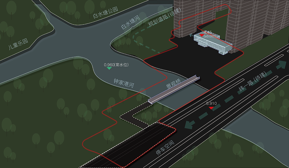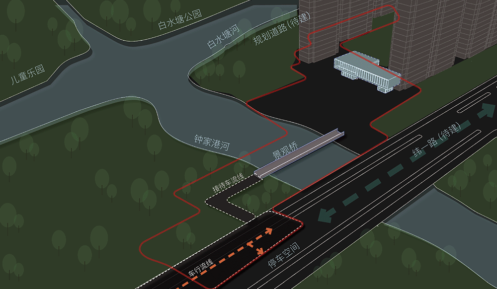 廊桥的设计,不仅延展了示范区的空间范围,还串联了两岸的景致,丰富了整体氛围,共同打造了河流两岸“两点一线”跨河景观。