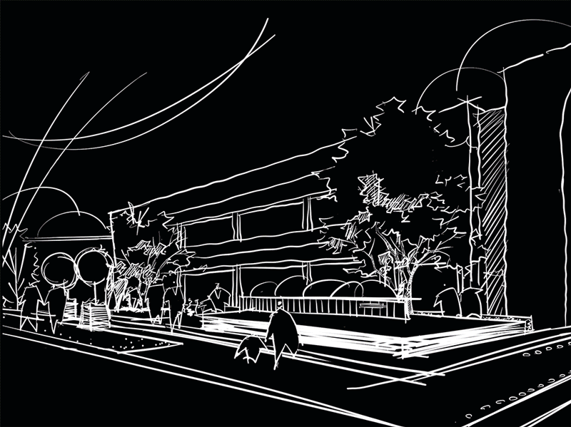 项目北侧紧邻市政道路,有近125M长的市政界面,如何利用市政界面创造城市地标,带动城市活力,是设计首要解决的问题。设计从场地的尺度和特性出发,基于现代艺术的格调,融入对生活的向往,将空间场地作为岳麓山的缩影,通过不同场景的转换,演绎湘江水畔、岳麓山下的艺术生活,创造城市活动体验空间,带动场地人气活力。