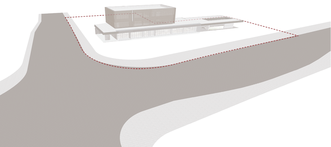 建筑前场作为城市展示空间,通过“见山(昭示街角——见山近景)、叠翠(大地艺术界面——寻林入境)、畔江(前场仪式水景——畔水入园)”的三进空间布局,并结合竖向的层层递进,营造一个可居可赏的沉浸式半山秘境。