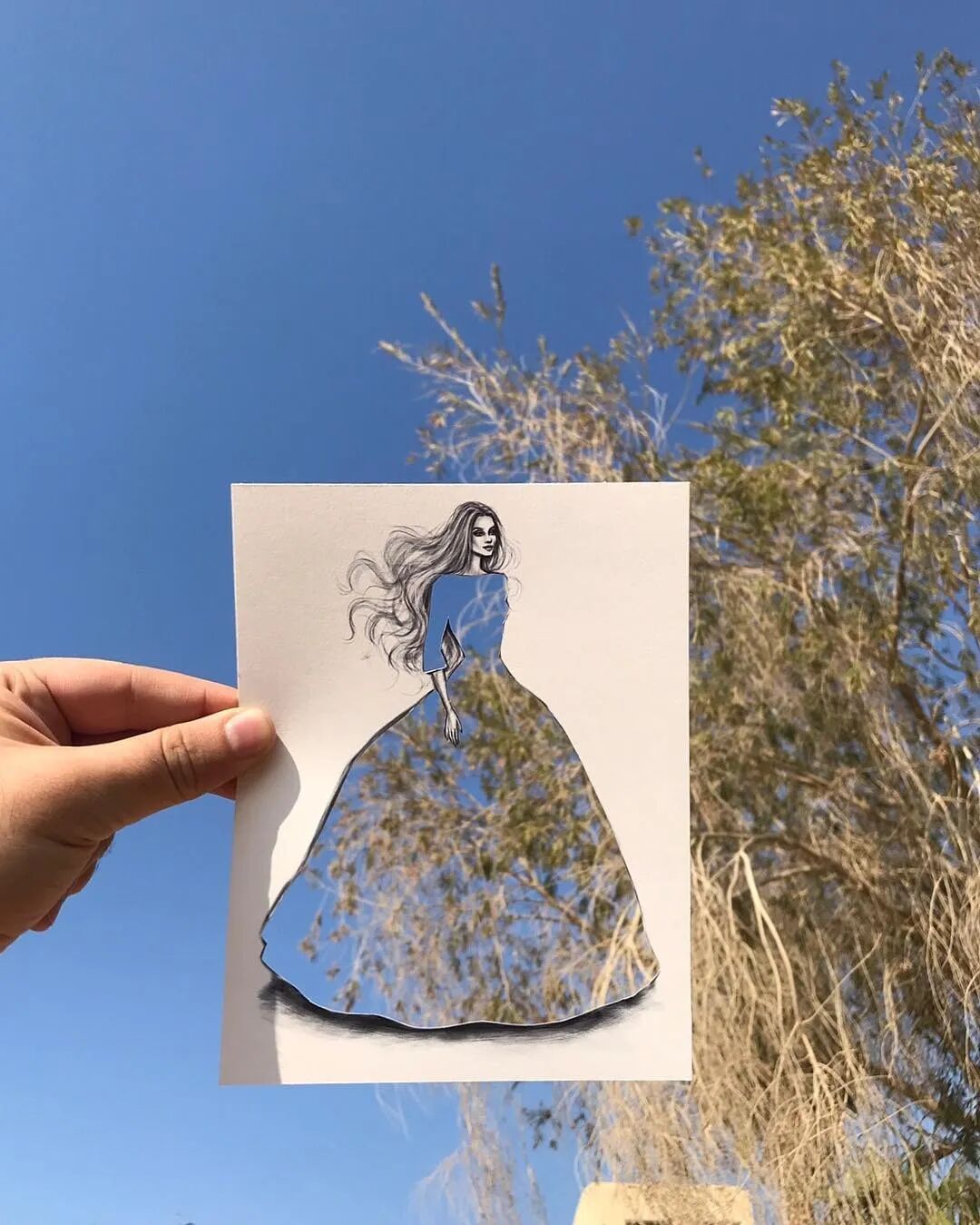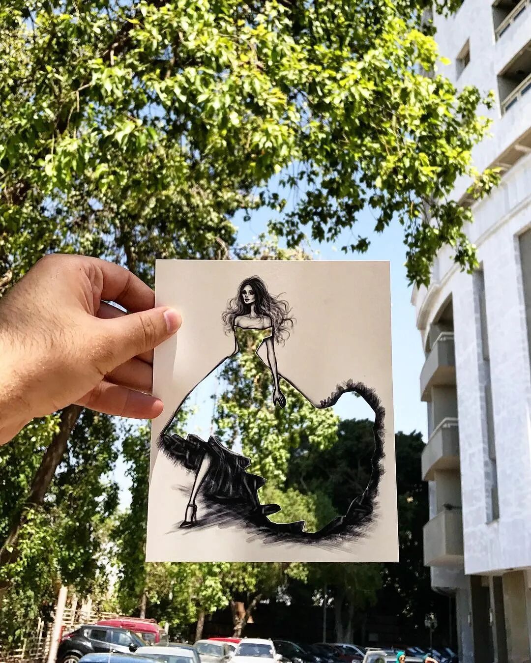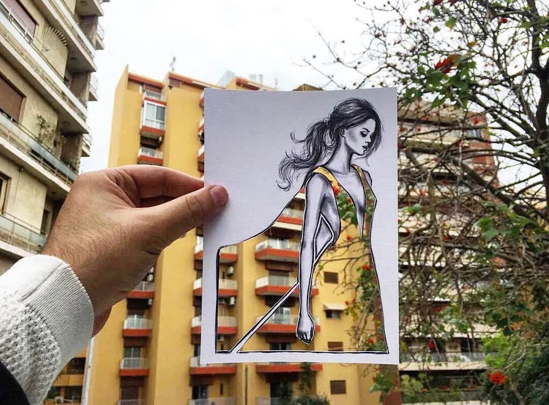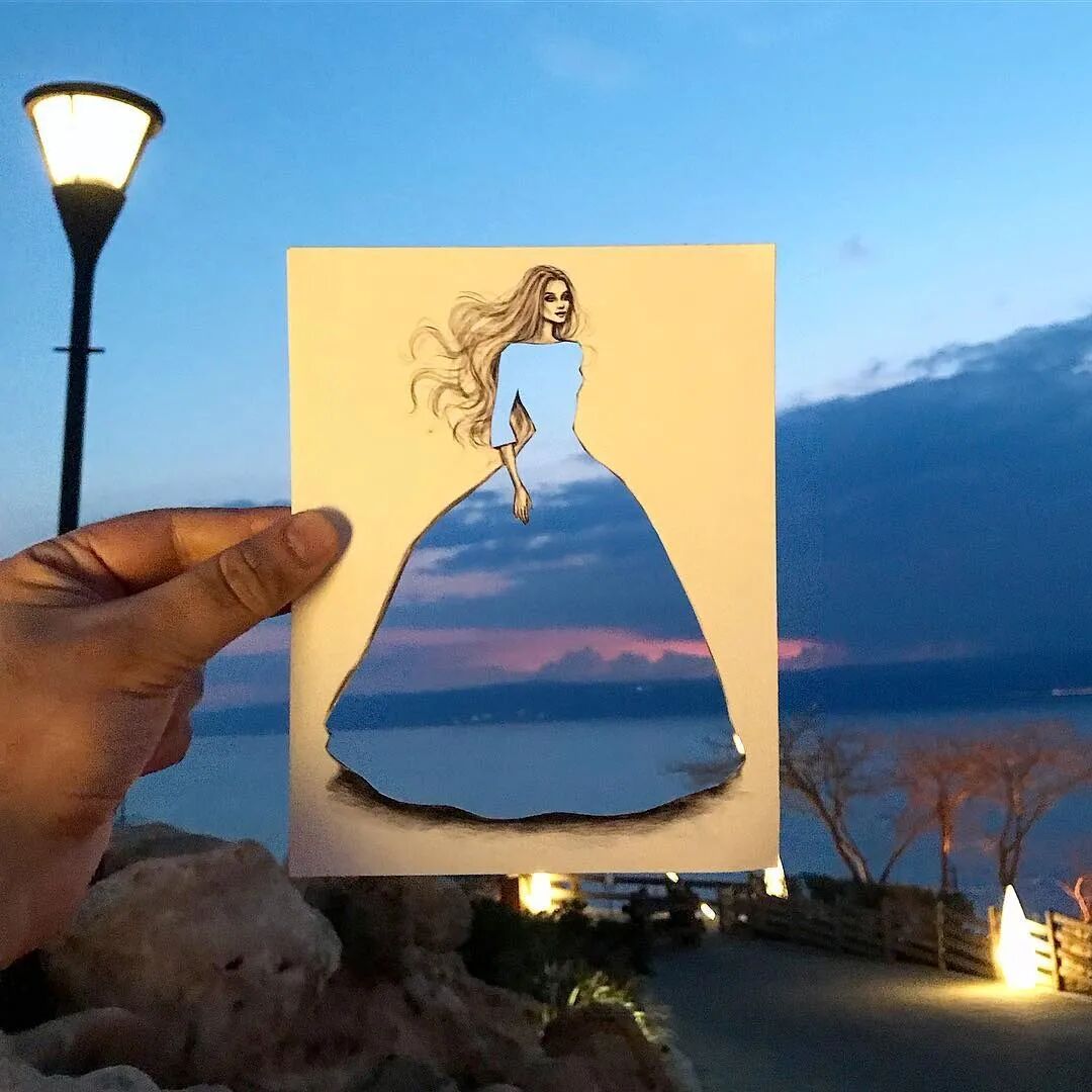 从城市景观到夕阳晚霞,从高速公路到盛开的树木,每一个场景都是纸面涂鸦与现实的面料相结合。沙梅赫·布卢维最新的环境换装插画吸引了很多人的关注,不得不说,这位艺术家融合了建筑师和插画师的才华,在几幅普通的城市景观前,运用镂空插画,创造出了让人意想不到的神奇画面。